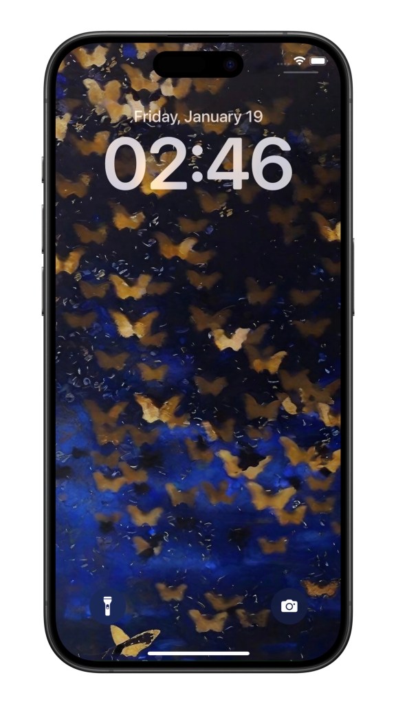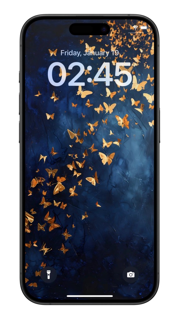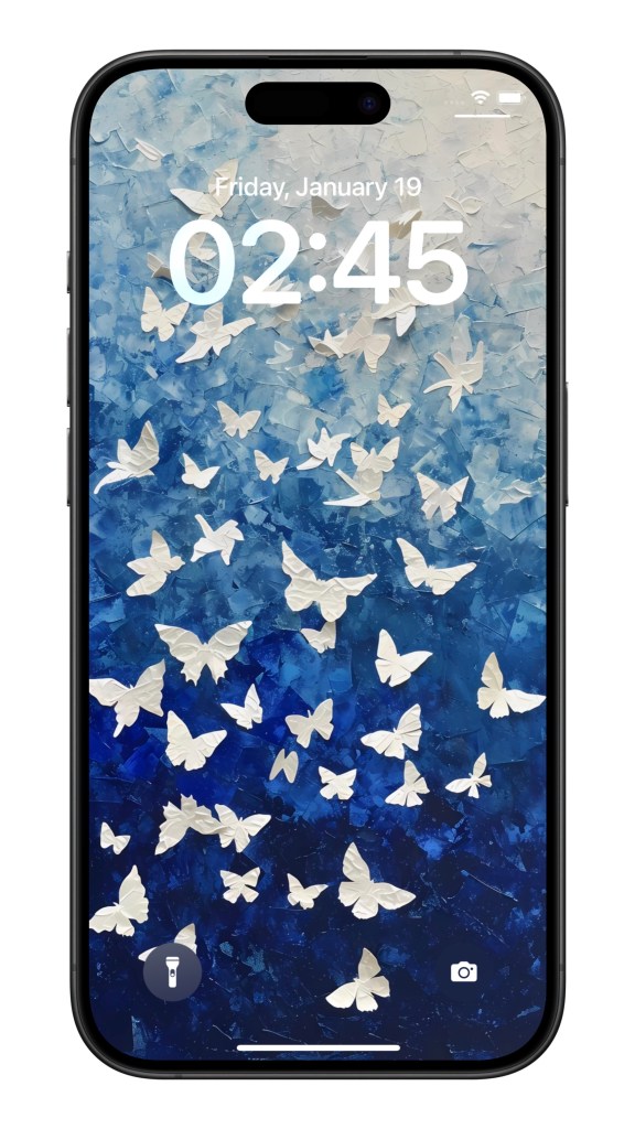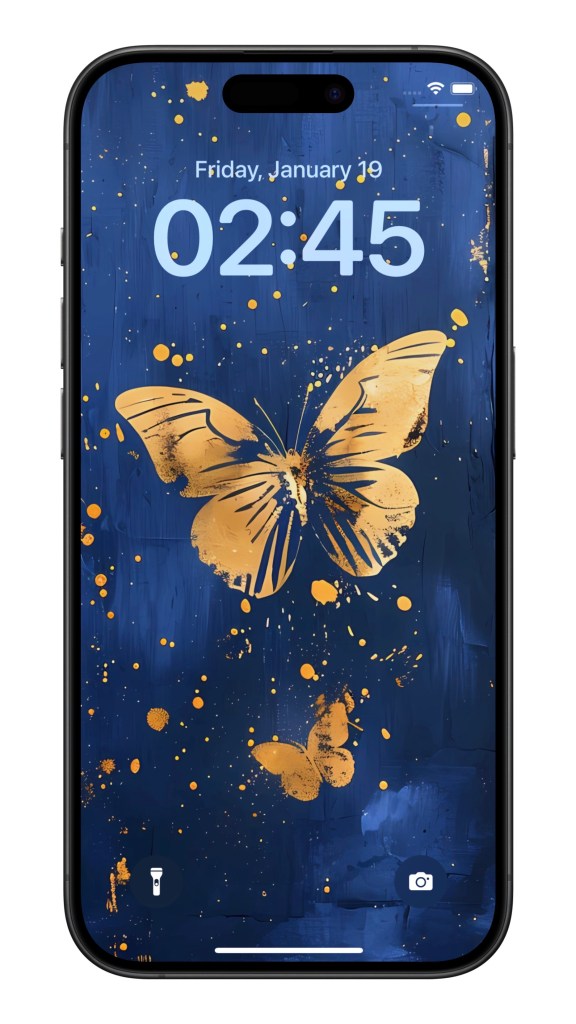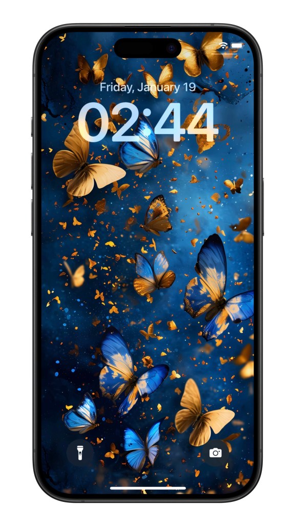 Under this dream-like blue sky, butterflies flutter as if performing a silent cosmic ballet. Under the dark blue and gold night sky, flocks of butterflies dance against a starry background.