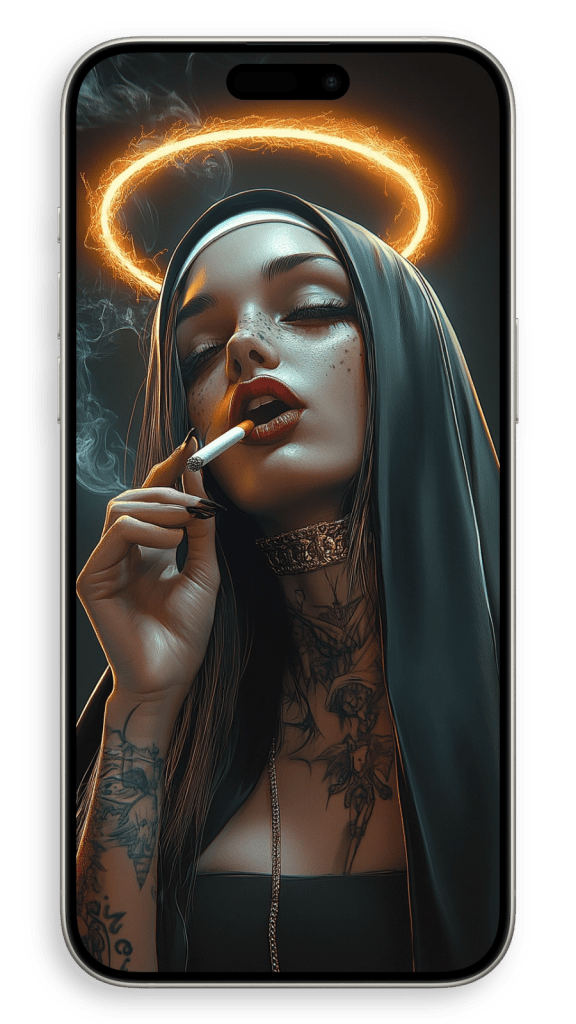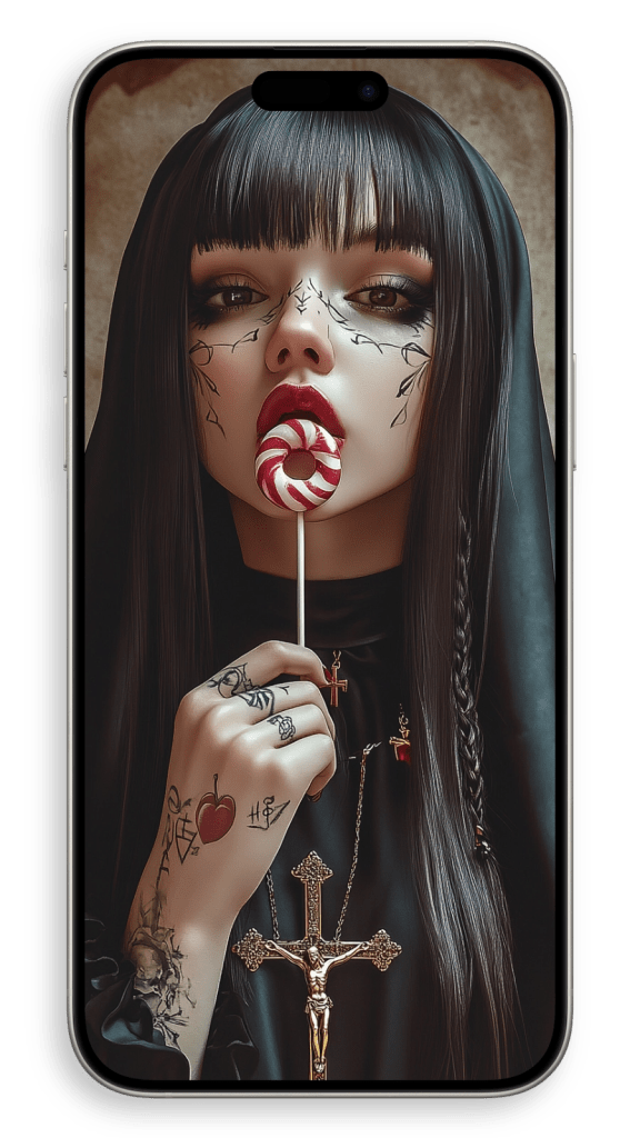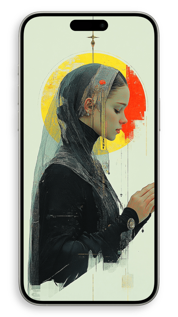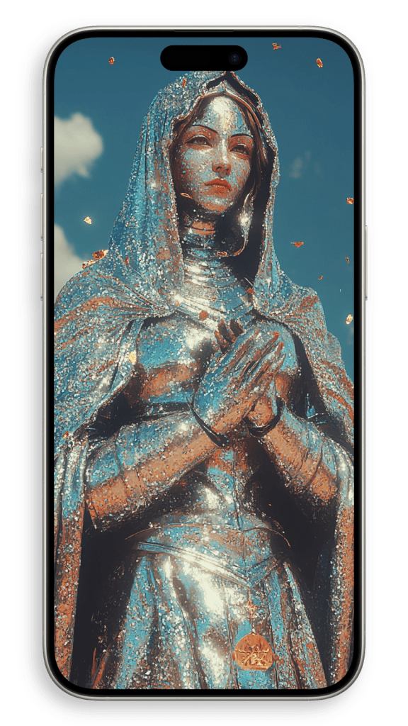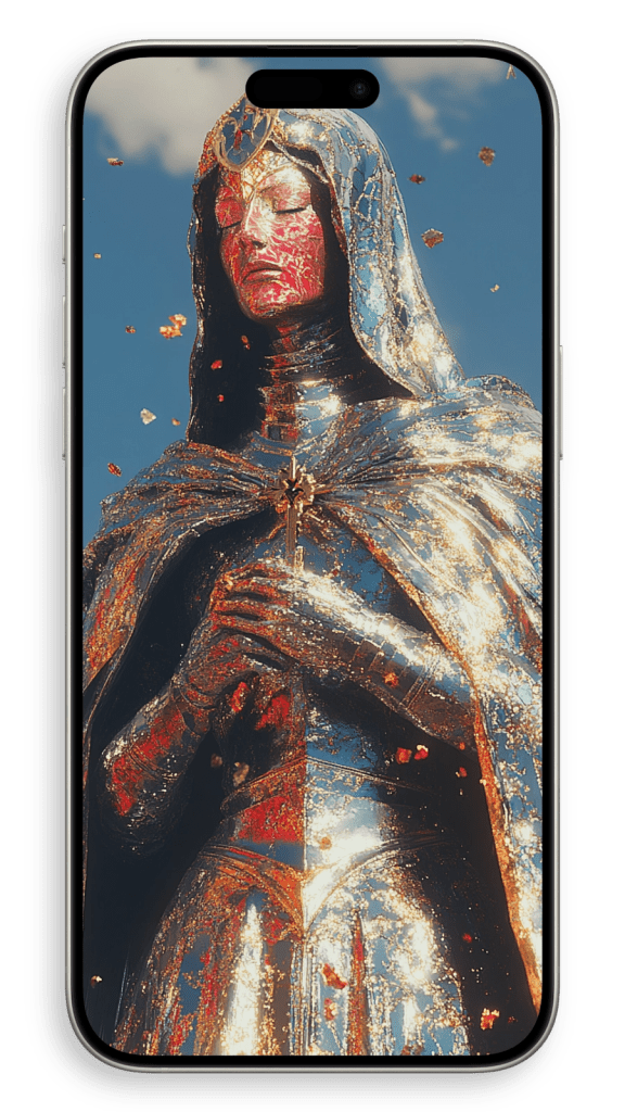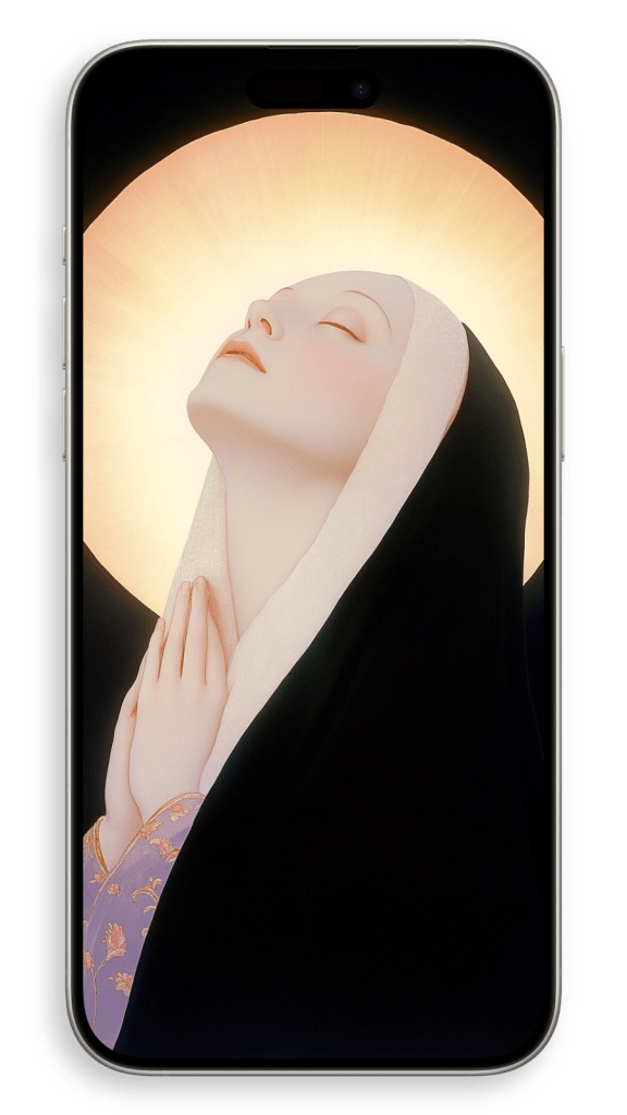 In a beautiful setting, perhaps in a dimly lit chapel or a serene garden, she appears surrounded by warm light, as if touched by a heavenly glow. The subtle details of her robes and the gentle curves of her face convey both strength and serenity, embodying a life of quiet faith and dedication. There’s a timeless beauty in her humility, an aura of grace that seems to transcend the earthly world, making her not just a figure of religious devotion but a symbol of inner peace and spiritual harmony.