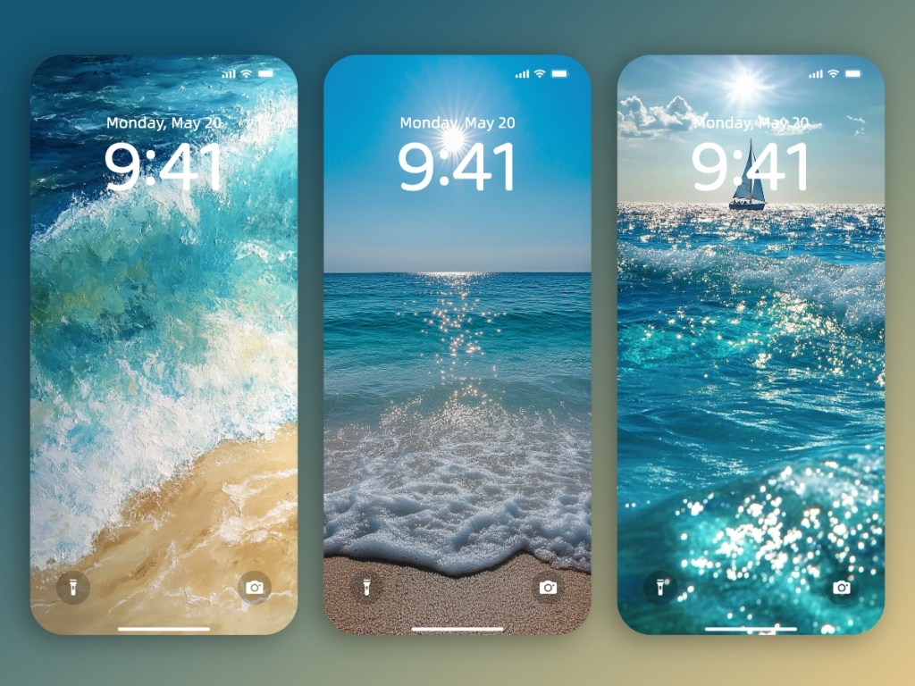 Artistic interpretations could highlight abstract patterns created by the waves, with light reflecting in various angles, adding to the ethereal quality. This style evokes a sense of calm and wonder, perfect for wallpapers, prints, or any artistic display that seeks to celebrate the beauty of the ocean in a glittering, aesthetic manner.