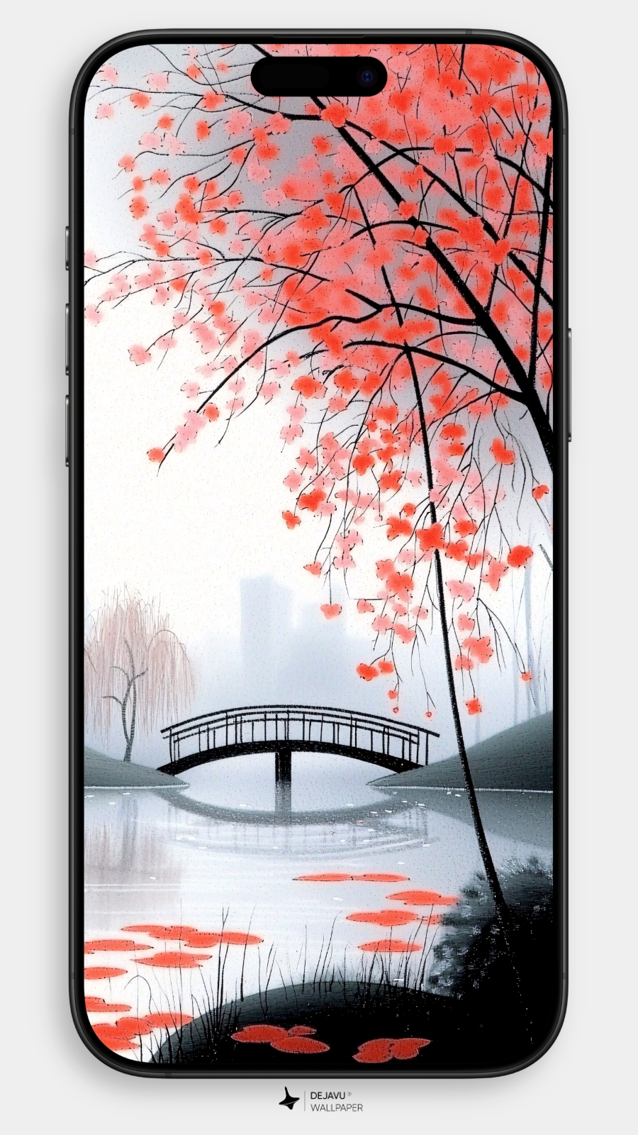 At the edge of spring, a wooden bridge stretches across a quiet river, surrounded by a flurry of cherry blossoms. The petals drift down like pink snow, landing on the water’s surface alongside scattered red leaves.