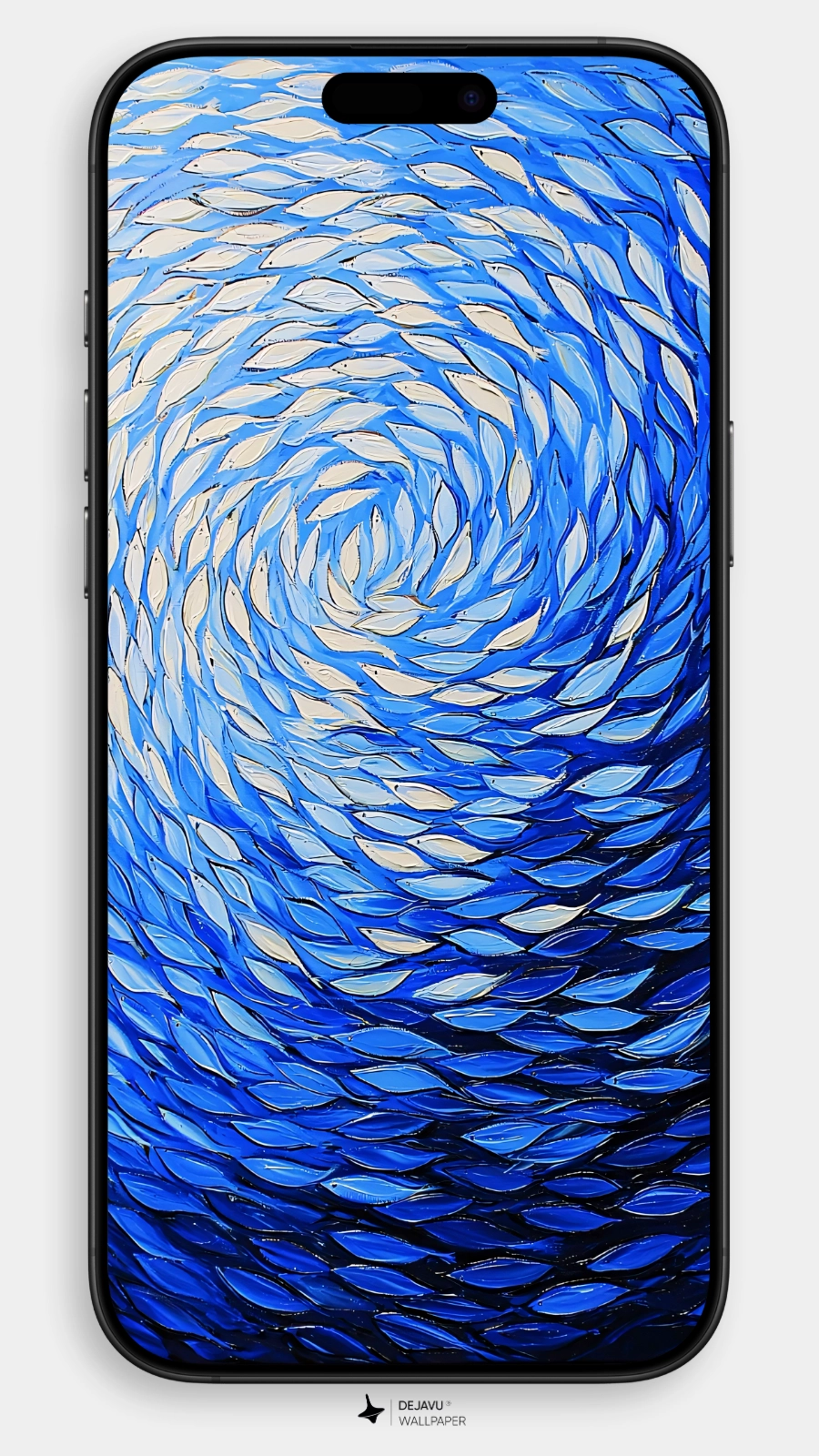 In this surreal ocean, there’s no salt or splash—just soft gradients of blue, waves drawn with dots and lines, and swirling spirals of motion. These fish aren’t just fish anymore—they’re brushstroke spirits, flowing units of visual consciousness, swimming across the sea of your subconscious.