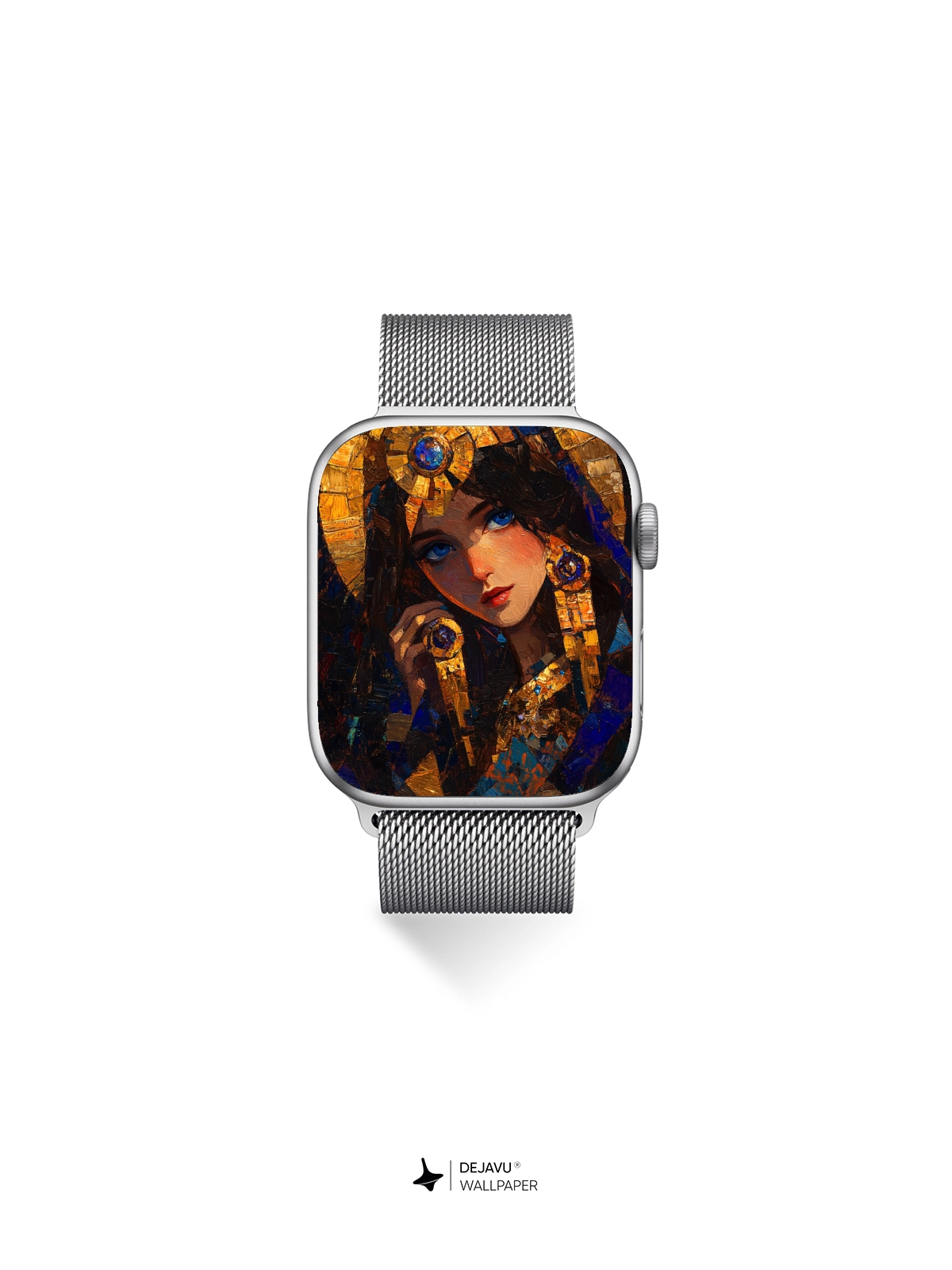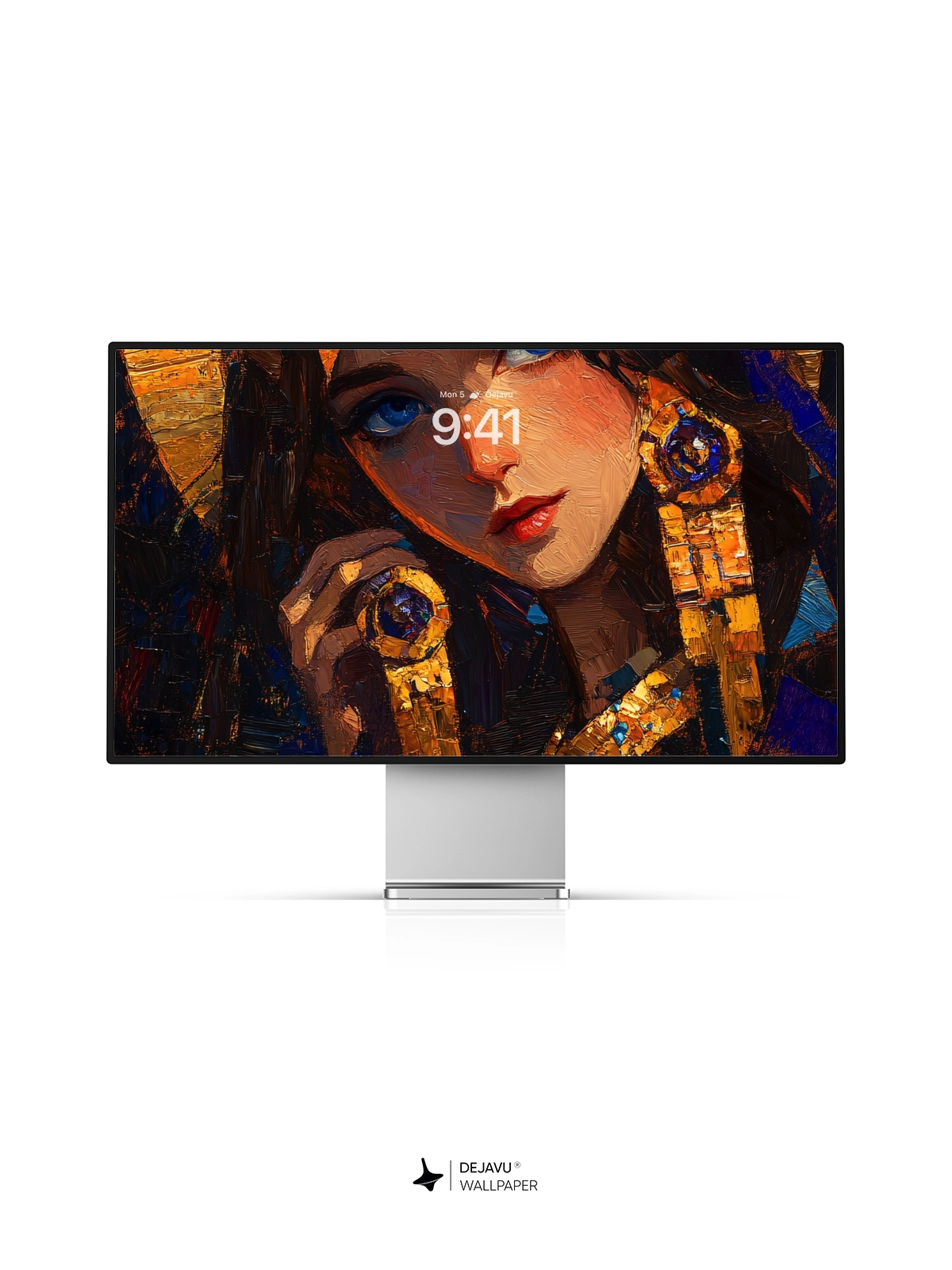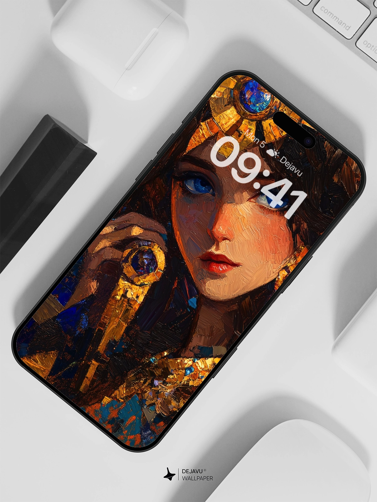 This 8K wallpaper showcases an abstract representation of an Egyptian goddess, adorned with intricate gold and blue jewelry. The rich colors and detailed design evoke a sense of ancient mystique and elegance, making it a perfect choice for enhancing the aesthetic of your iPhone or Android device.