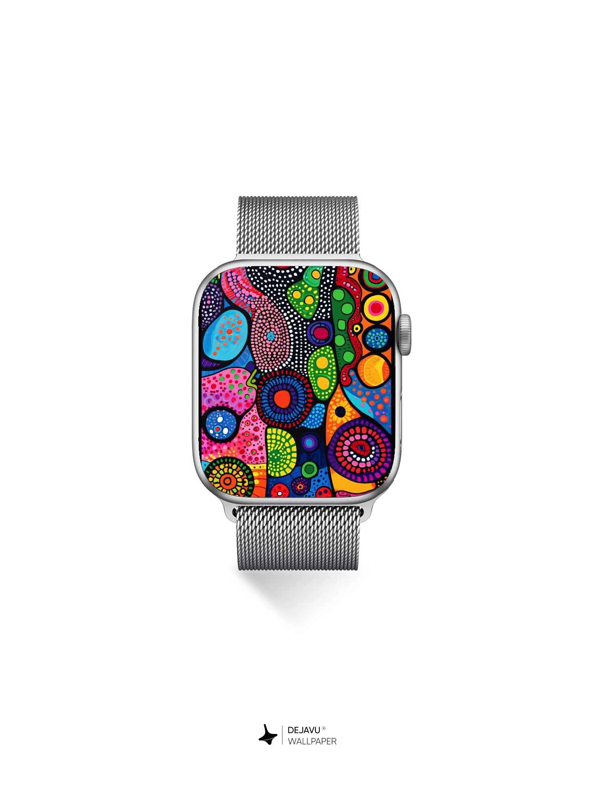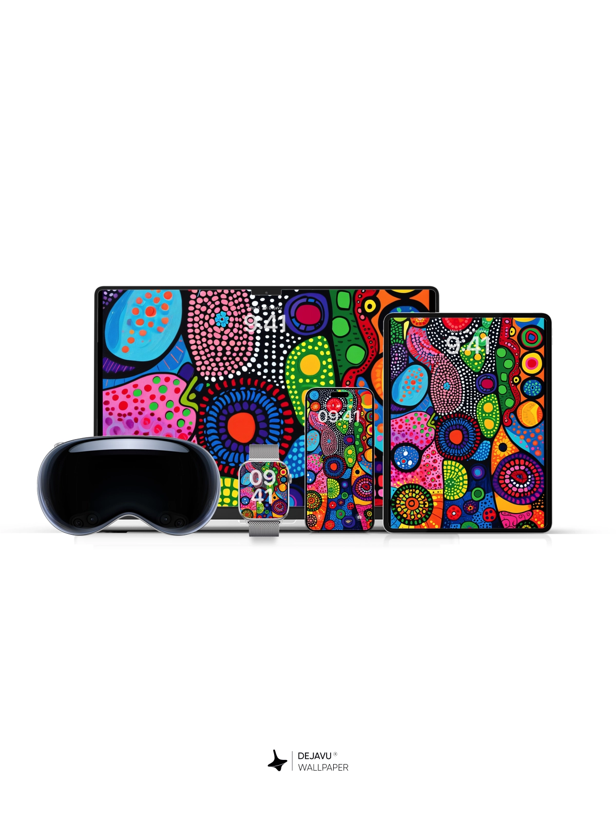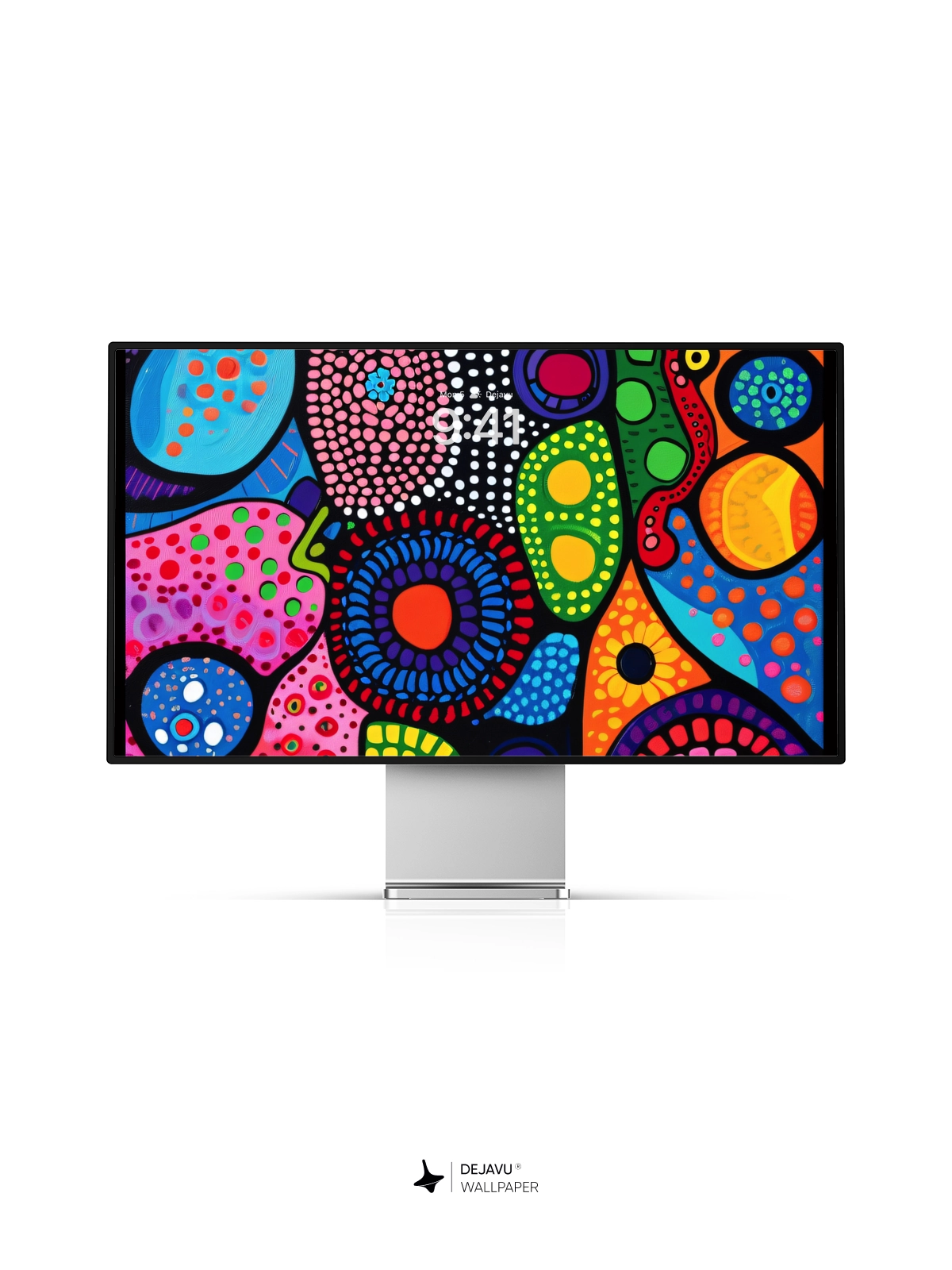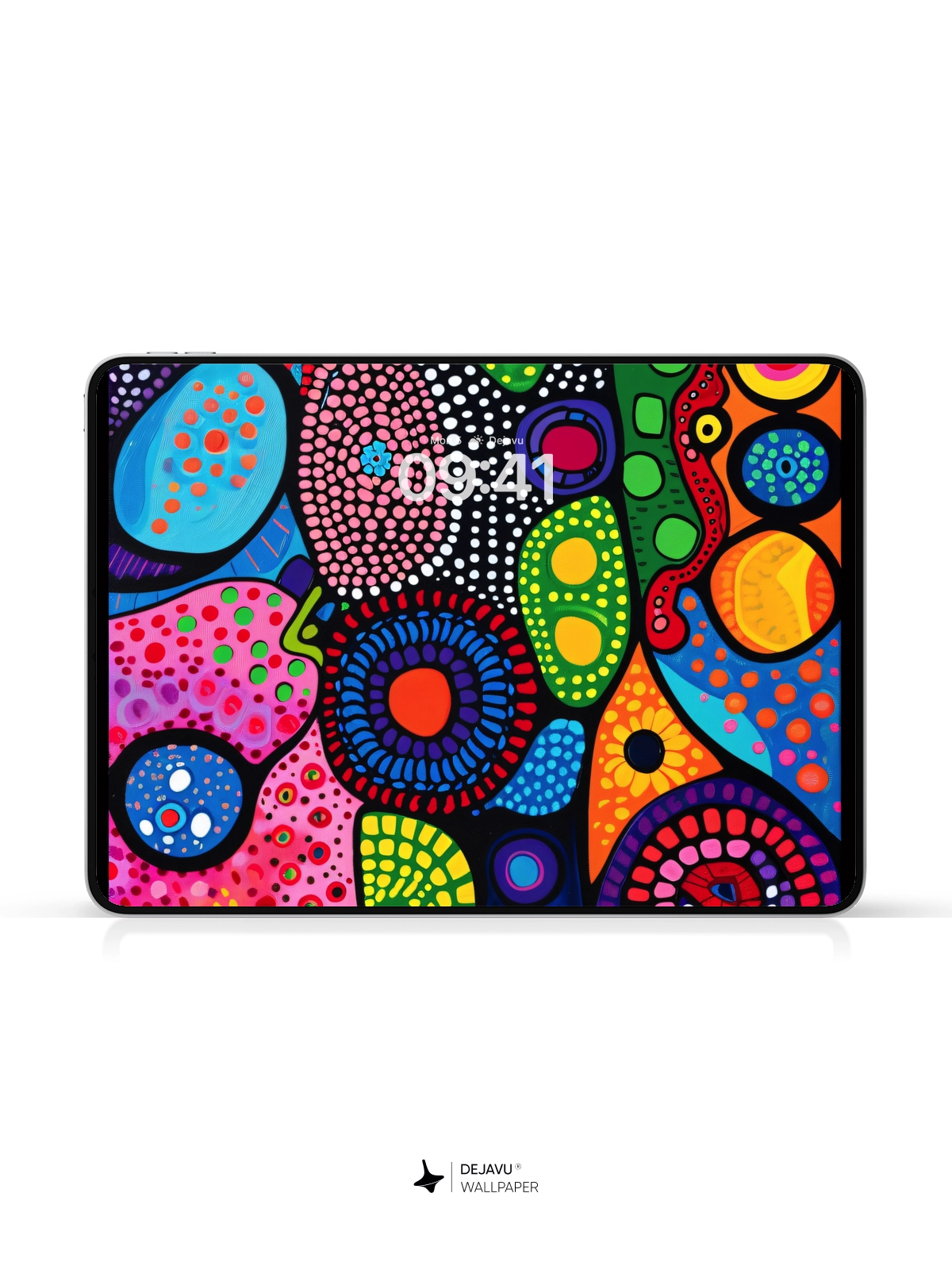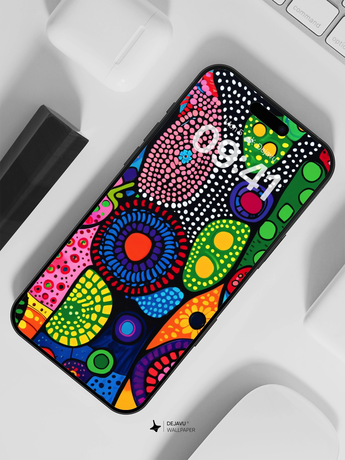 This 8K abstract wallpaper showcases a mesmerizing array of vibrant circles and dots in a psychedelic pattern. The bold colors and intricate designs create a visually captivating experience. Ideal for tech users who want to add a touch of uniqueness and vibrancy to their iPhone, Android, or tablet screens.