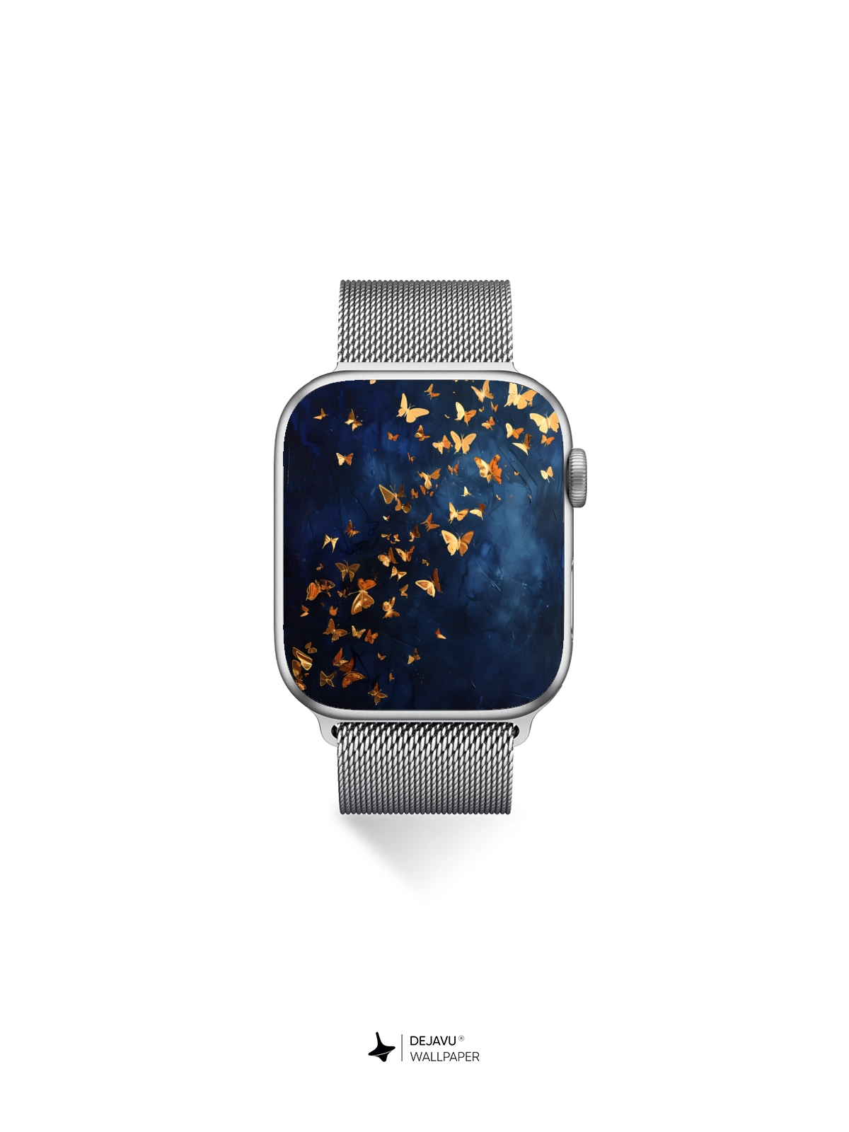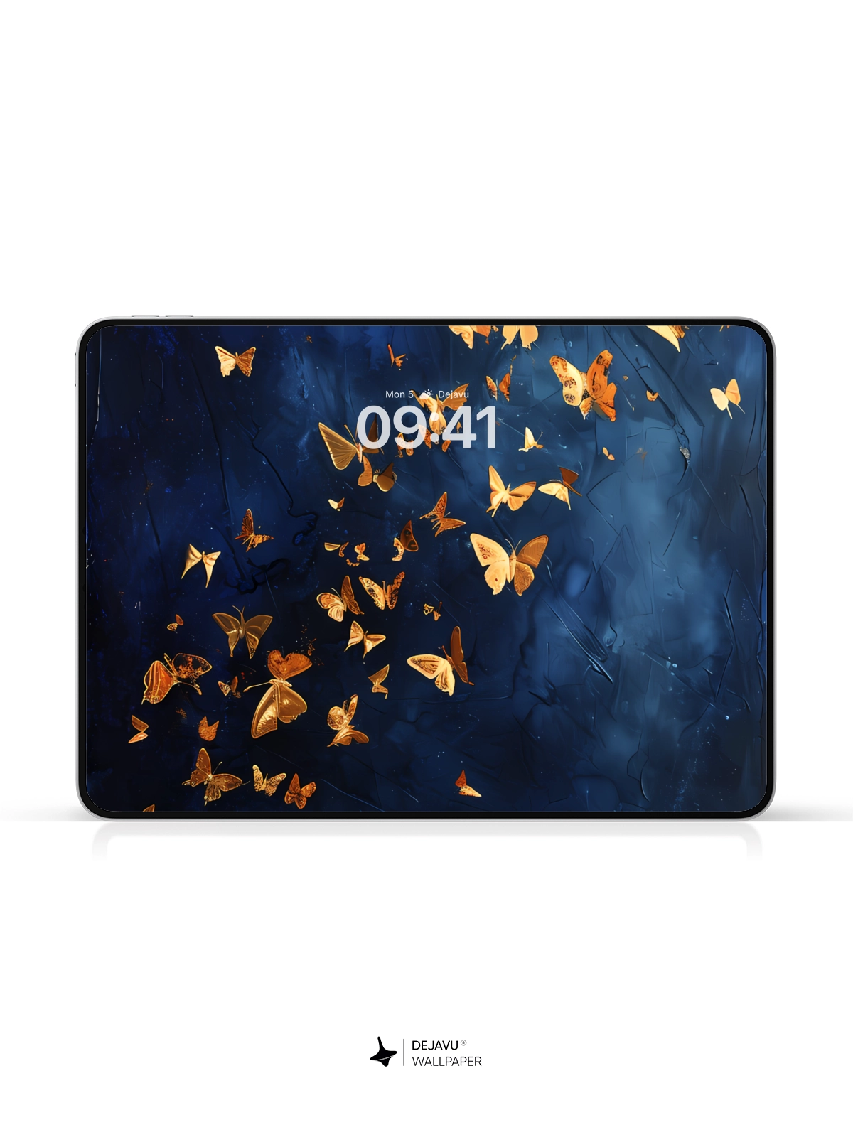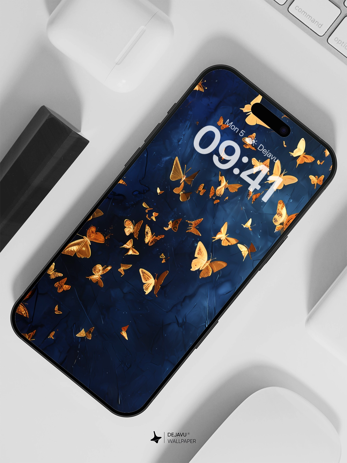 This 8K wallpaper captures the ethereal beauty of golden butterflies soaring through a deep blue, textured sky. The minimalistic design and vibrant contrast create a captivating visual experience. Ideal for enhancing the aesthetic of your iPhone or Android device with a touch of elegance and mystery.
