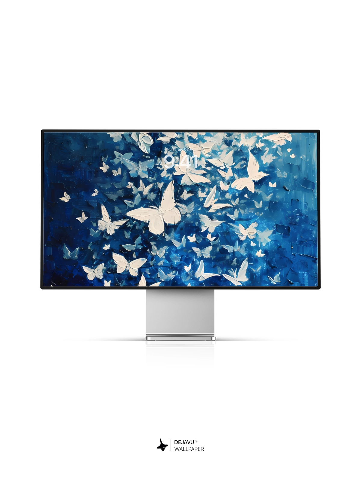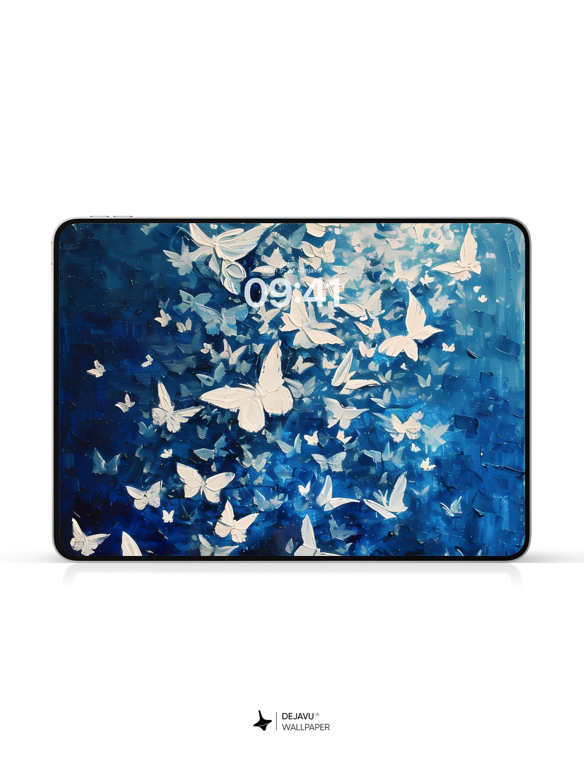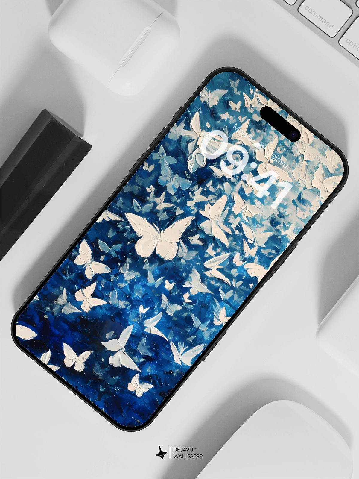 Experience the serene beauty of this 8K abstract painting featuring white butterflies soaring against a deep blue backdrop. This minimalistic artwork captures the essence of tranquility and freedom, making it an ideal wallpaper for your iPhone or Android device. The soft gradient and detailed brushstrokes add depth and texture, enhancing the overall aesthetic appeal.