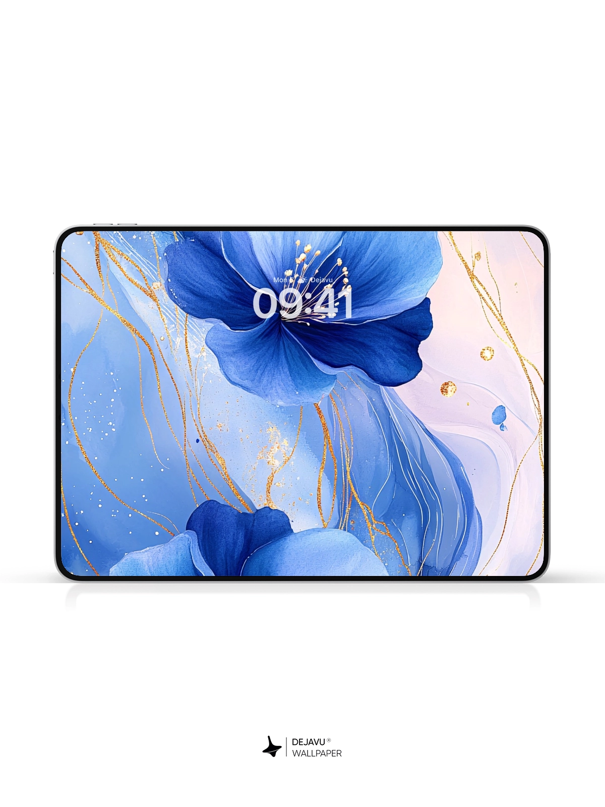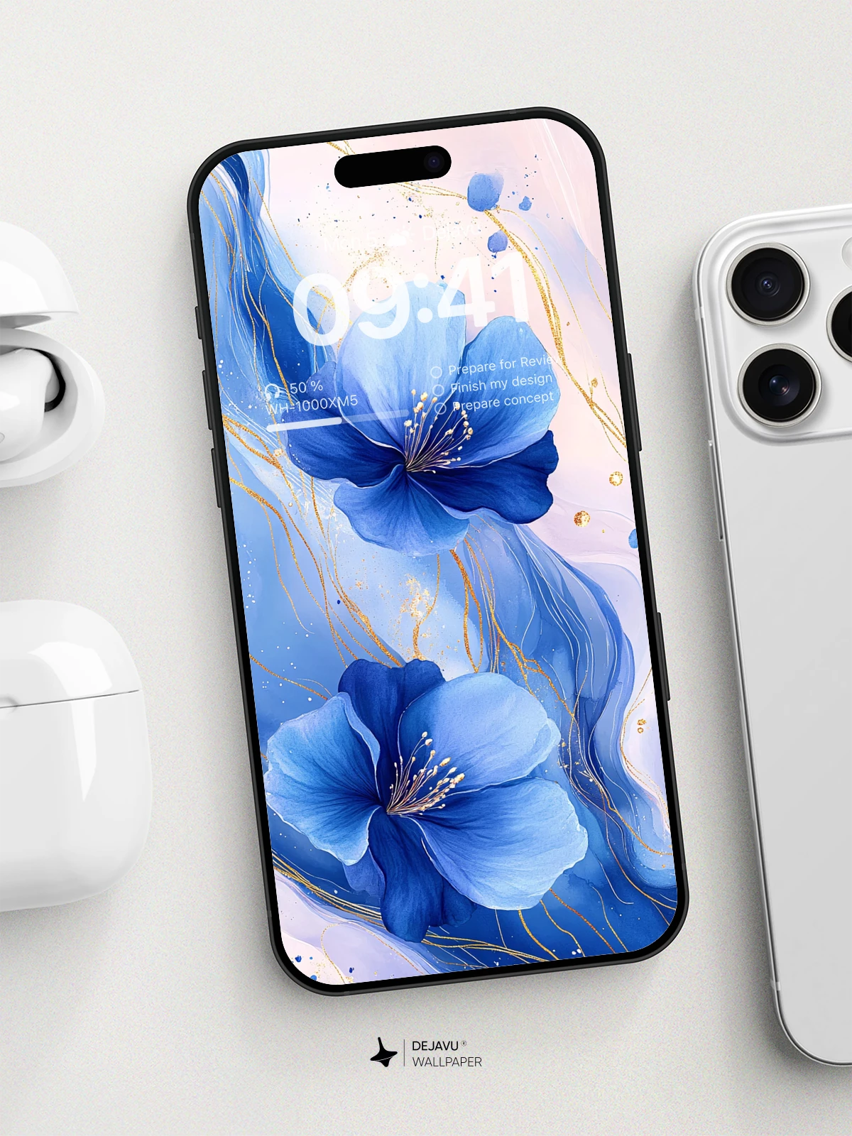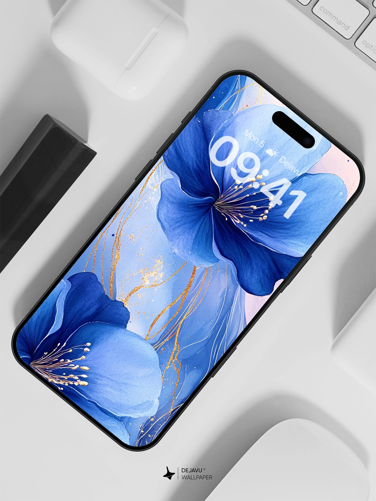 This 8K wallpaper features a stunning abstract design of blue flowers with delicate gold accents, creating a luxurious and minimal aesthetic. Perfect for enhancing the look of your iPhone or Android device, this wallpaper brings a touch of elegance and sophistication to your screen.