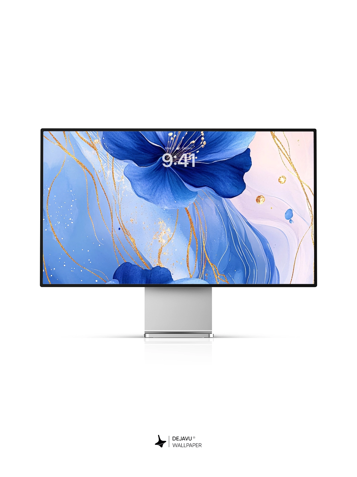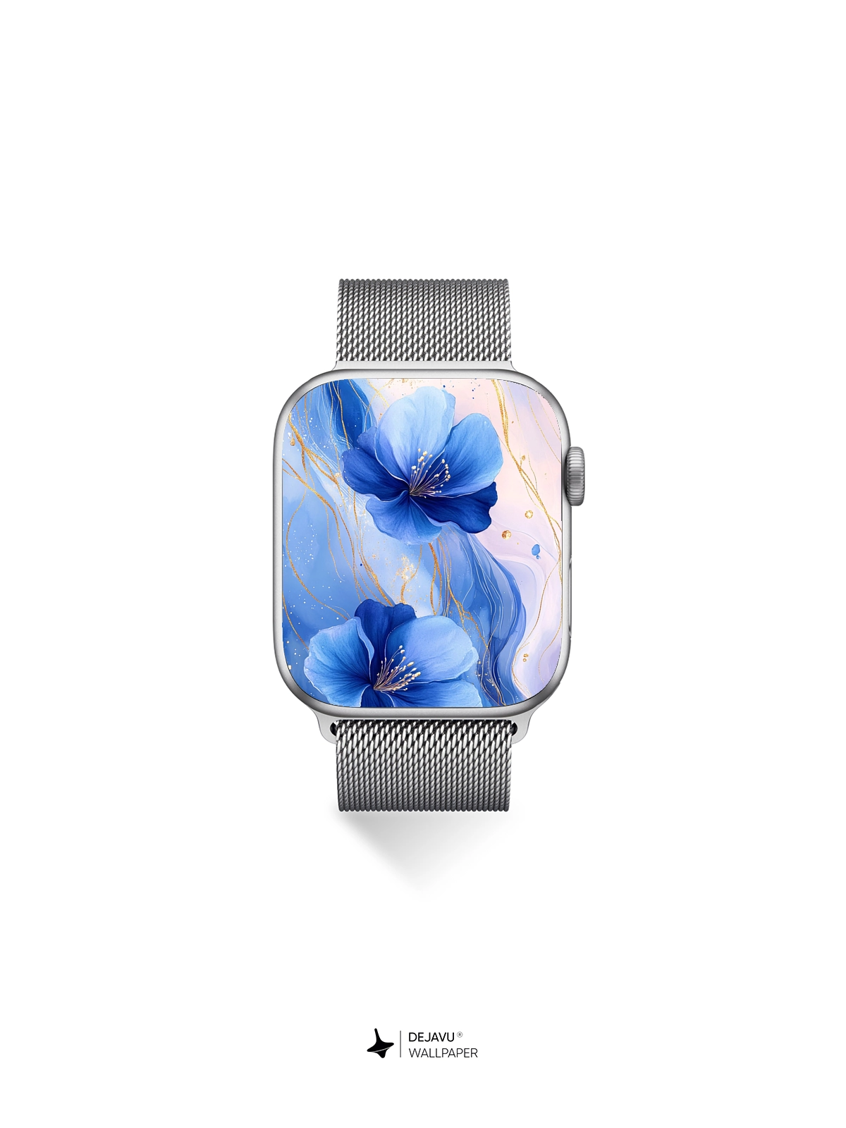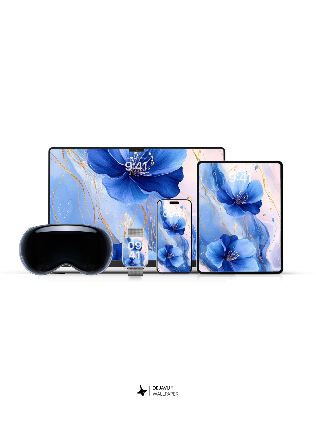 This 8K wallpaper features a stunning abstract design of blue flowers with delicate gold accents, creating a luxurious and minimal aesthetic. Perfect for enhancing the look of your iPhone or Android device, this wallpaper brings a touch of elegance and sophistication to your screen.