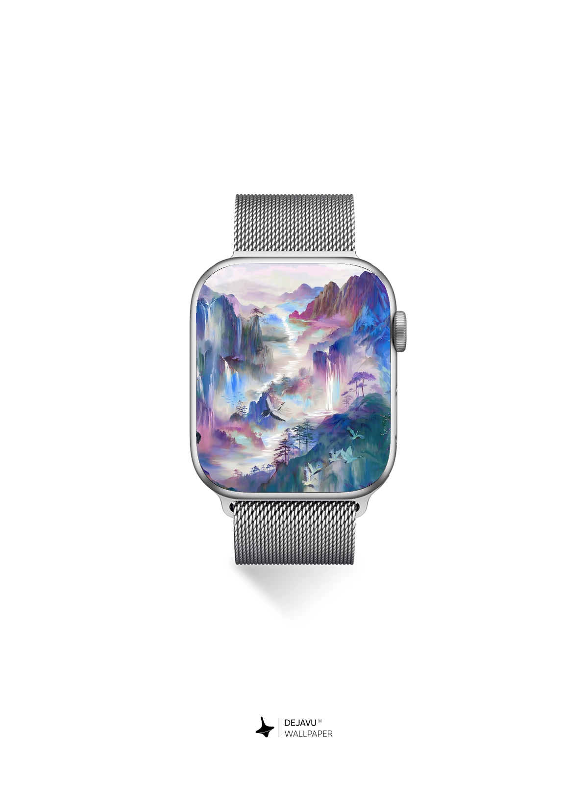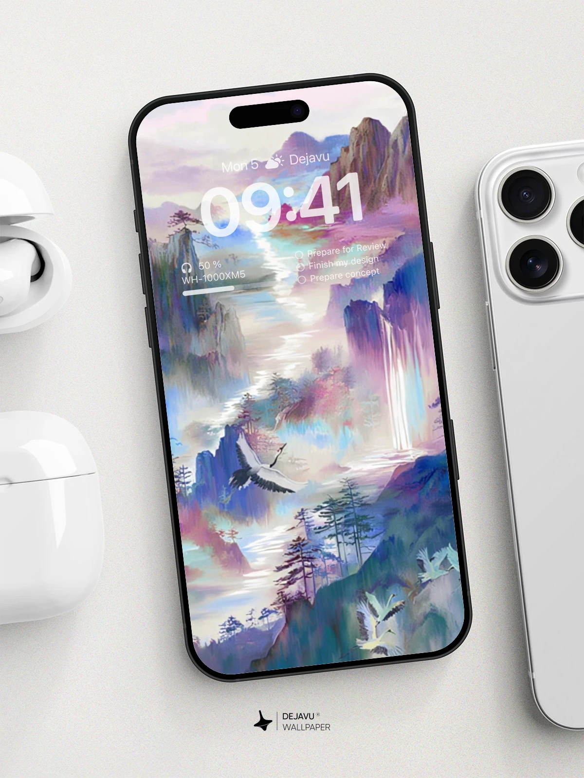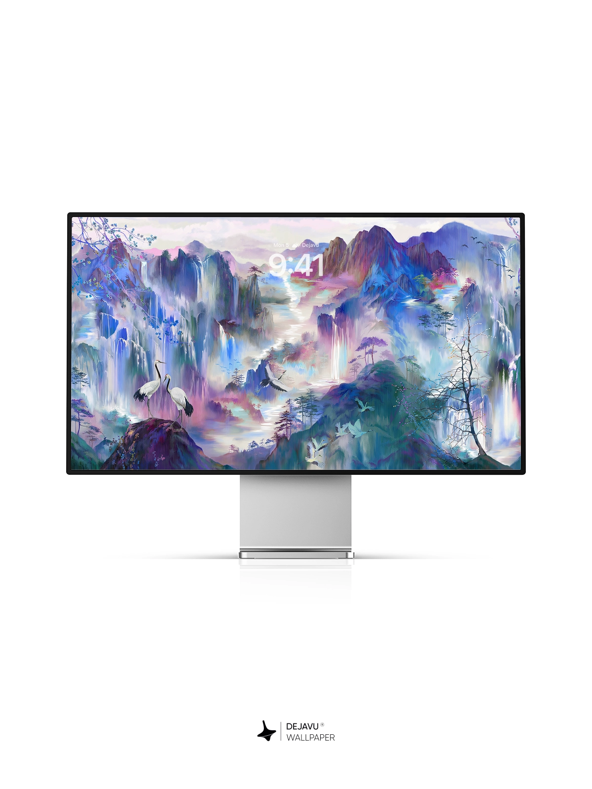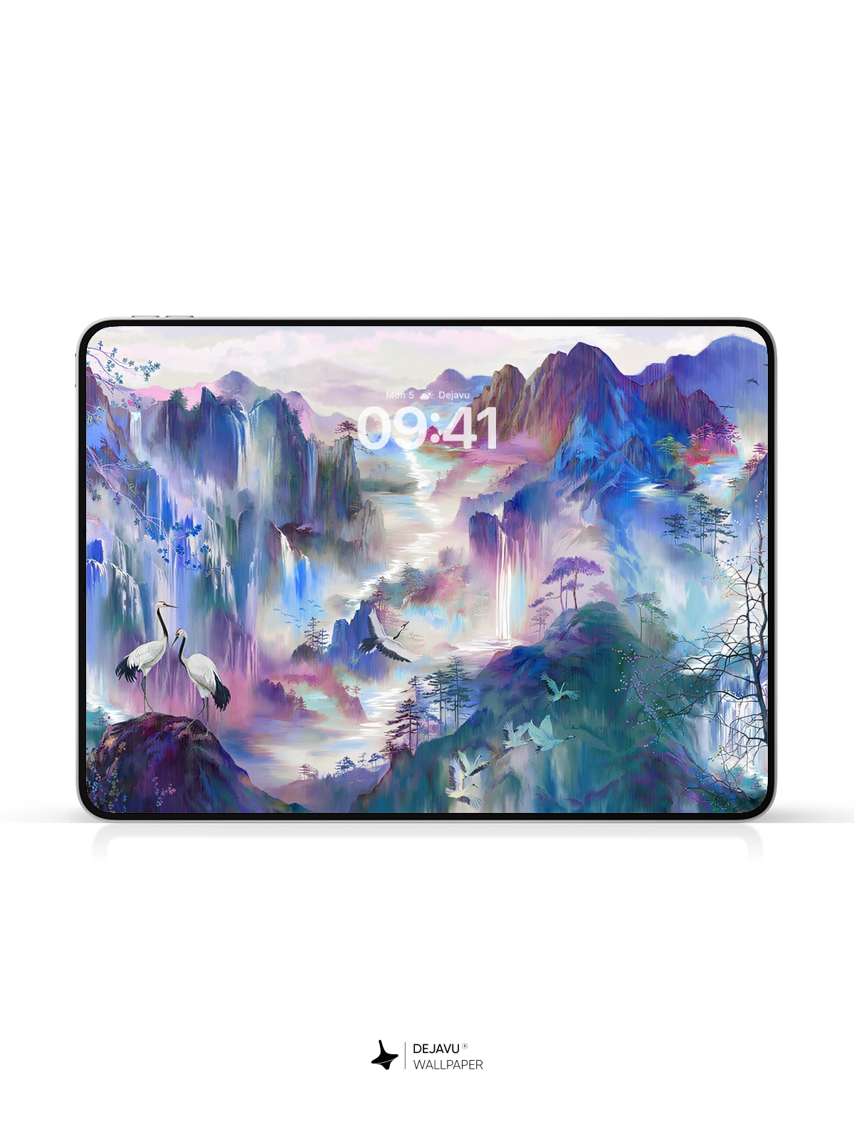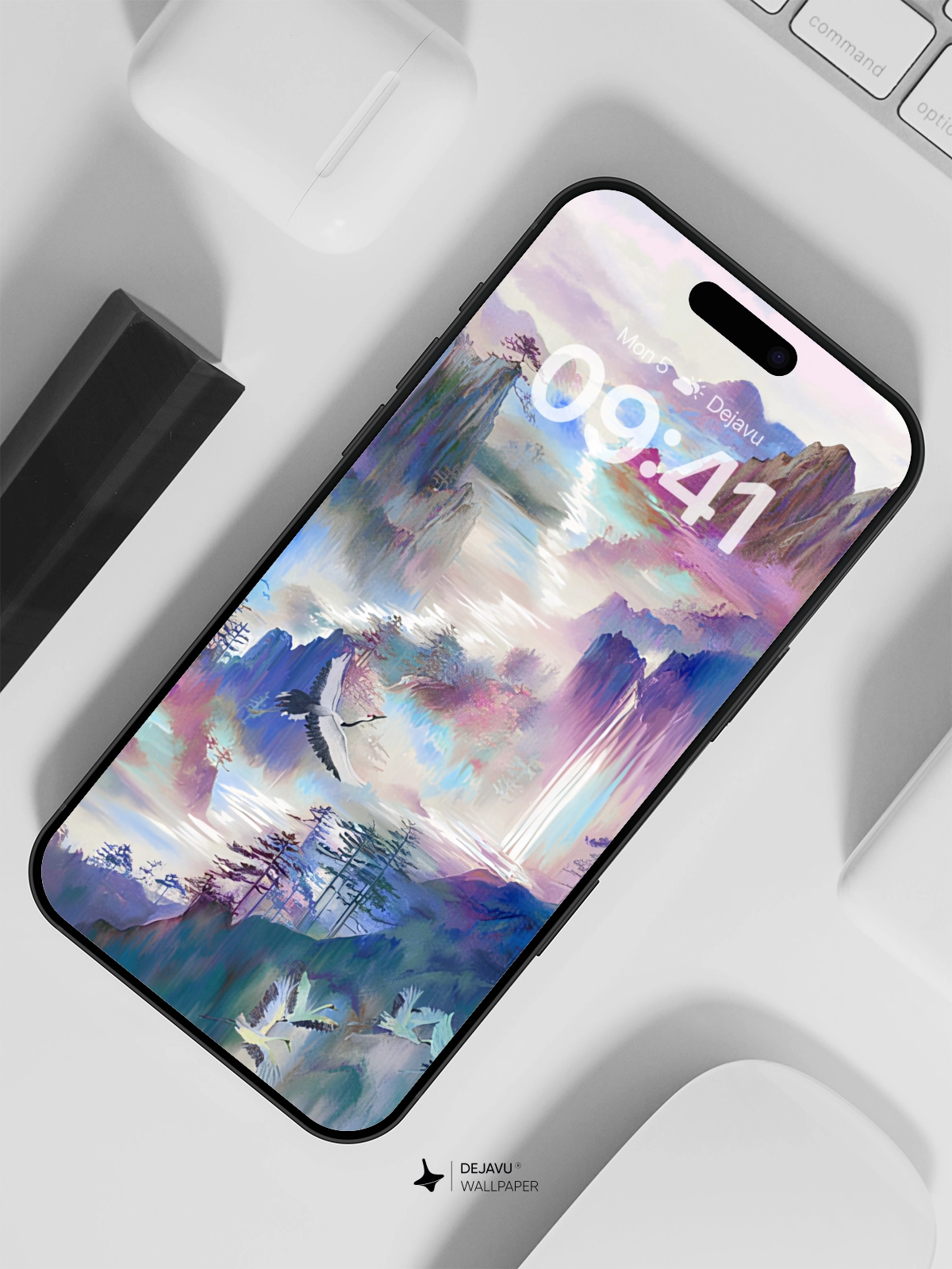 This 8K aesthetic abstract painting wallpaper features a serene landscape filled with cranes, vibrant mountains, and lush trees. The soft gradient colors create a calming and ethereal atmosphere, making it perfect for both iPhone and Android devices. Download now to transform your screen into a tranquil masterpiece.