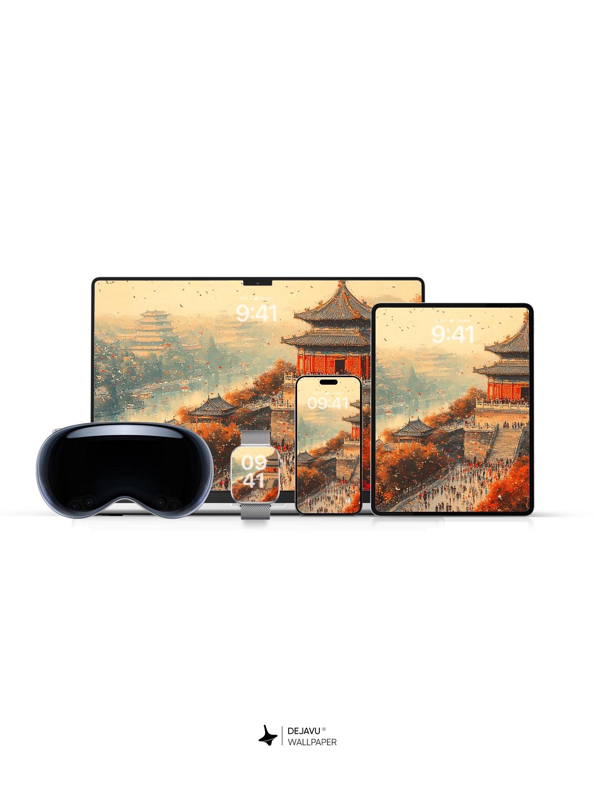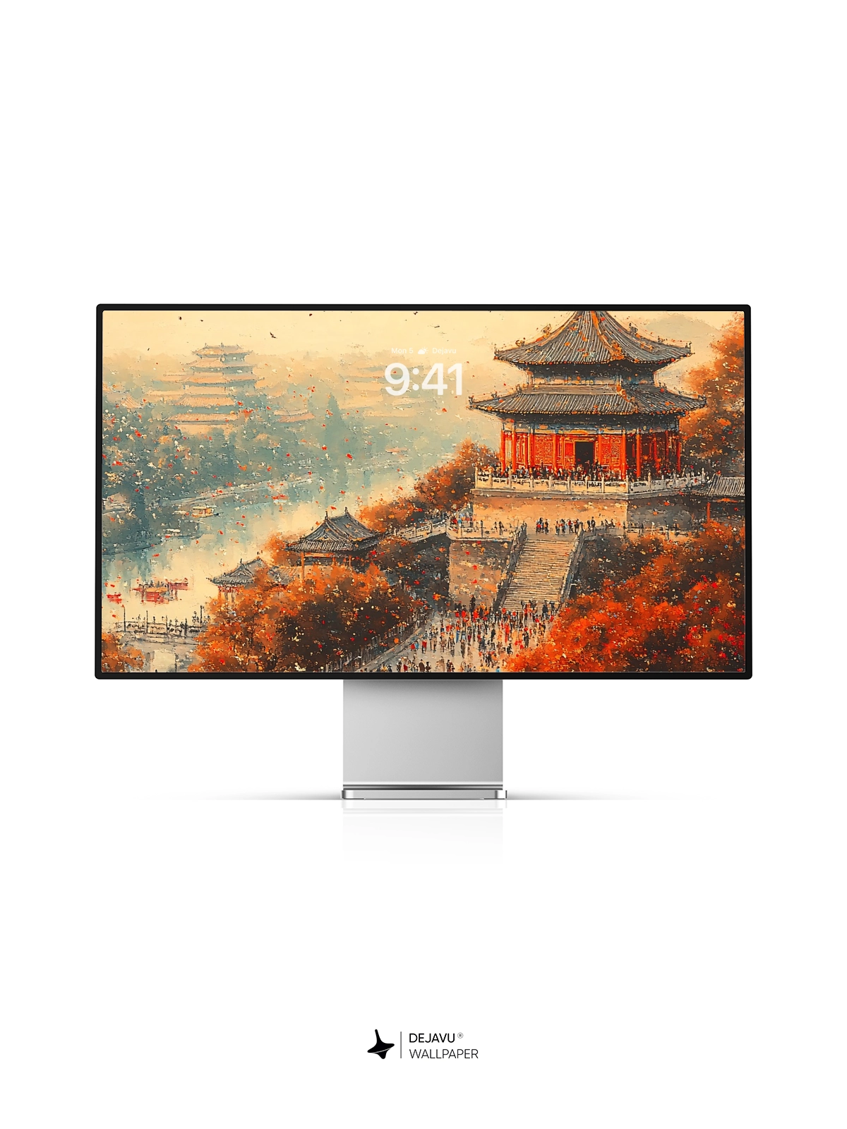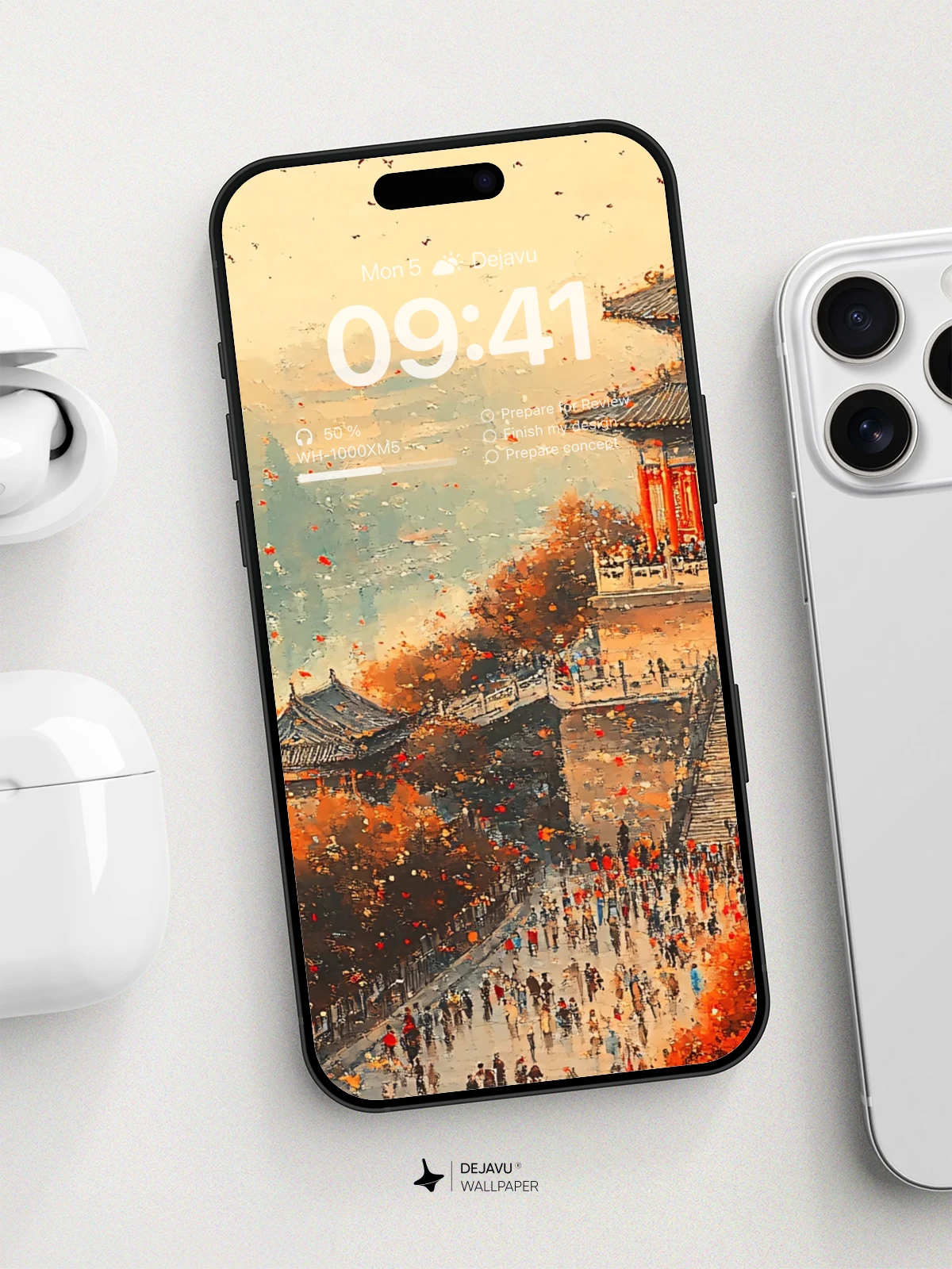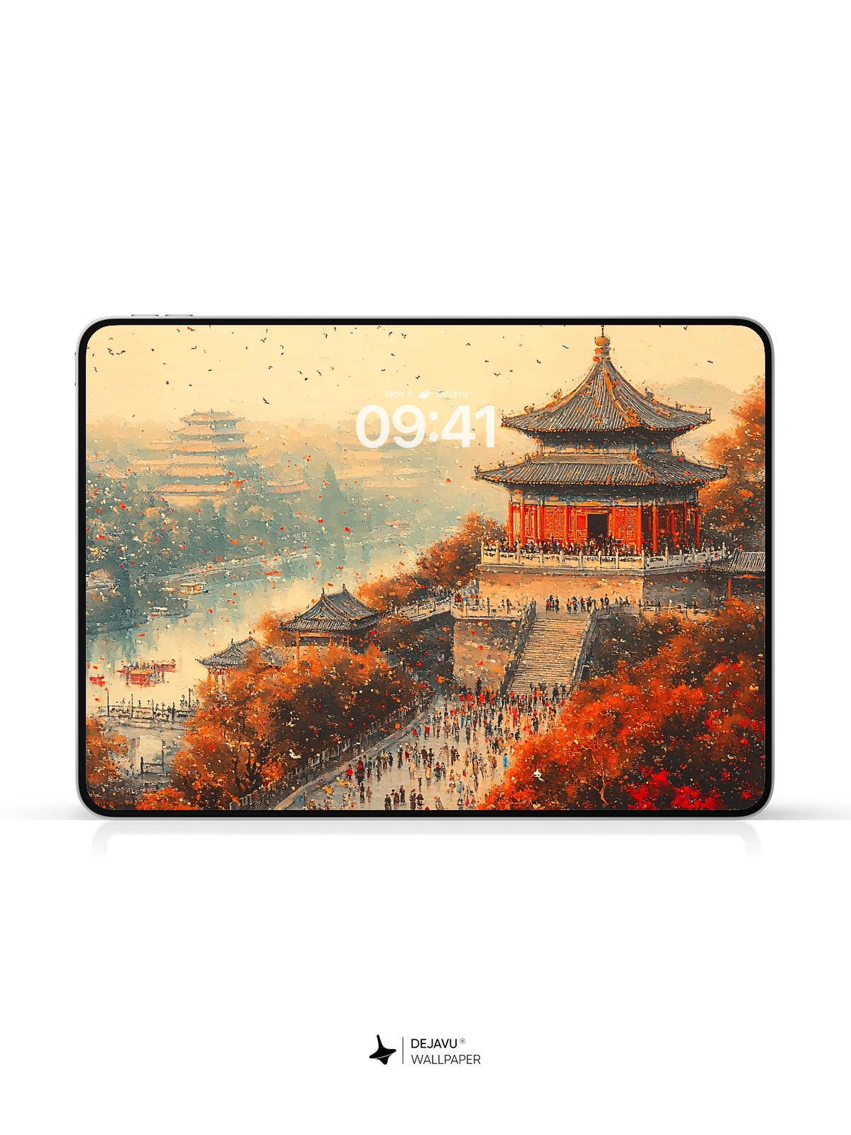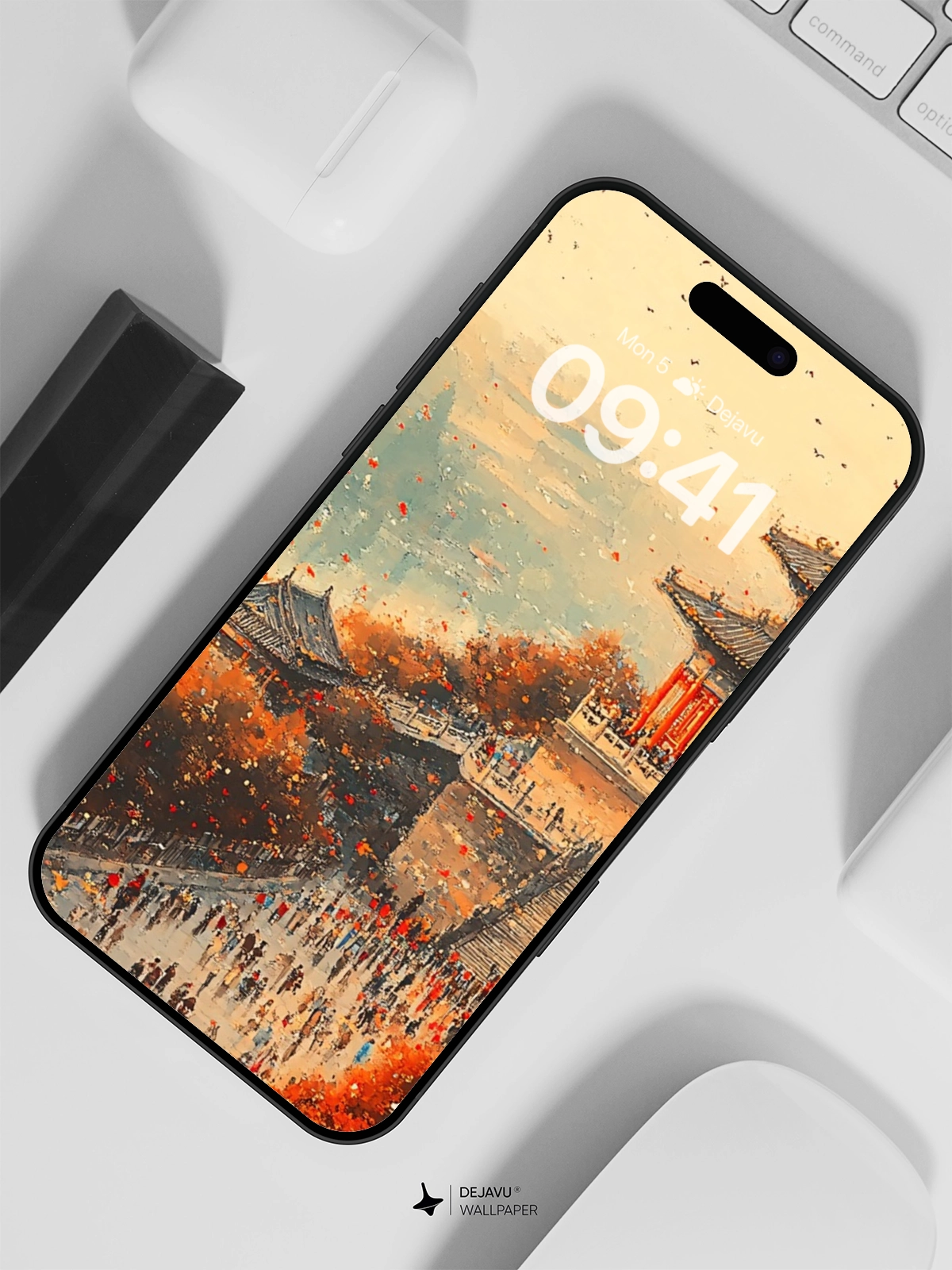 Immerse yourself in the serene beauty of autumn with this stunning 8K painting. The image captures the essence of traditional Chinese architecture amidst a backdrop of vibrant fall foliage. Ideal for enhancing your iPhone or Android device with a touch of cultural elegance and natural beauty.