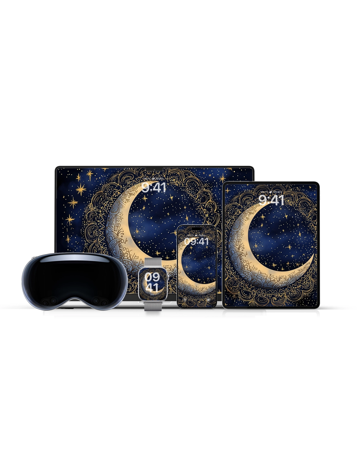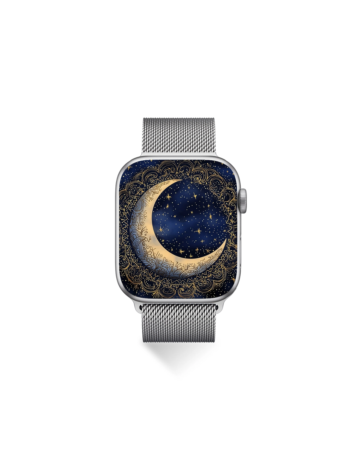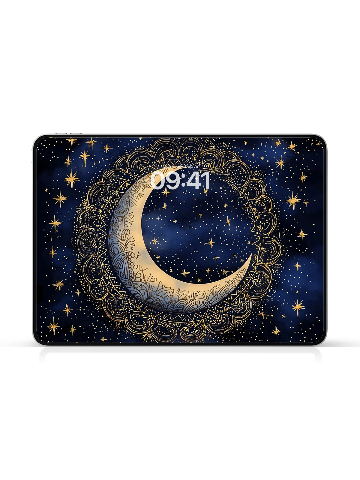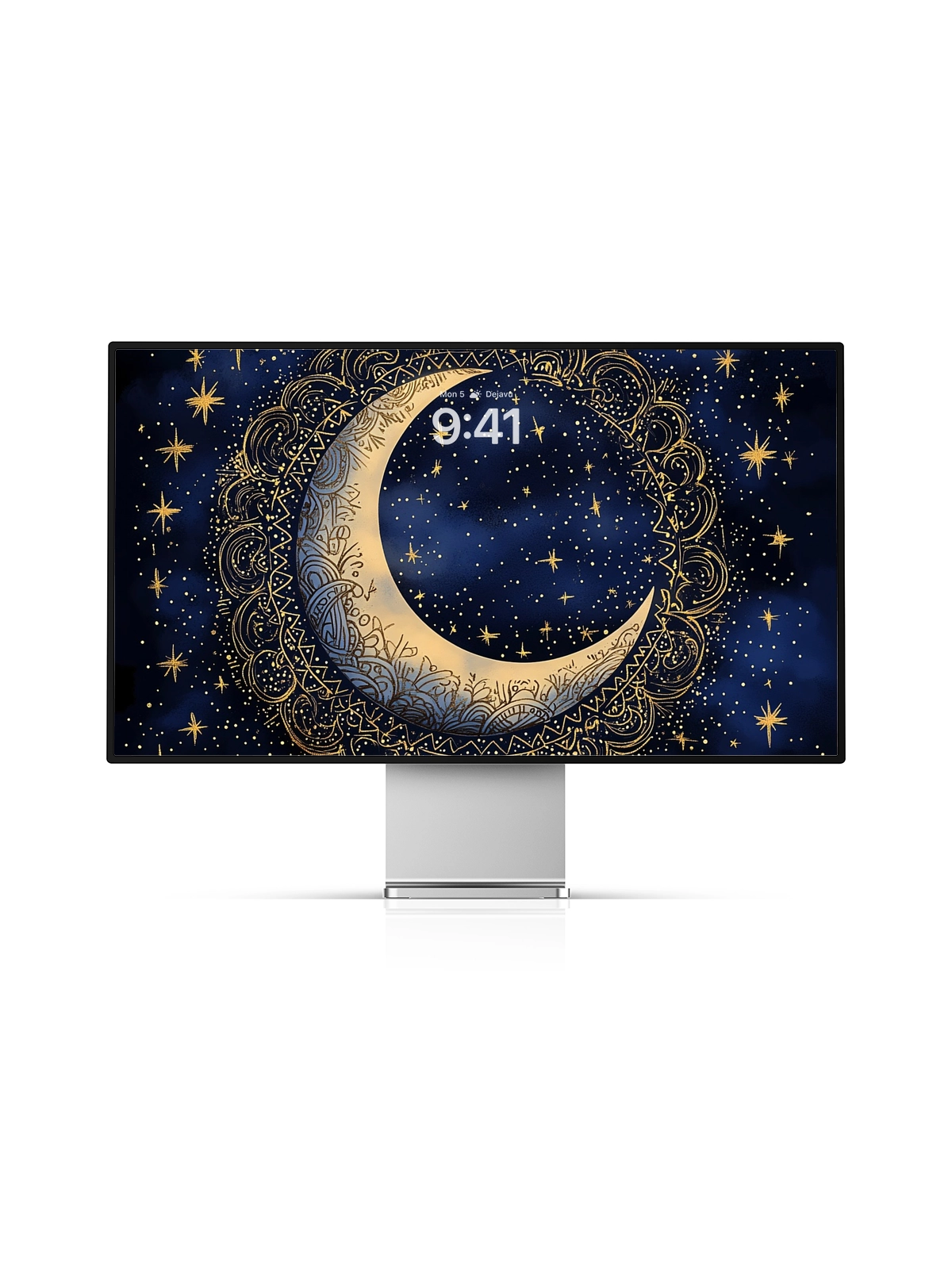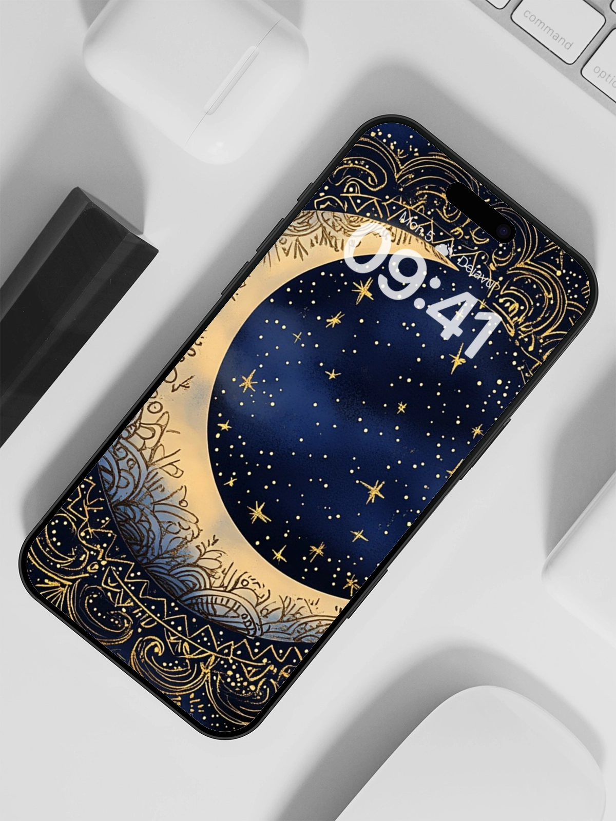 This 8K aesthetic wallpaper showcases an intricately detailed crescent moon adorned with elaborate patterns, set against a backdrop of twinkling stars. The design evokes a sense of mystery and wonder, making it ideal for both iPhone and Android devices. Its high resolution ensures a crisp and beautiful display on any screen.