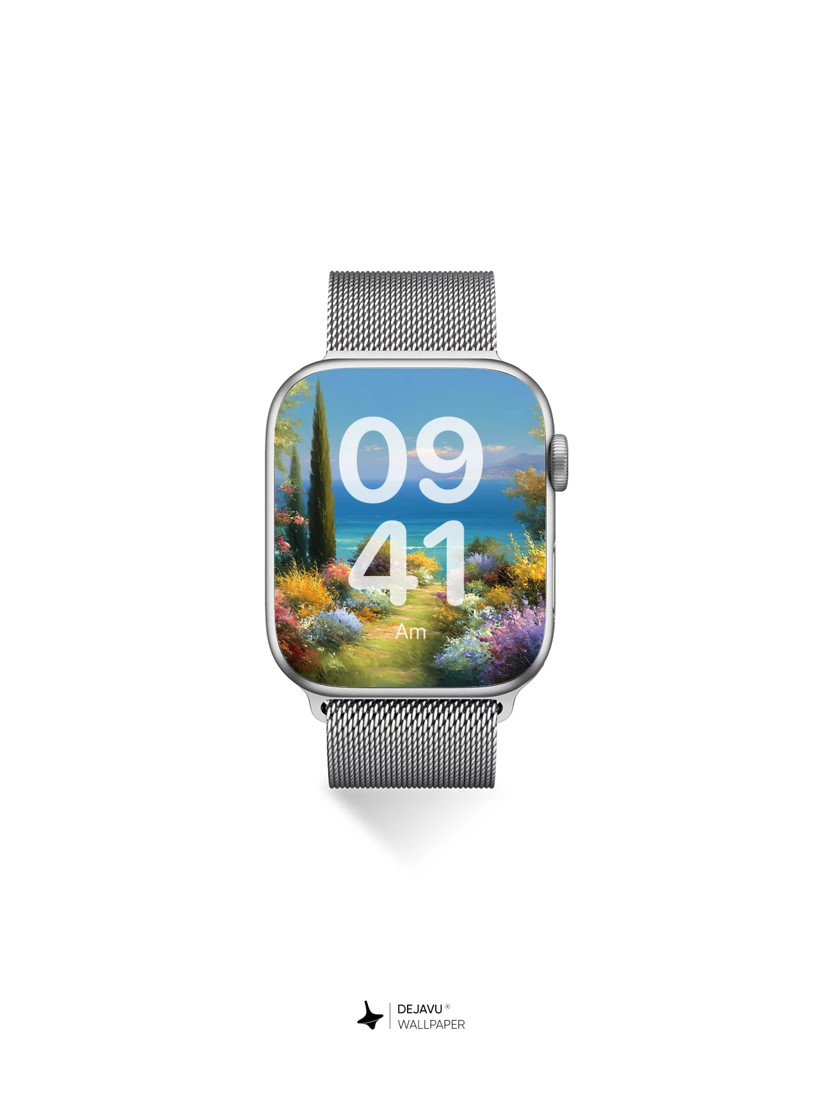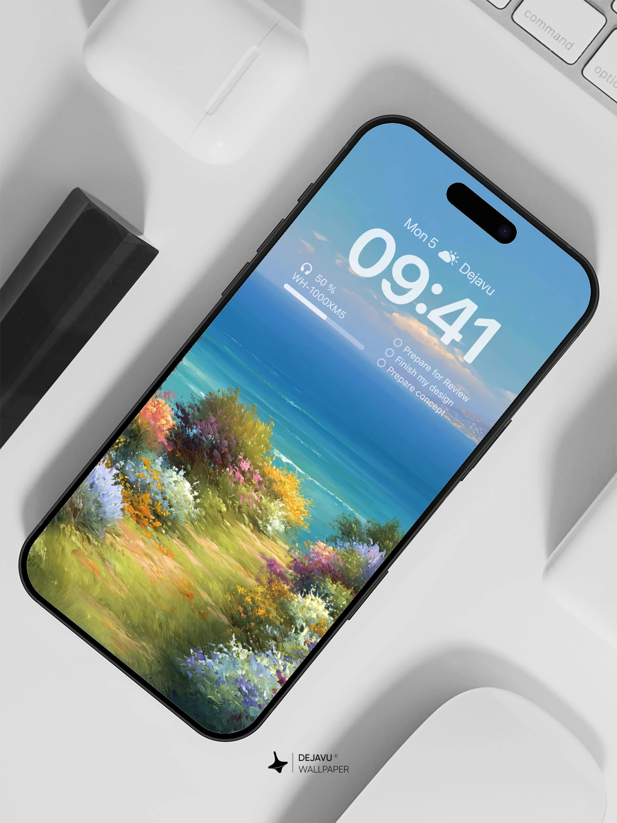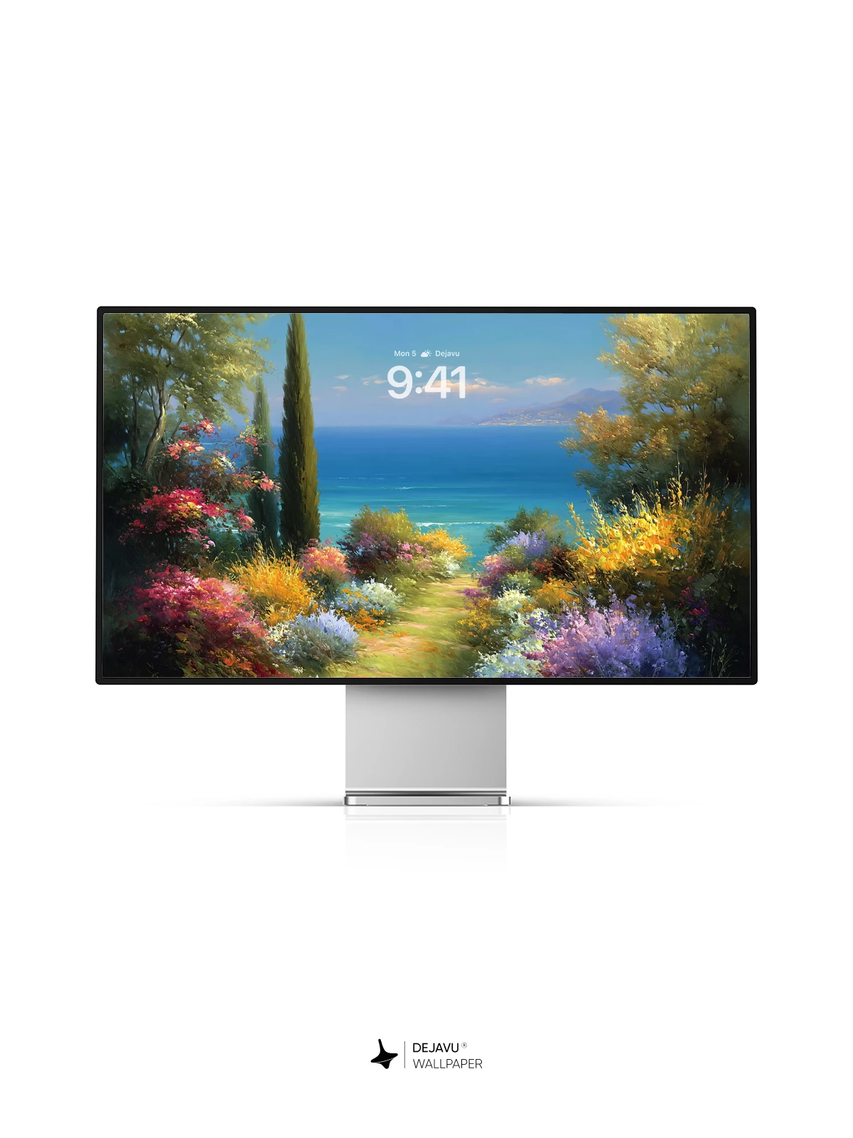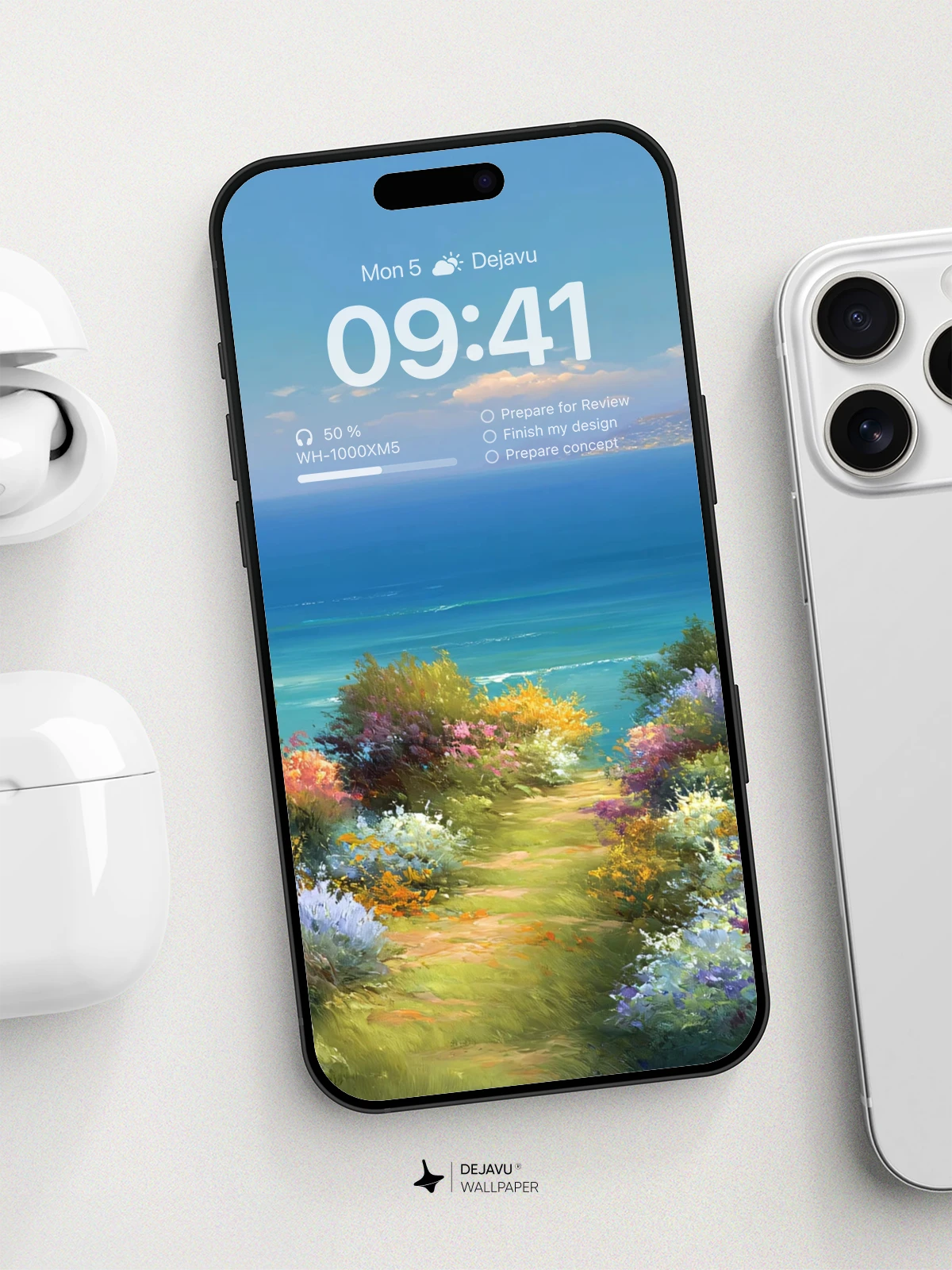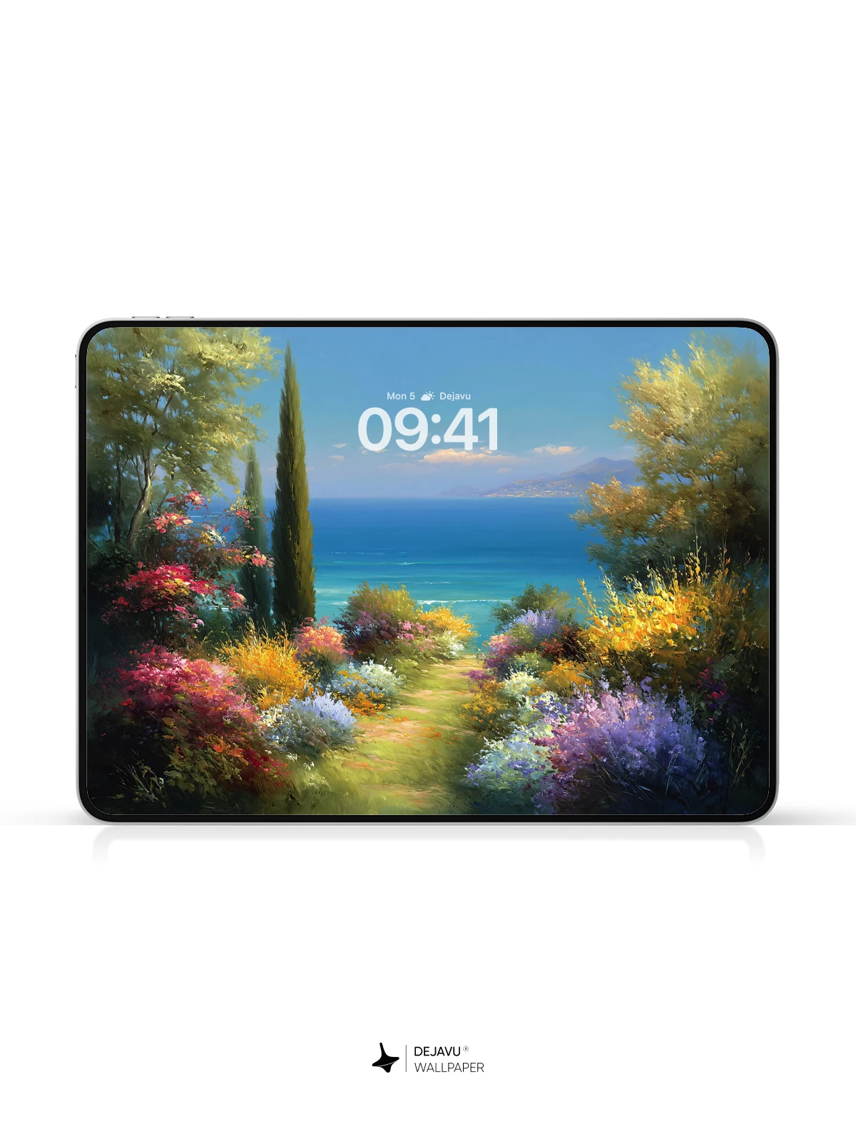 This 8K aesthetic painting captures the essence of a serene coastal pathway, surrounded by lush flora and leading to a tranquil sea. The vibrant colors and detailed brushstrokes evoke a sense of calm and beauty, making it an ideal wallpaper for your iPhone or Android device. Perfect for those who appreciate nature and art.