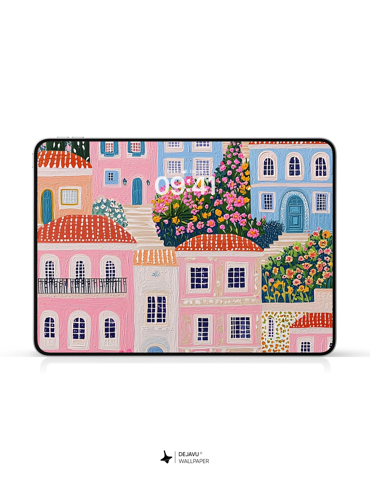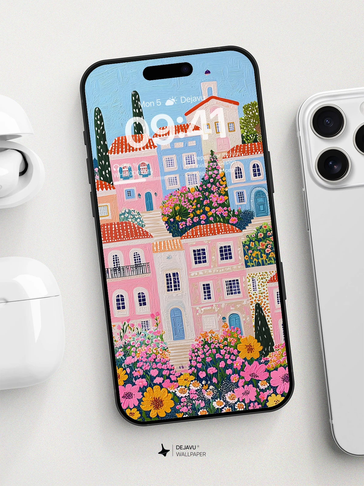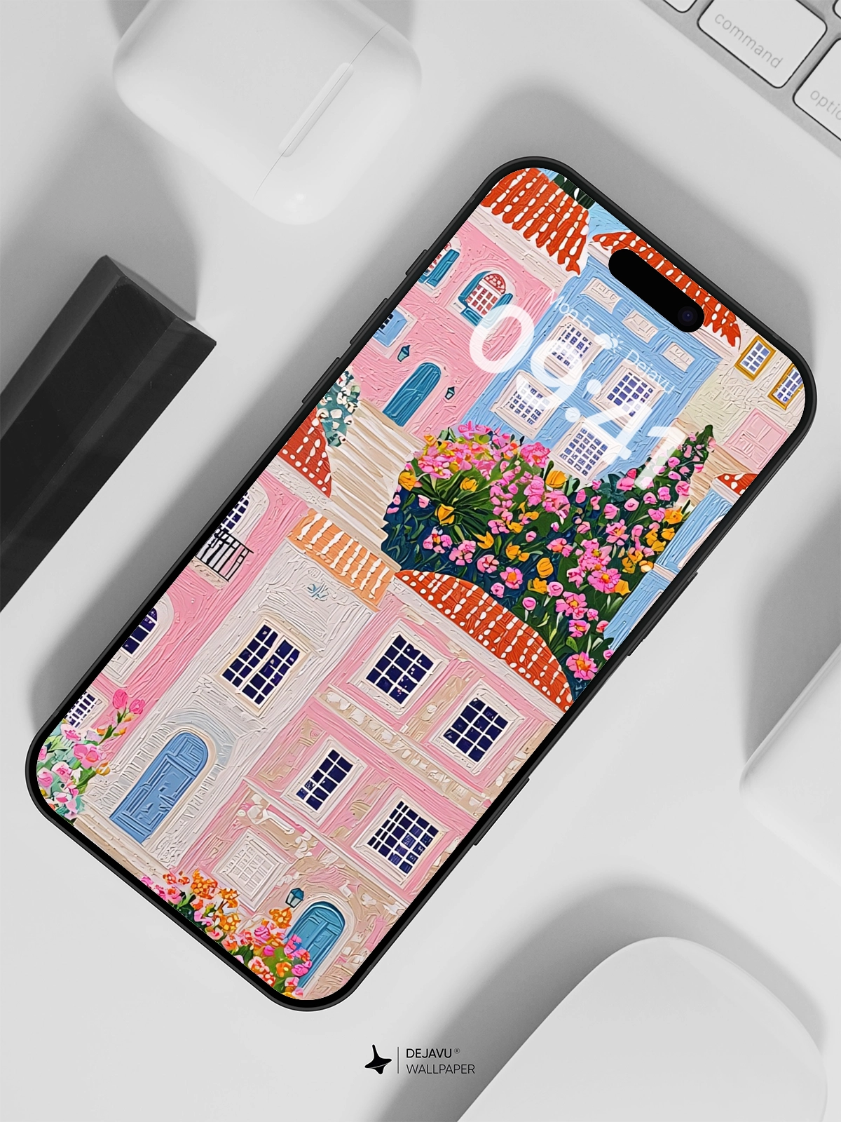 This 8K aesthetic painting captures the charm of a quaint village with pastel-colored buildings and blooming gardens. The detailed illustration evokes a sense of tranquility and beauty, making it an ideal wallpaper for iPhone, Android, and tablets. The soft gradient colors and intricate design create a visually pleasing and calming atmosphere.