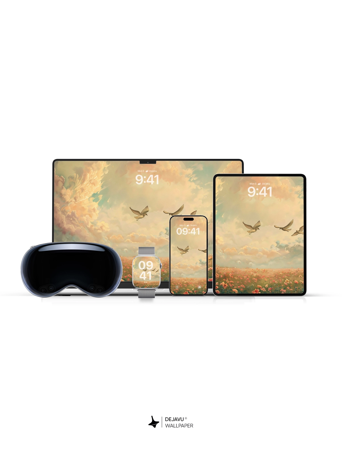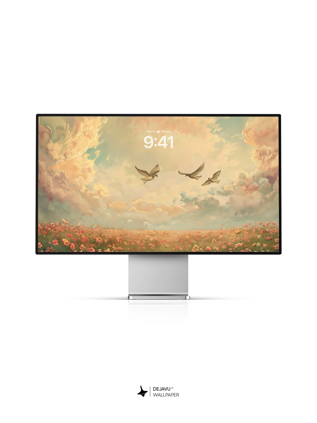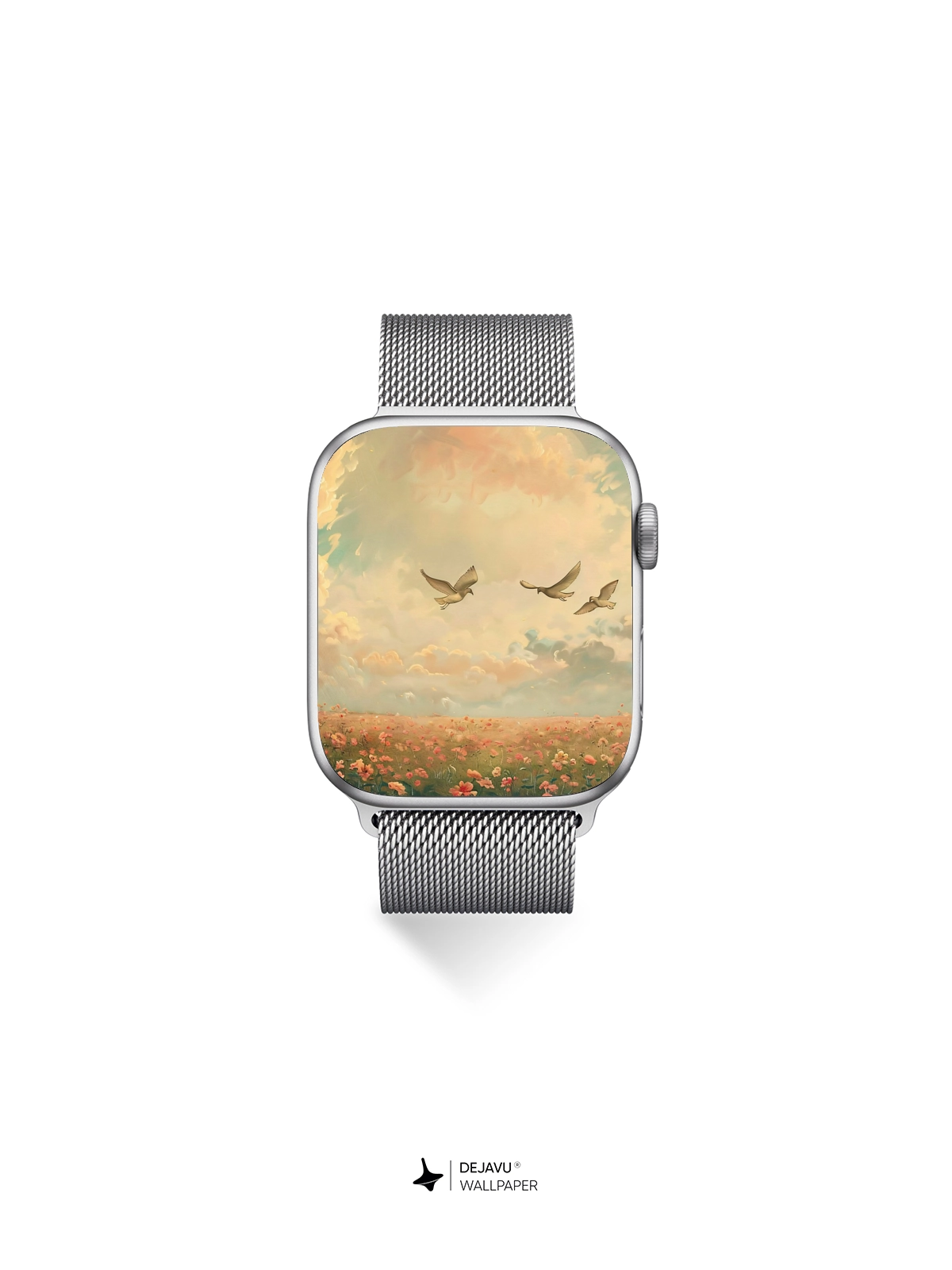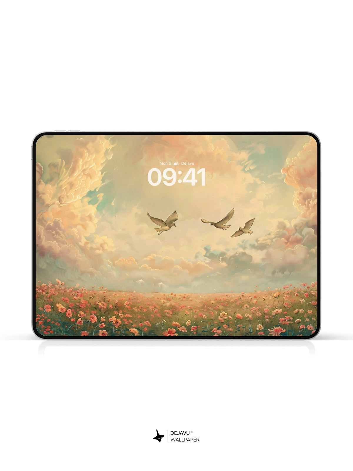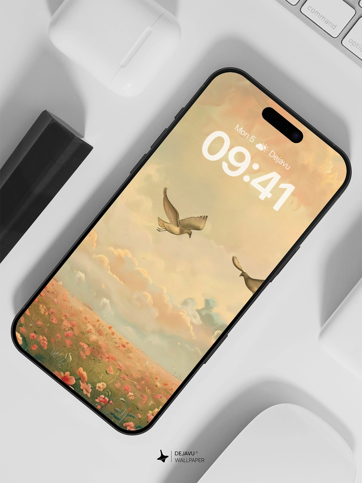 This 8K aesthetic painting captures the tranquil essence of birds in flight over a lush flower field. The soft gradient colors and detailed brushstrokes evoke a sense of peace and wonder. Ideal for enhancing the screens of your iPhone, Android, or tablet with its high-resolution beauty.
