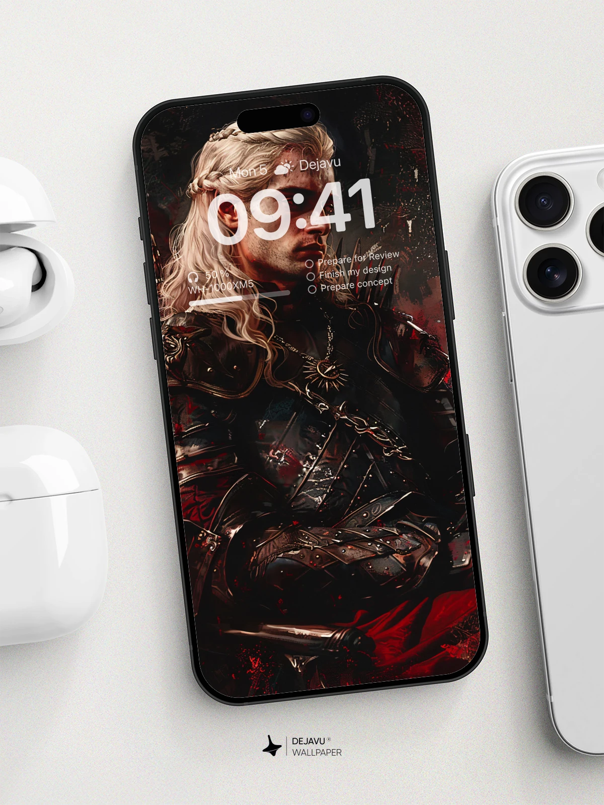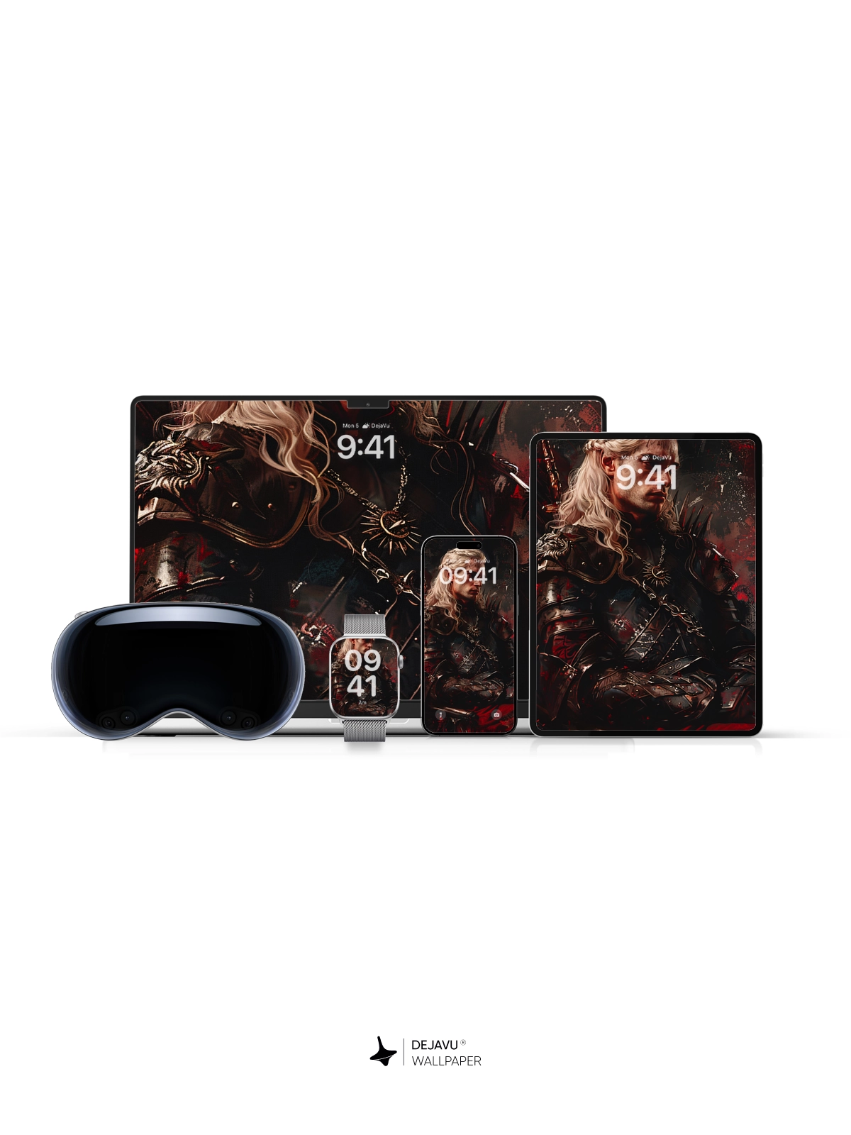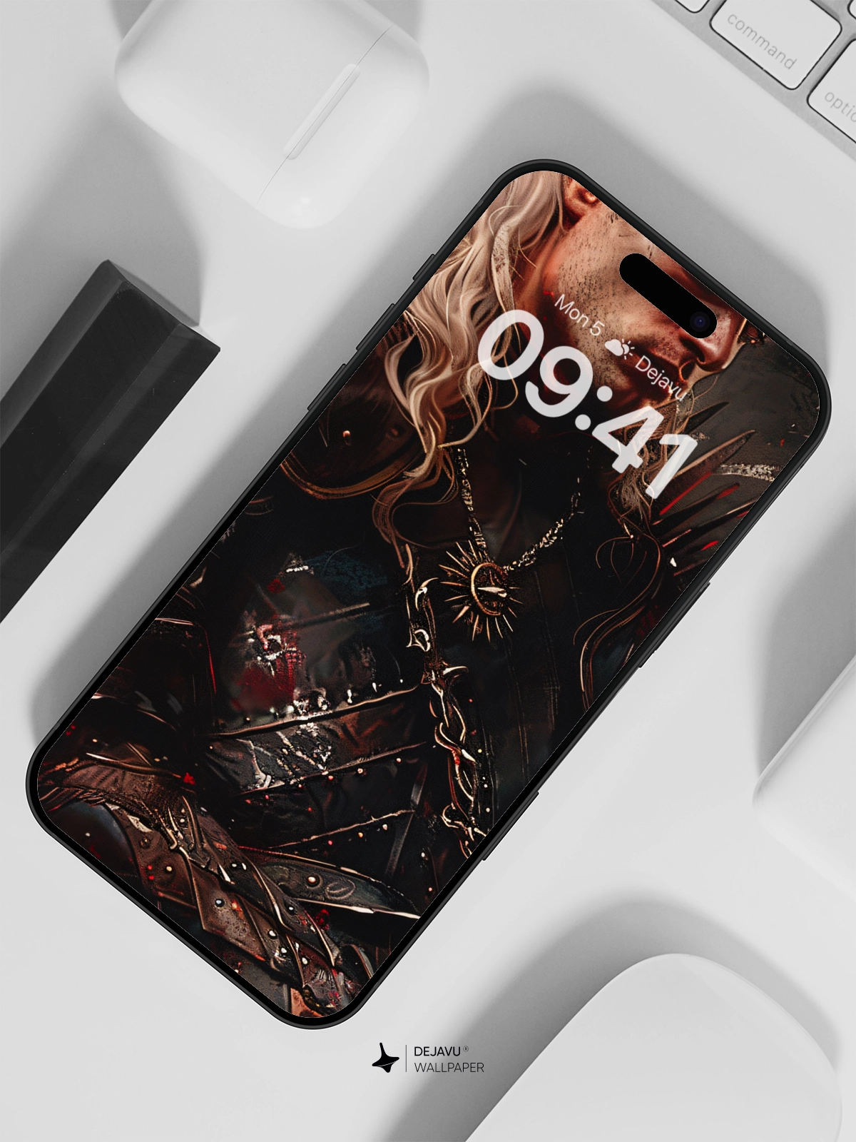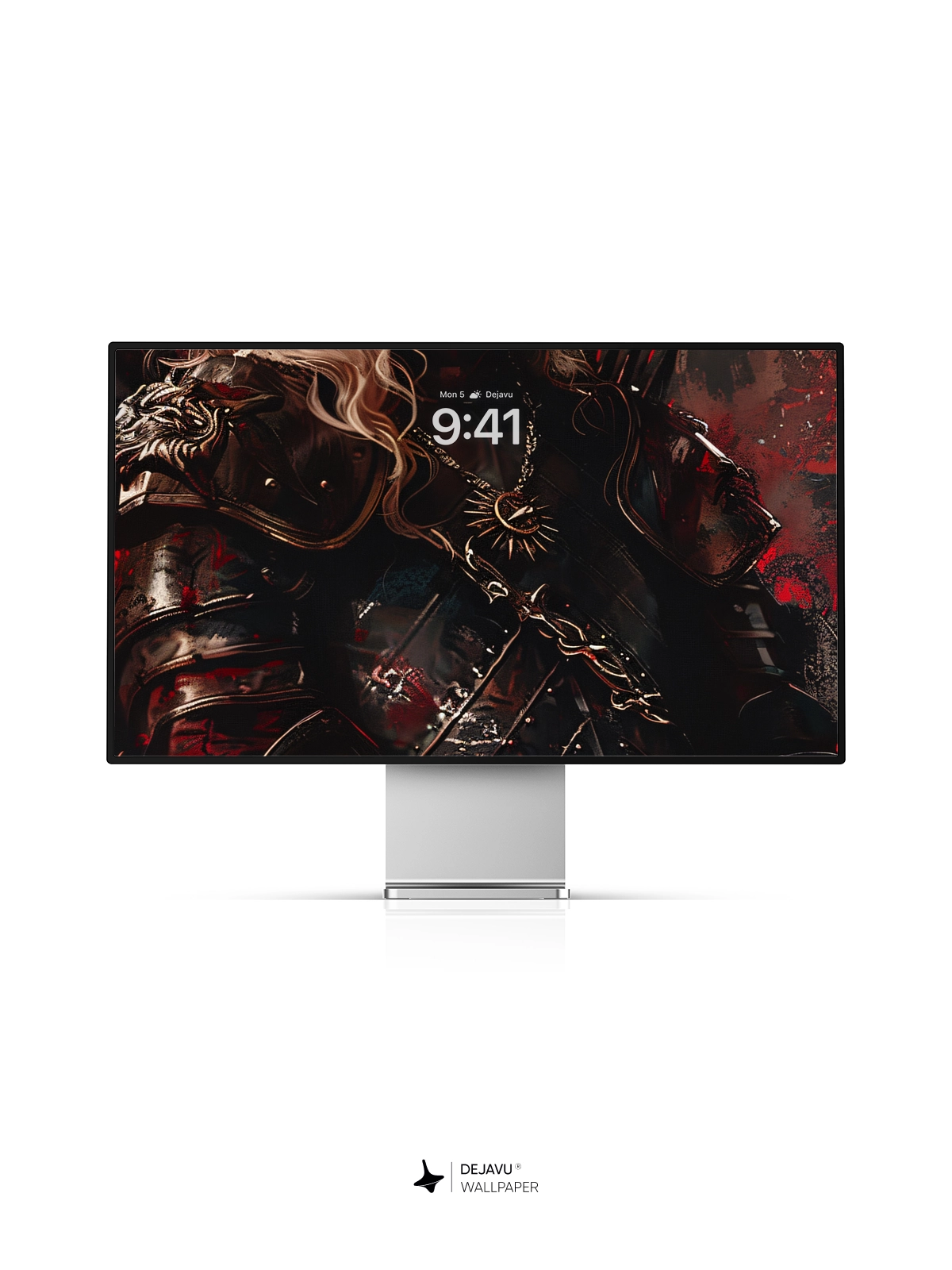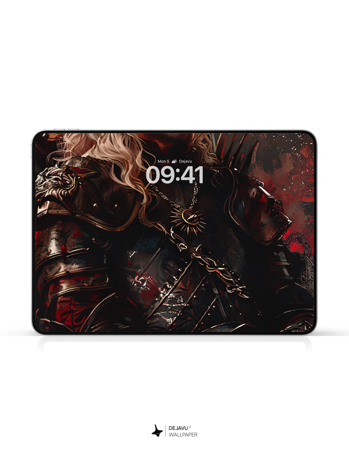 This 8K wallpaper showcases a detailed and dramatic illustration of a fantasy warrior in ornate armor, set against a blood-stained backdrop. The design is both aesthetic and intense, capturing the essence of epic battles and heroic tales. Ideal for enhancing the screens of iPhone, Android, and tablets with its high-resolution and captivating visuals.