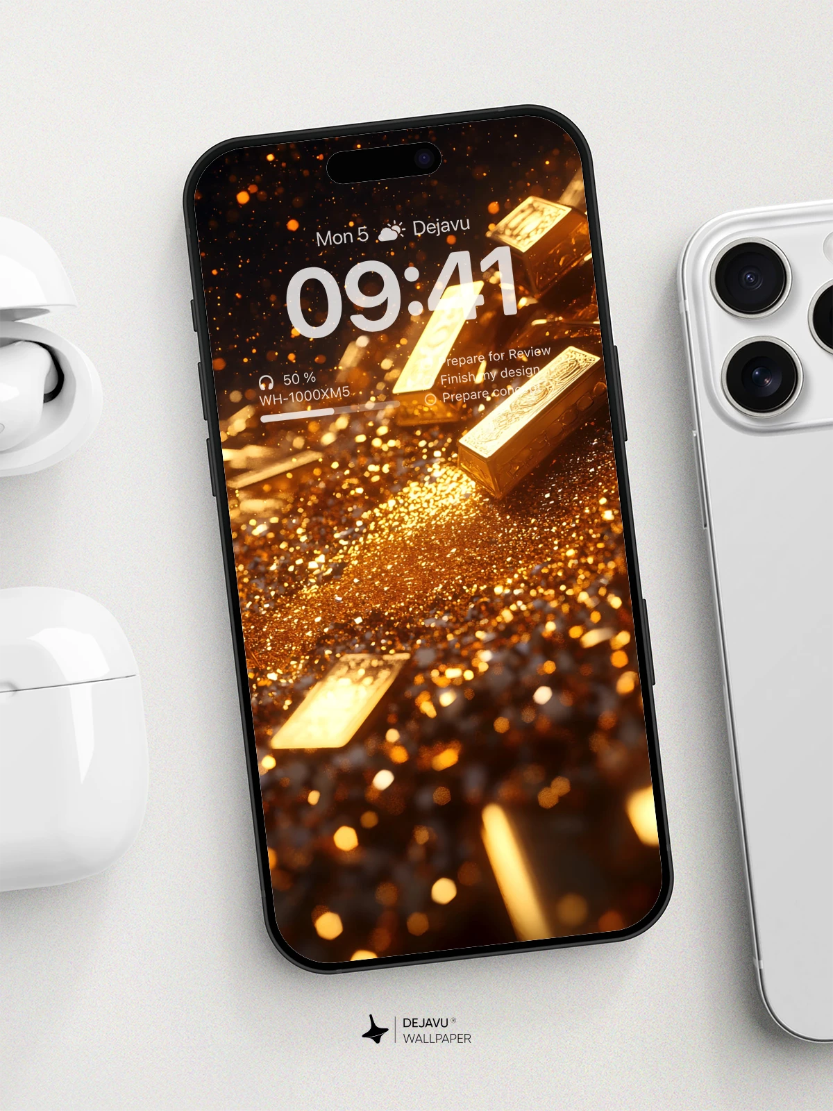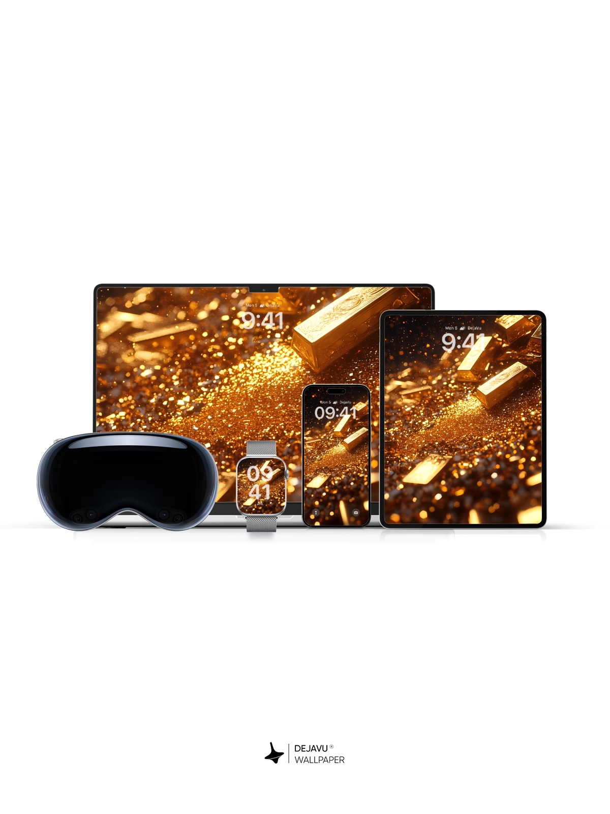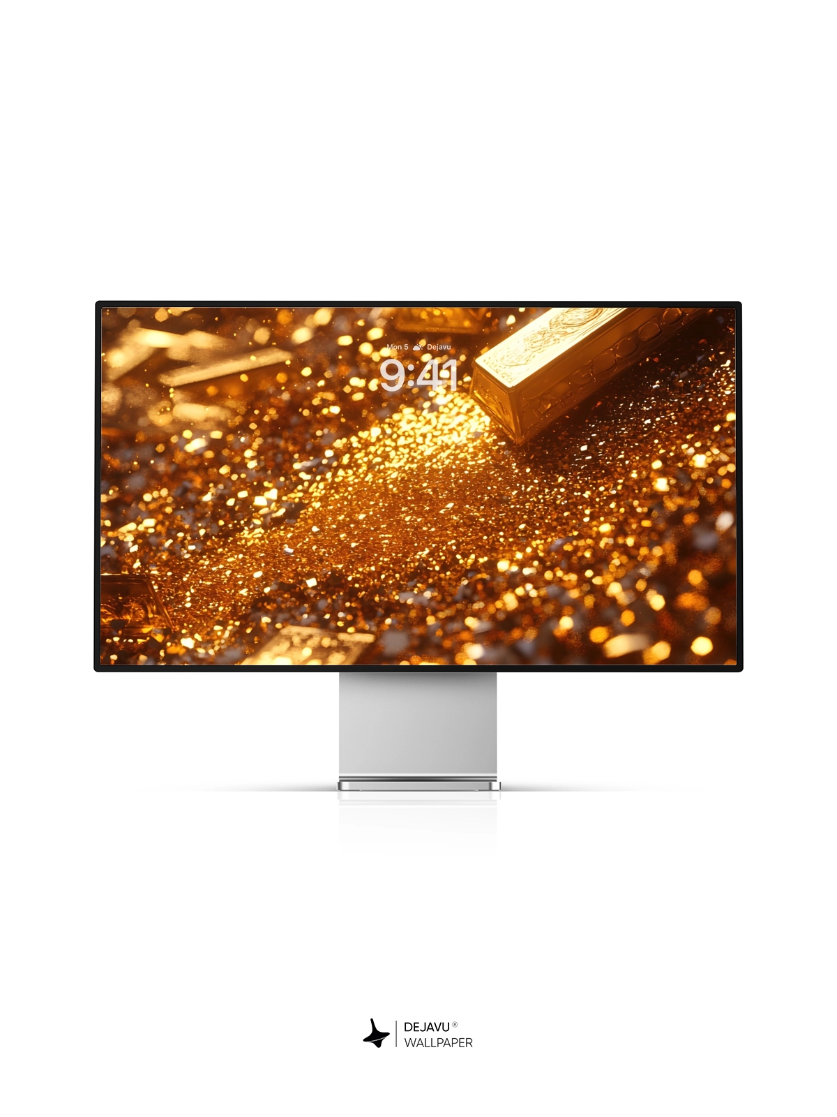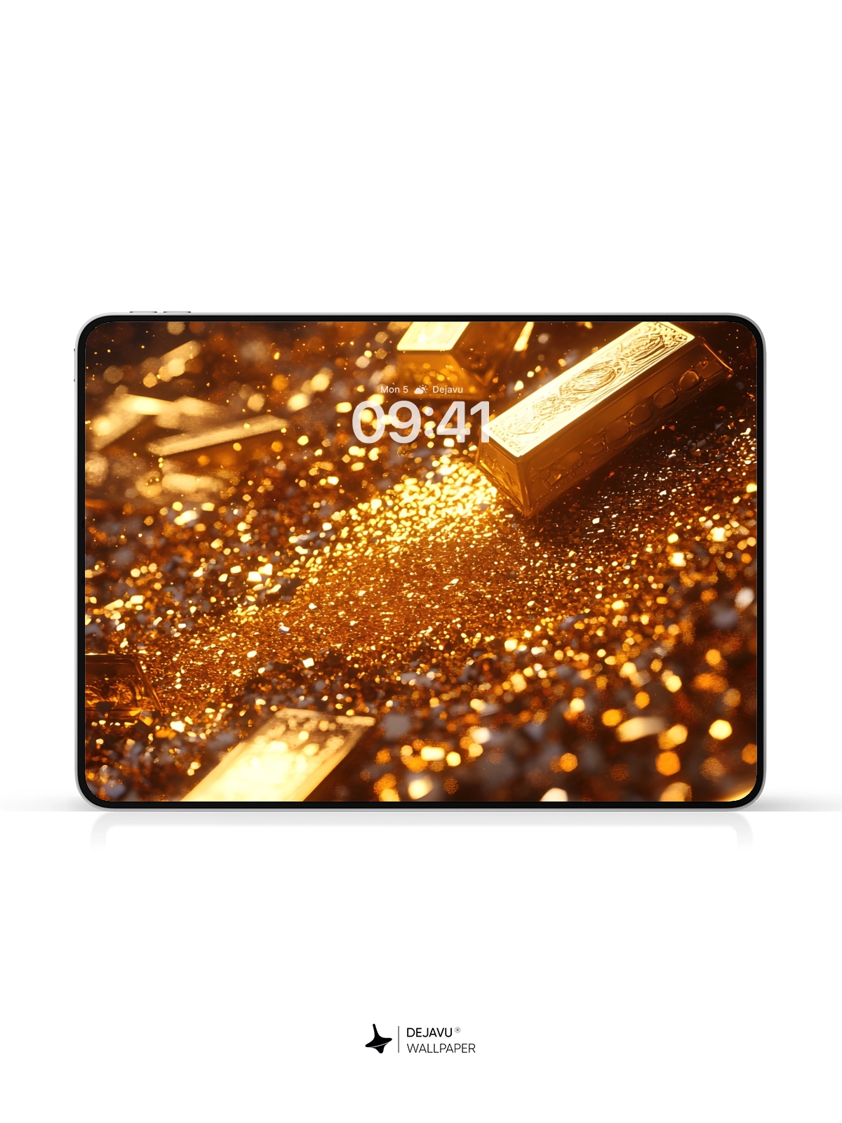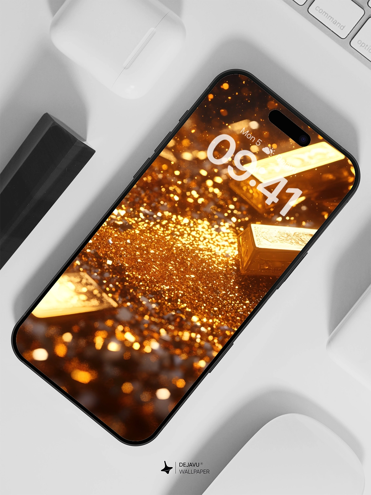 This 8K wallpaper features a stunning array of golden glitter and gleaming gold bars, creating a luxurious and minimal aesthetic. Perfect for enhancing the look of your iPhone or Android device, this image evokes a sense of wealth and elegance with its shimmering details and rich colors.
