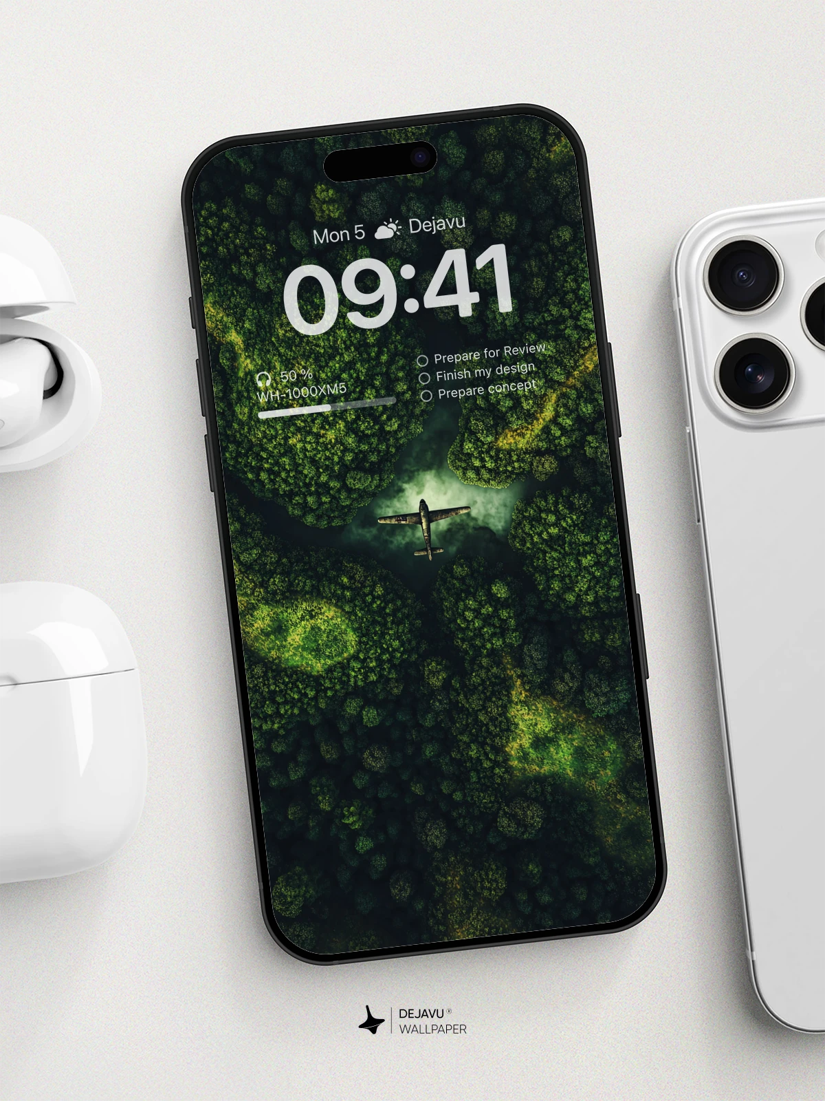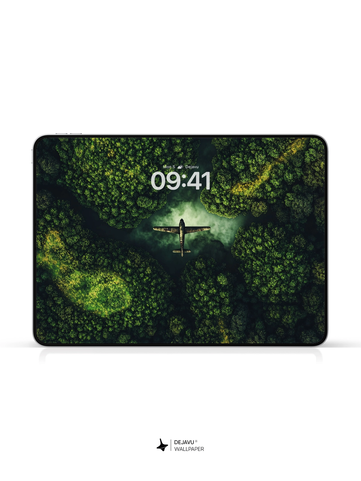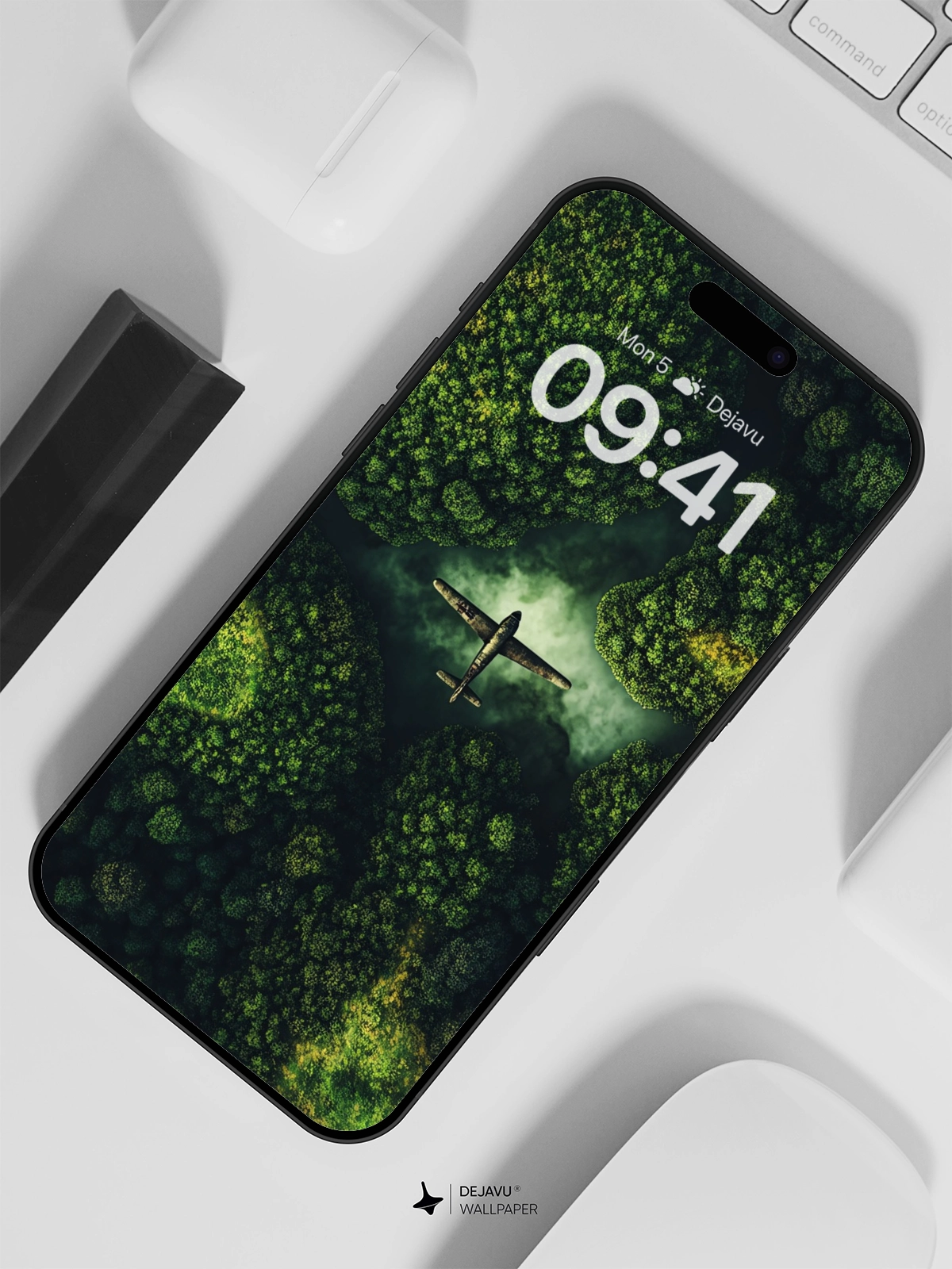 This 8K wallpaper offers a breathtaking aerial view of a dense forest with a plane flying through, creating a unique and captivating scene. The minimalistic design and vibrant green hues make it perfect for enhancing the aesthetic of your iPhone or Android device. Enjoy the serene beauty of nature on your screen.