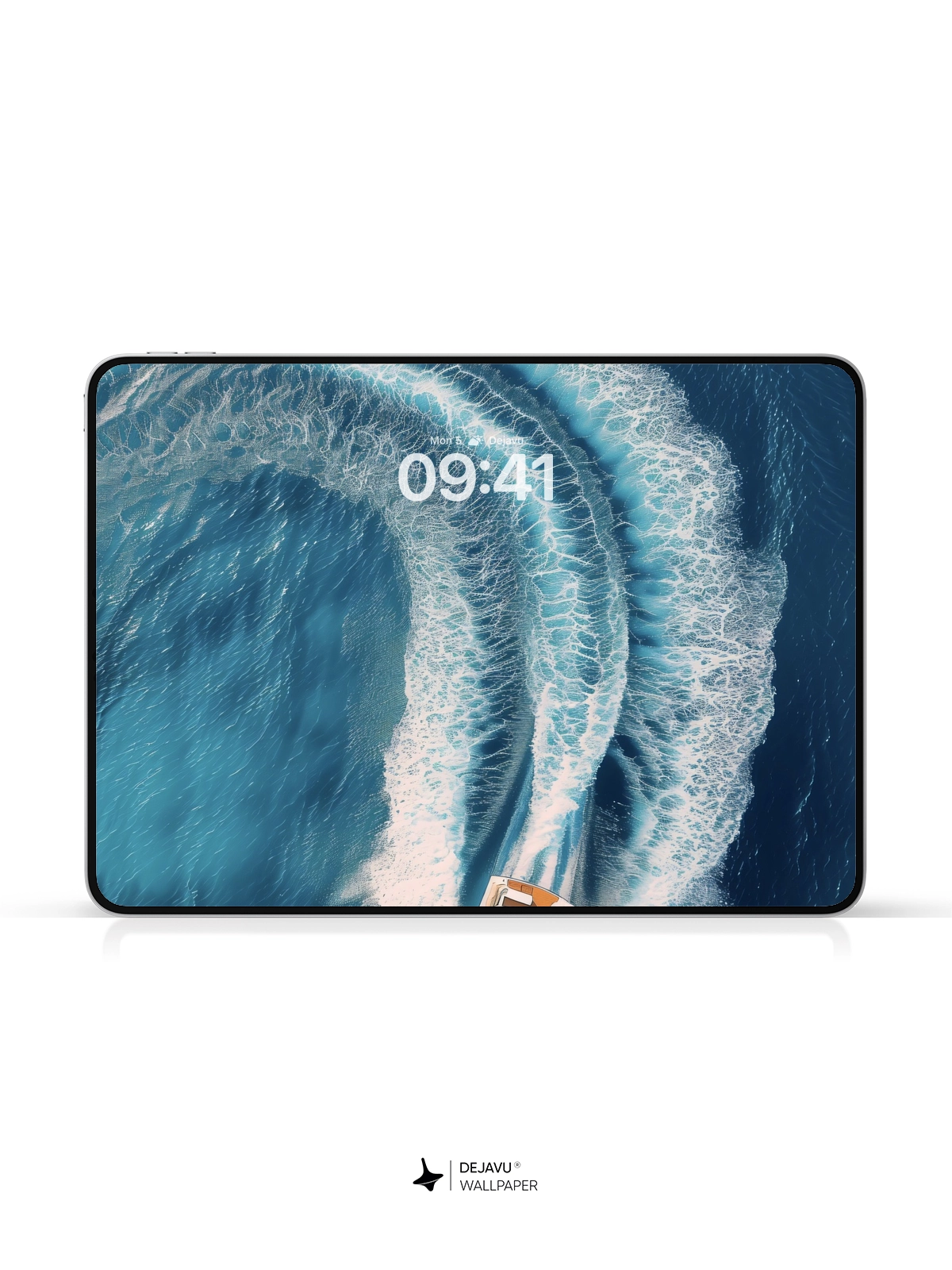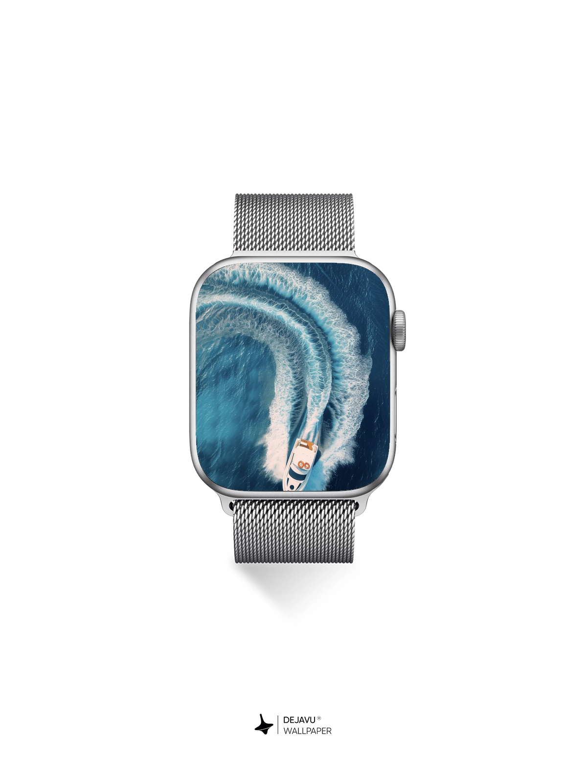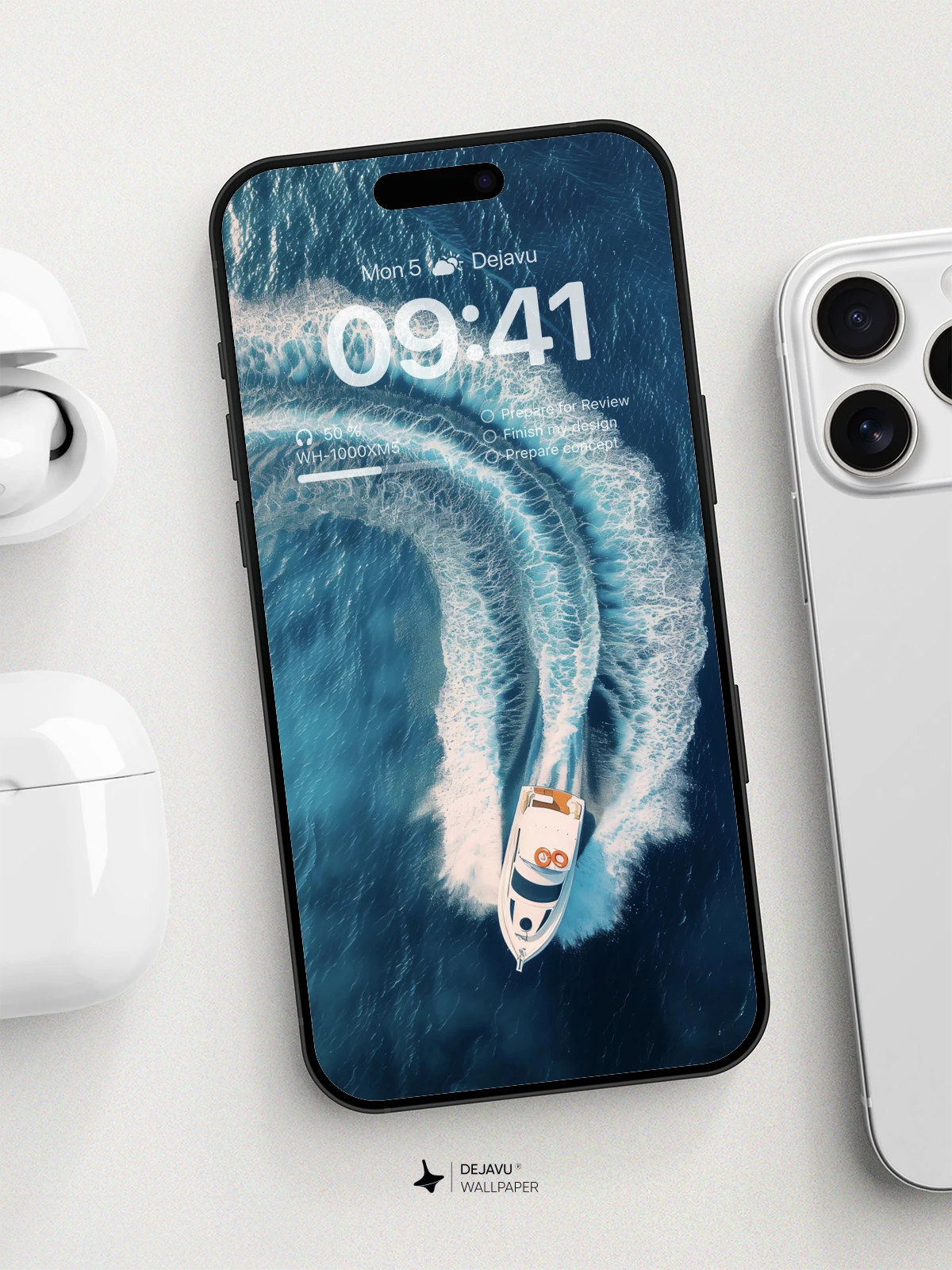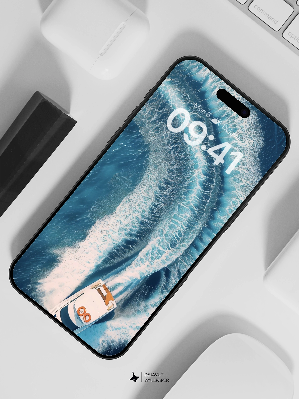 Experience the thrill of high-speed boating with this 8K minimal wallpaper. The image captures an aerial view of a speedboat cutting through deep blue ocean waters, leaving a mesmerizing wake behind. This wallpaper is perfect for adding a touch of adventure and beauty to your iPhone or Android device, enhancing your screen with its vibrant colors and dynamic design.