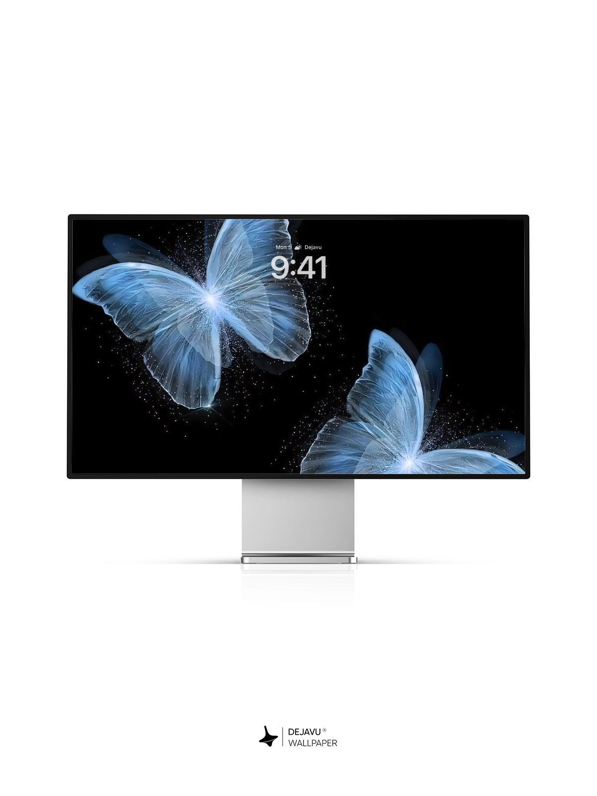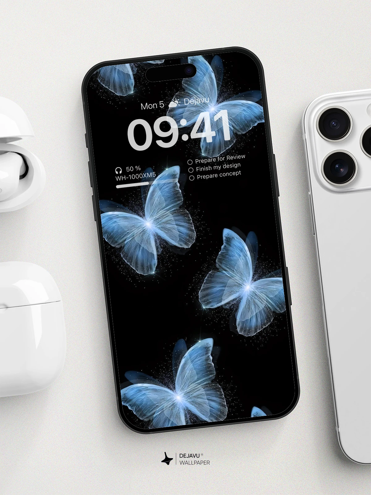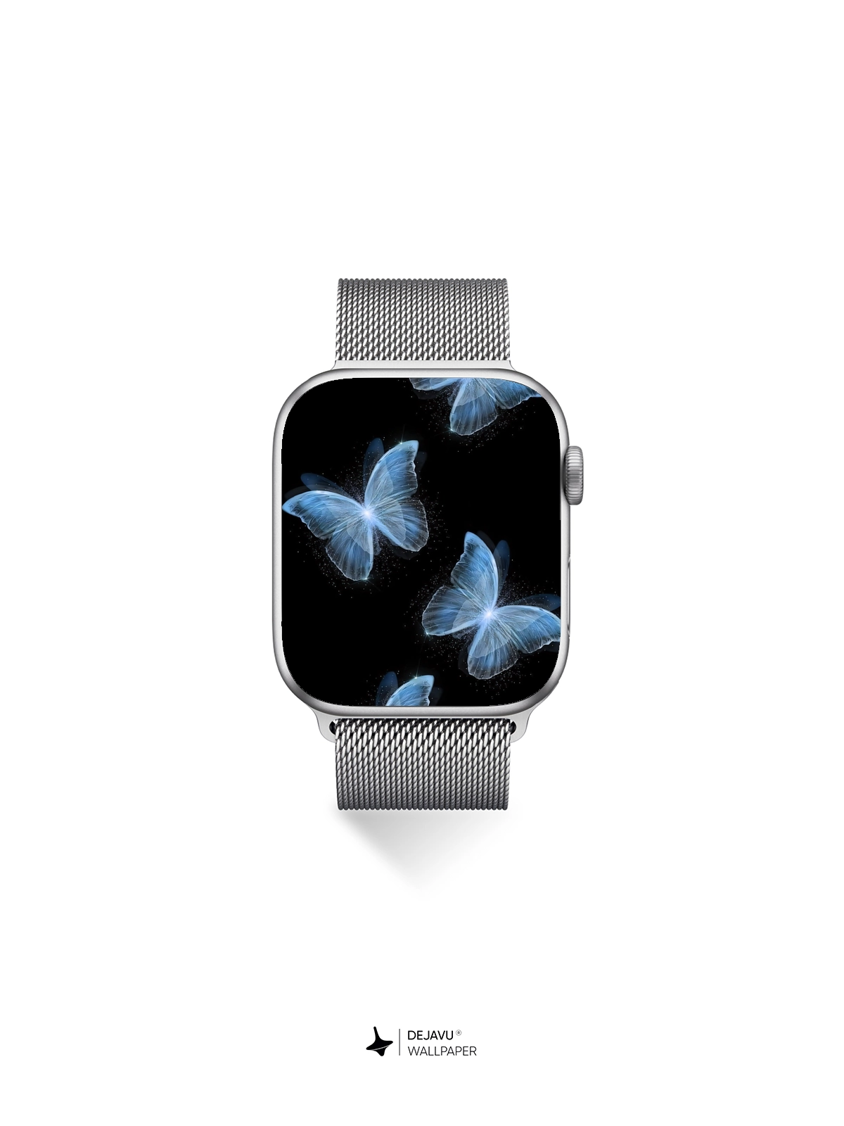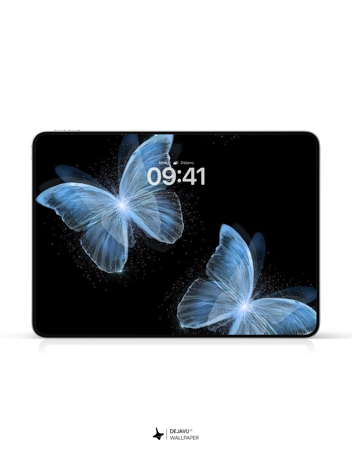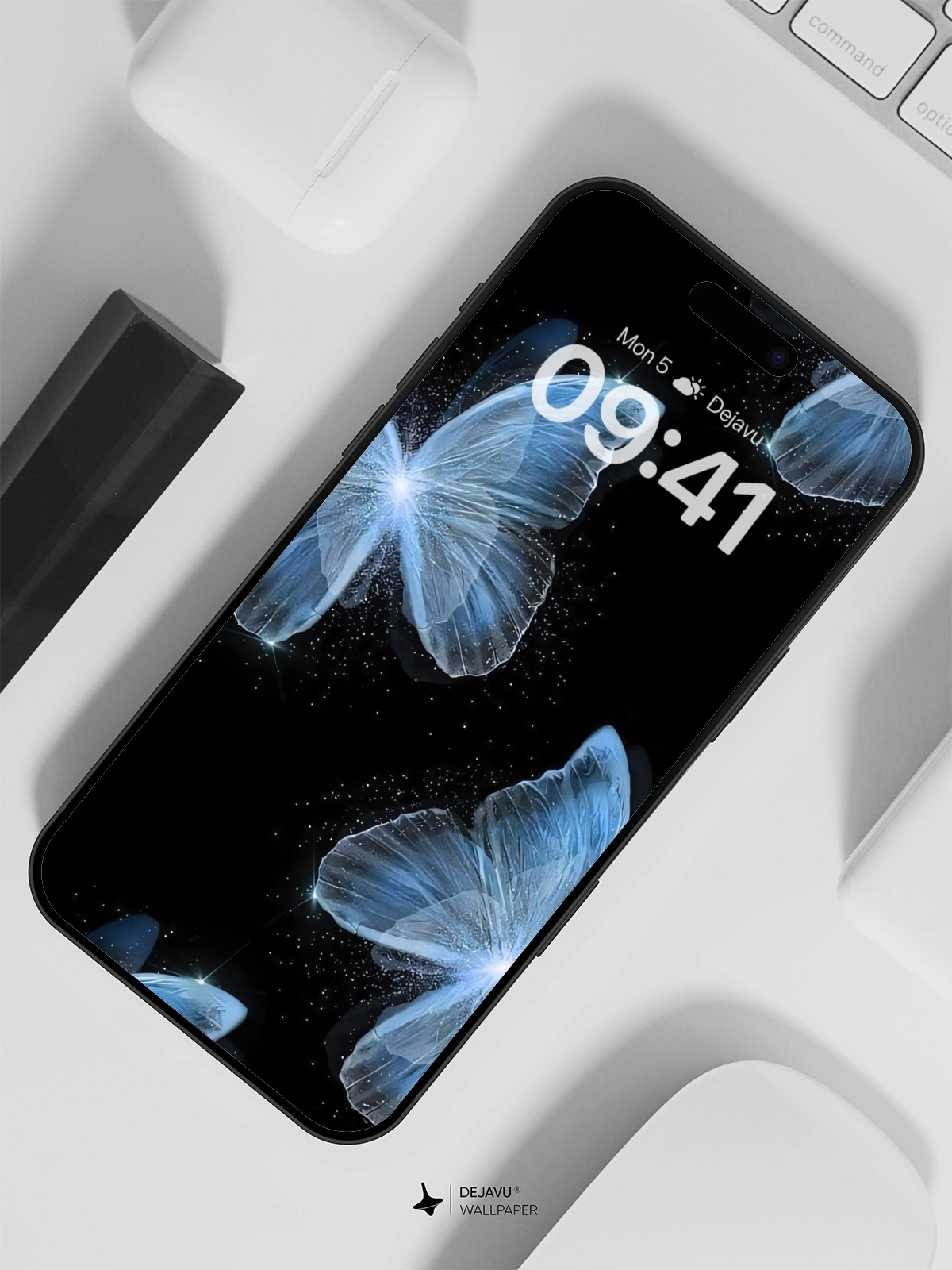 This 8K minimal aesthetic abstract wallpaper showcases glowing blue butterflies with a soft gradient effect against a stark black background. The design is inspired by the ethereal beauty of nature, capturing a sense of tranquility and elegance. Perfect for enhancing the look of your iPhone or Android device, this wallpaper adds a touch of sophistication and calm to your screen.