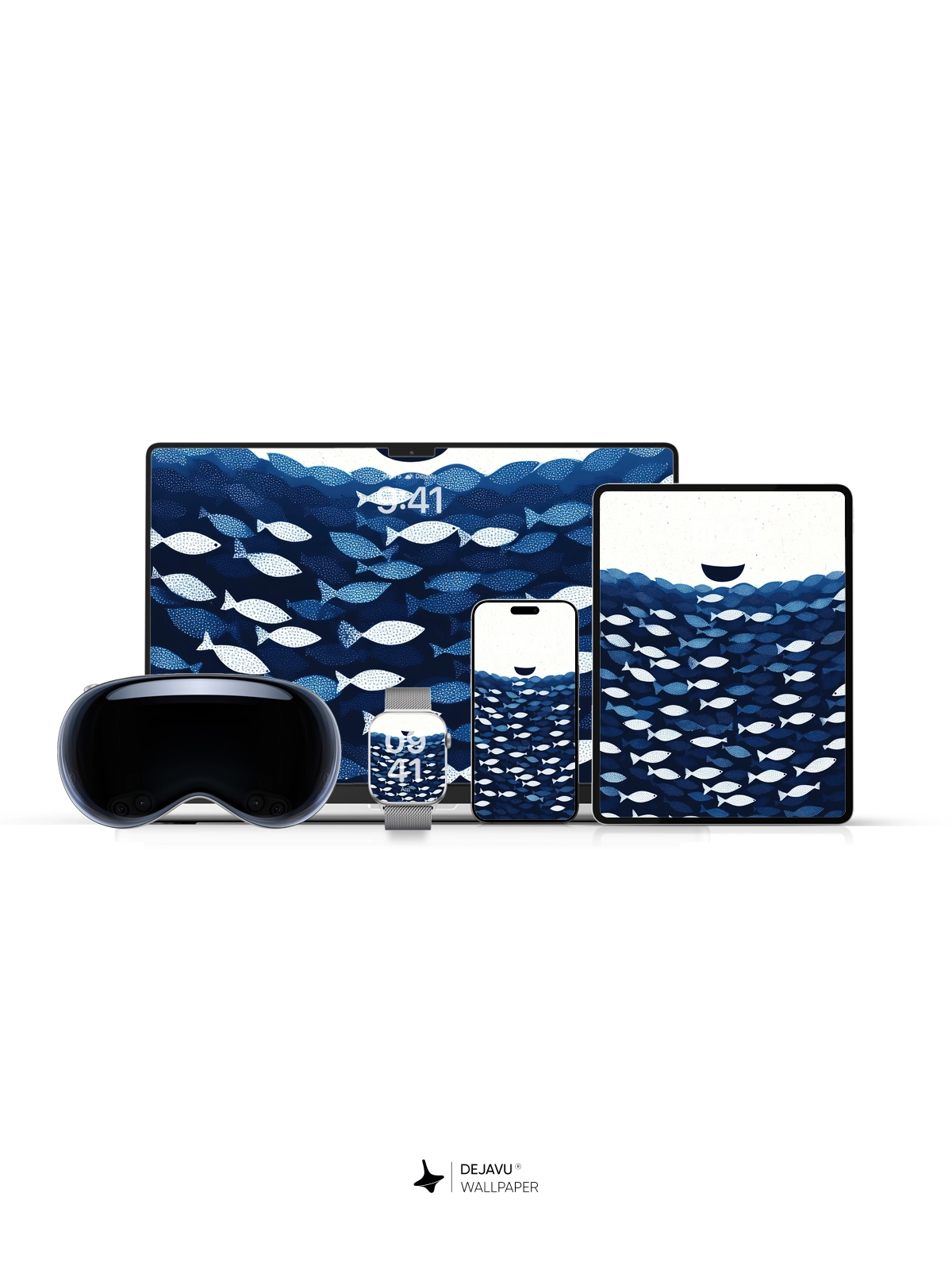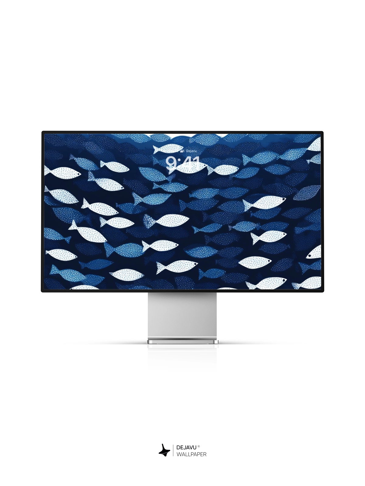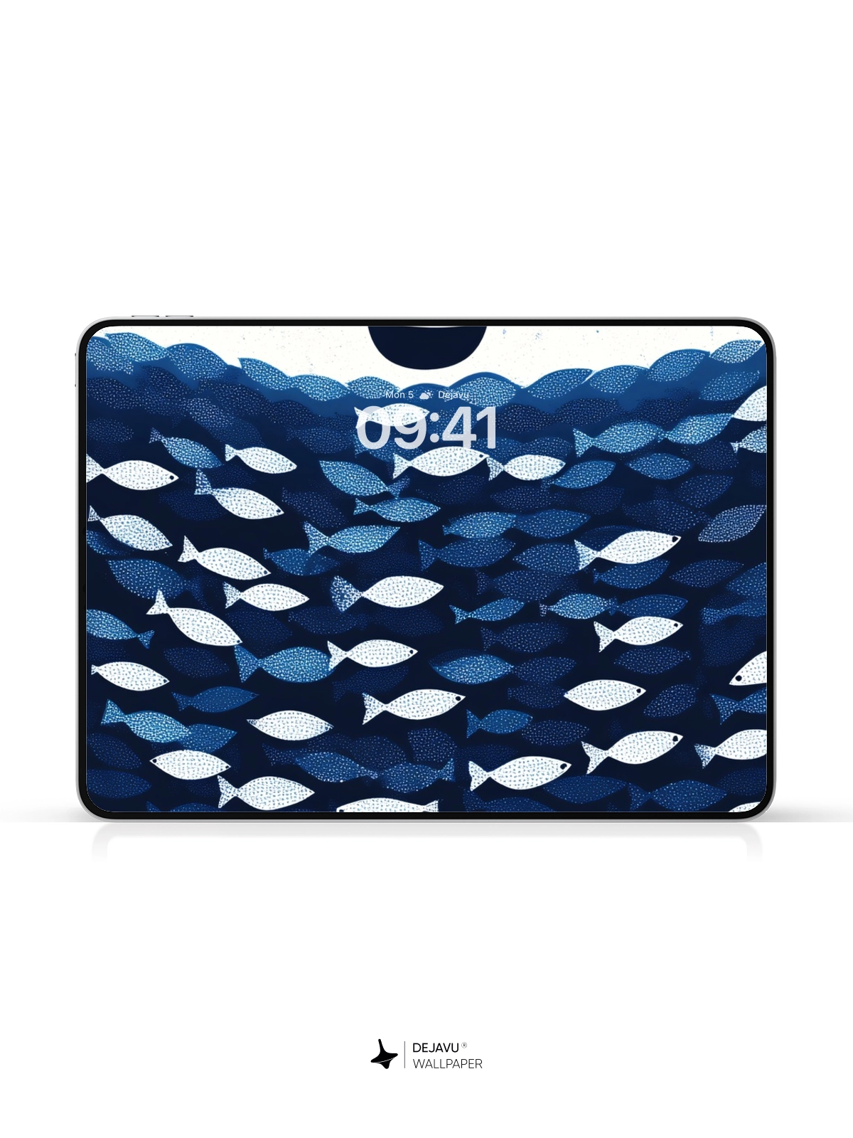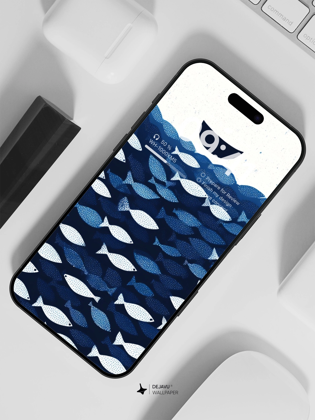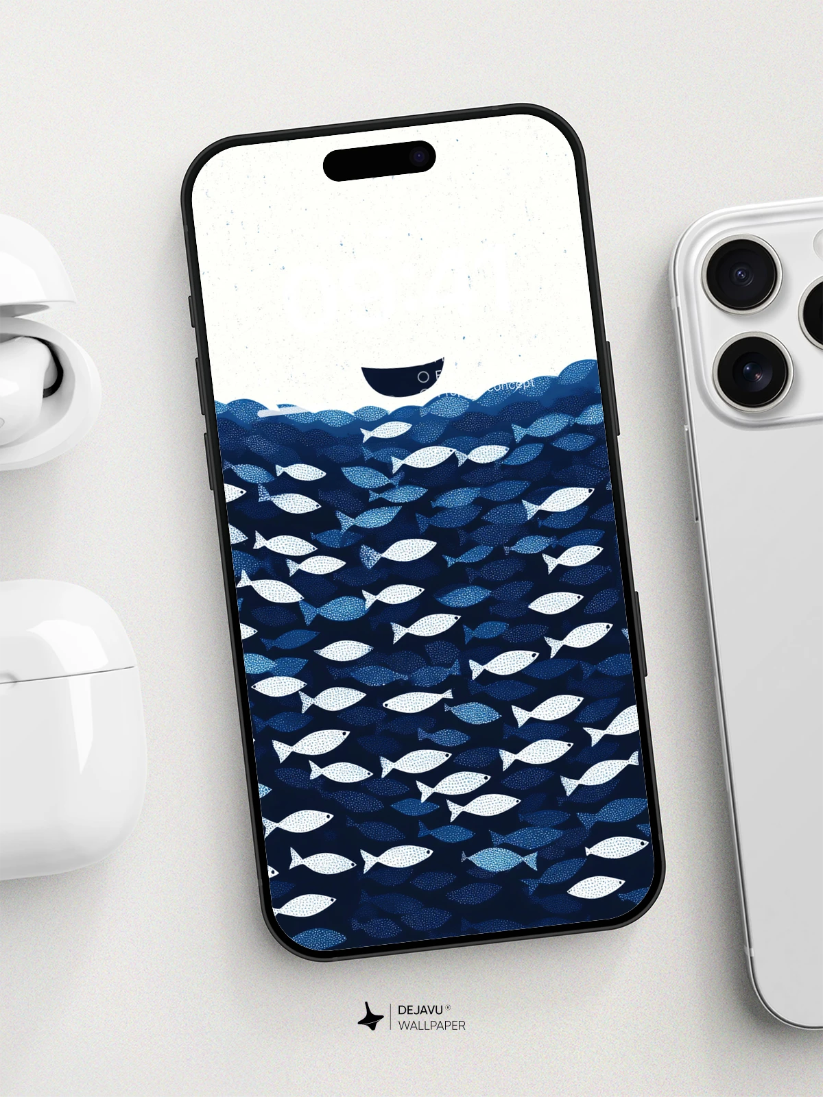 Experience the serene beauty of this 8K minimal aesthetic abstract fish illustration wallpaper. The design captures the essence of a tranquil sea filled with fish, complemented by a subtle boat silhouette. This wallpaper is ideal for enhancing the look of your iPhone or Android device, offering a blend of simplicity and elegance.