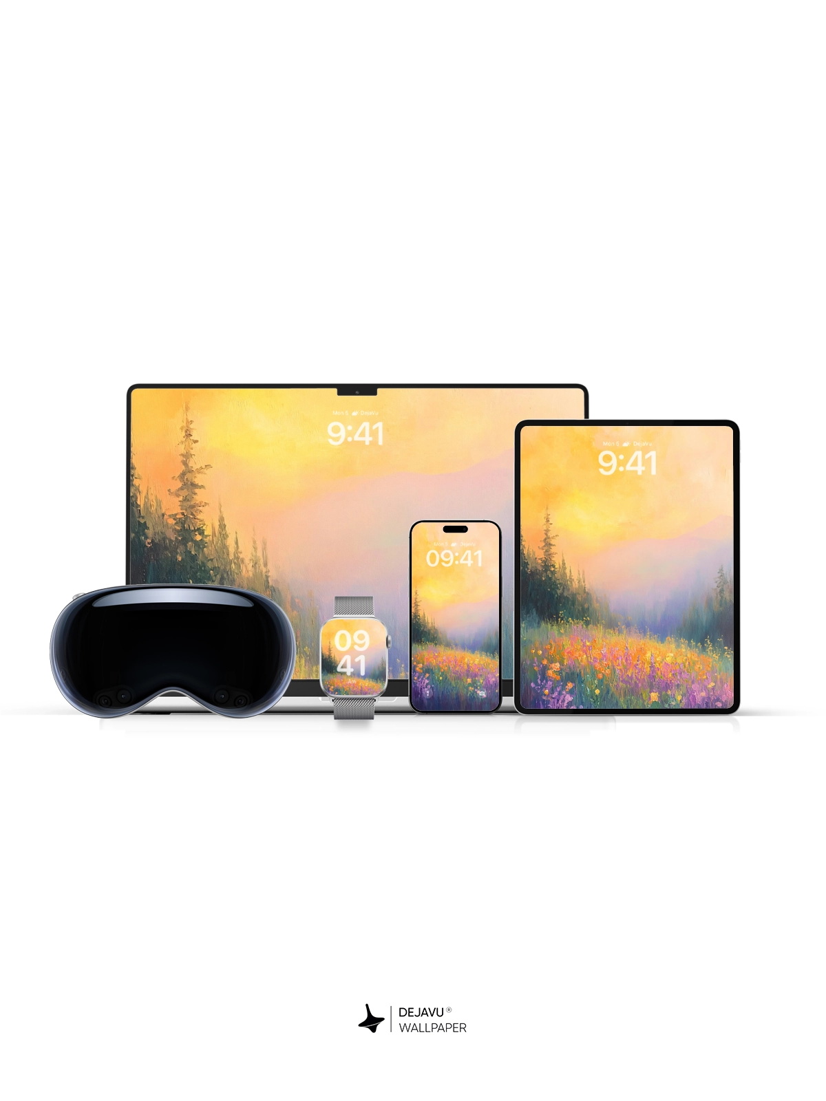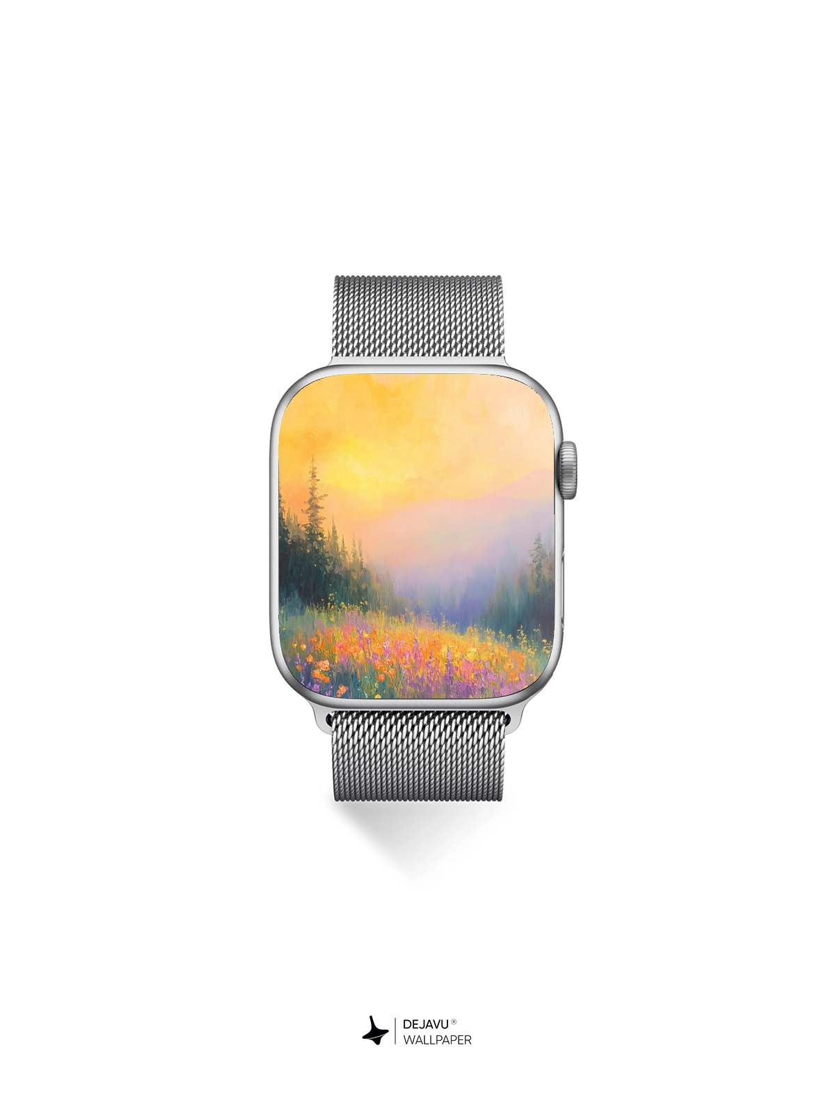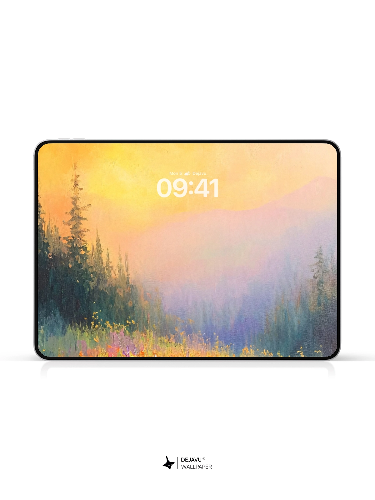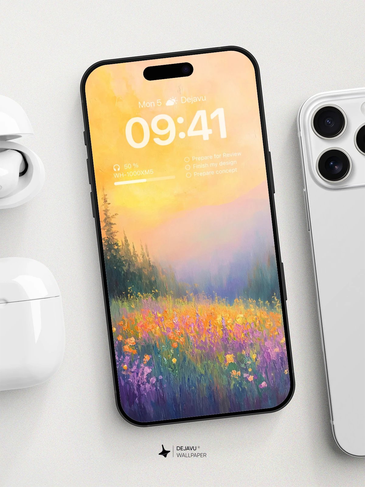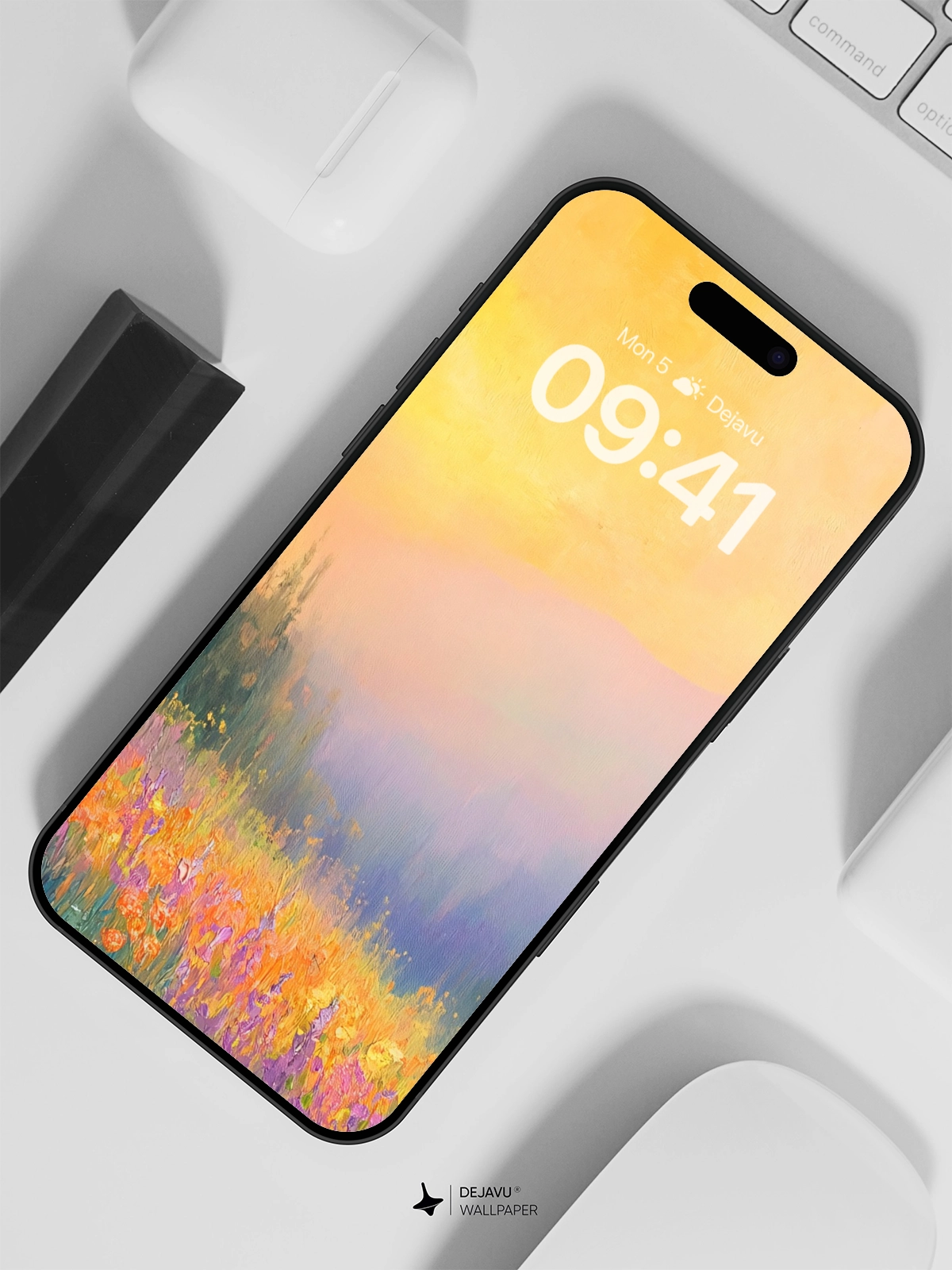 This 8K minimal aesthetic abstract painting wallpaper features a tranquil landscape with vibrant wildflowers in the foreground and a golden sunset in the background. The soft gradient colors and detailed brushstrokes evoke a sense of calm and beauty. Perfect for enhancing the screens of your iPhone, Android, or tablets.