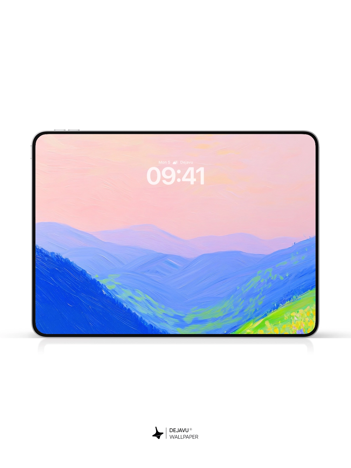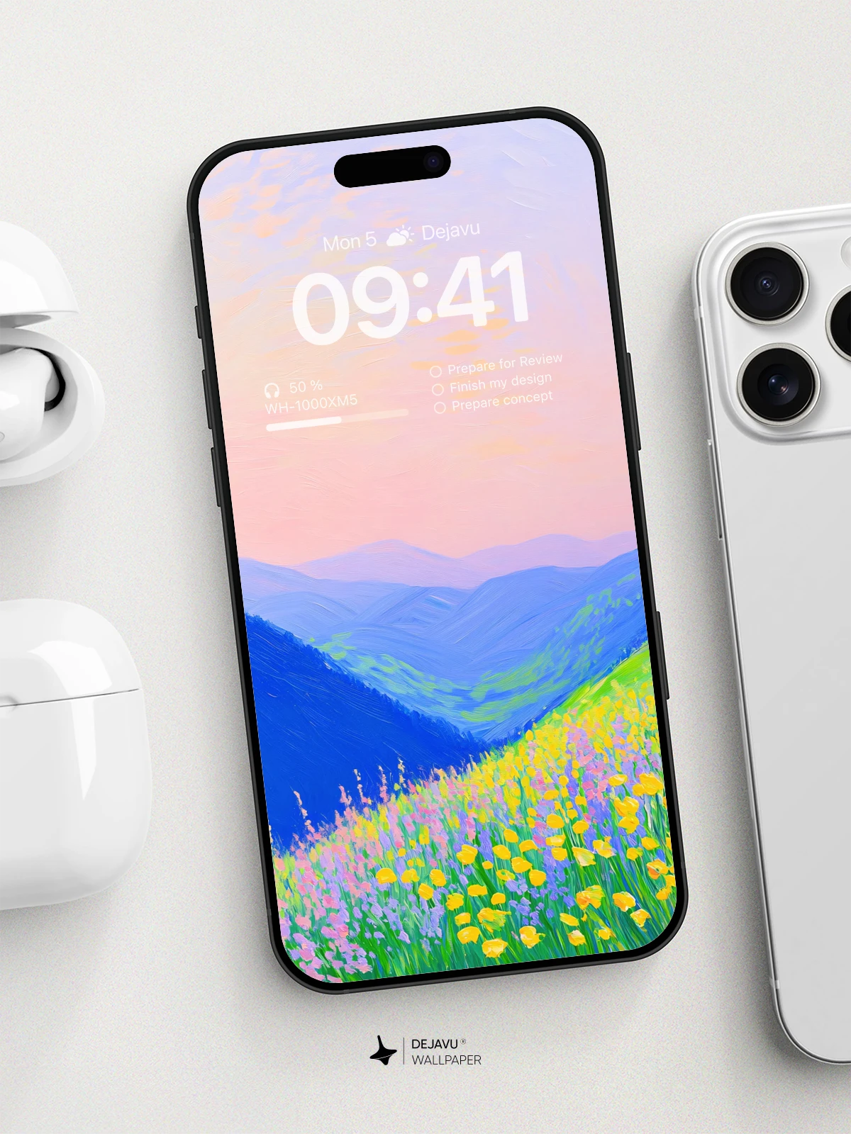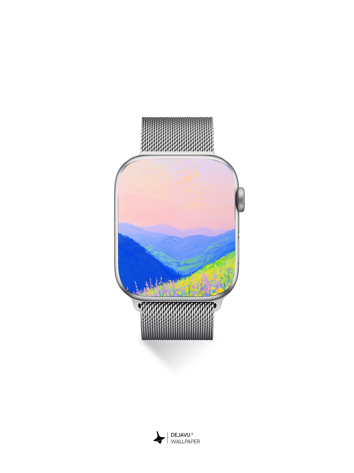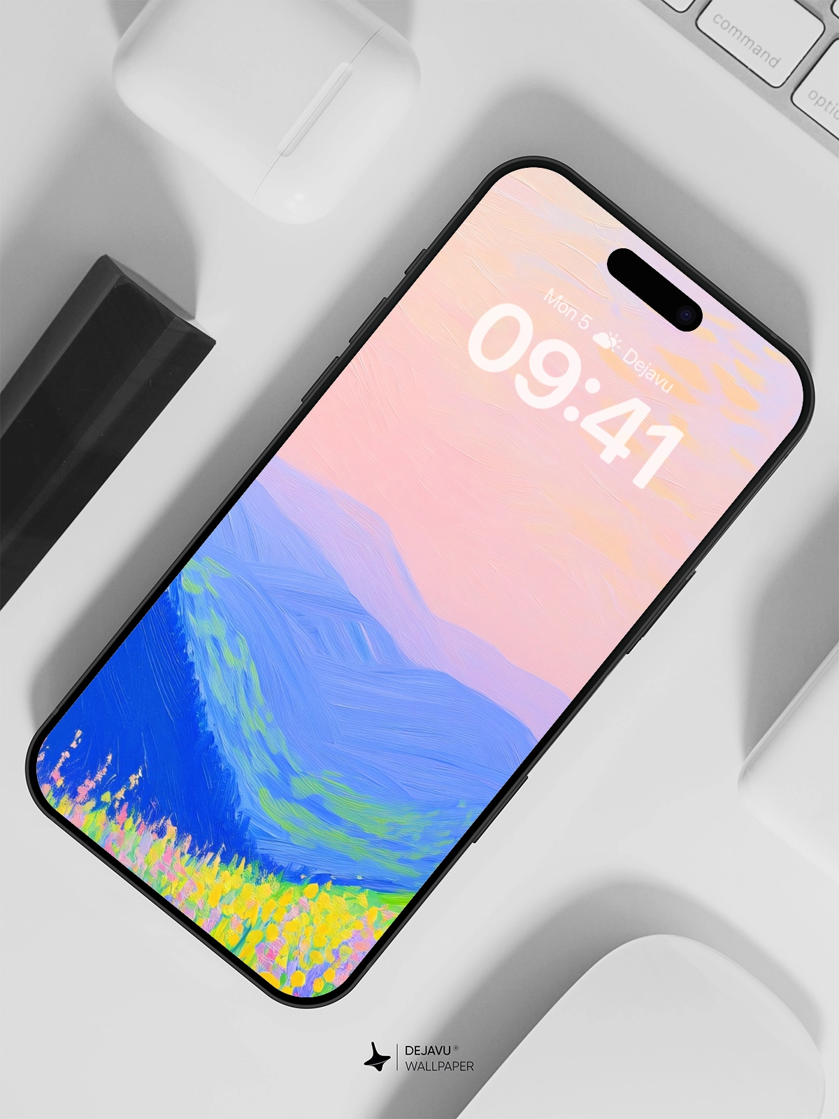 This 8K minimal aesthetic abstract painting wallpaper features a tranquil landscape with vibrant flowers in the foreground and rolling hills in the background. The soft gradient sky adds to the peaceful ambiance. Perfect for enhancing the look of your iPhone, Android, or tablet screens.
