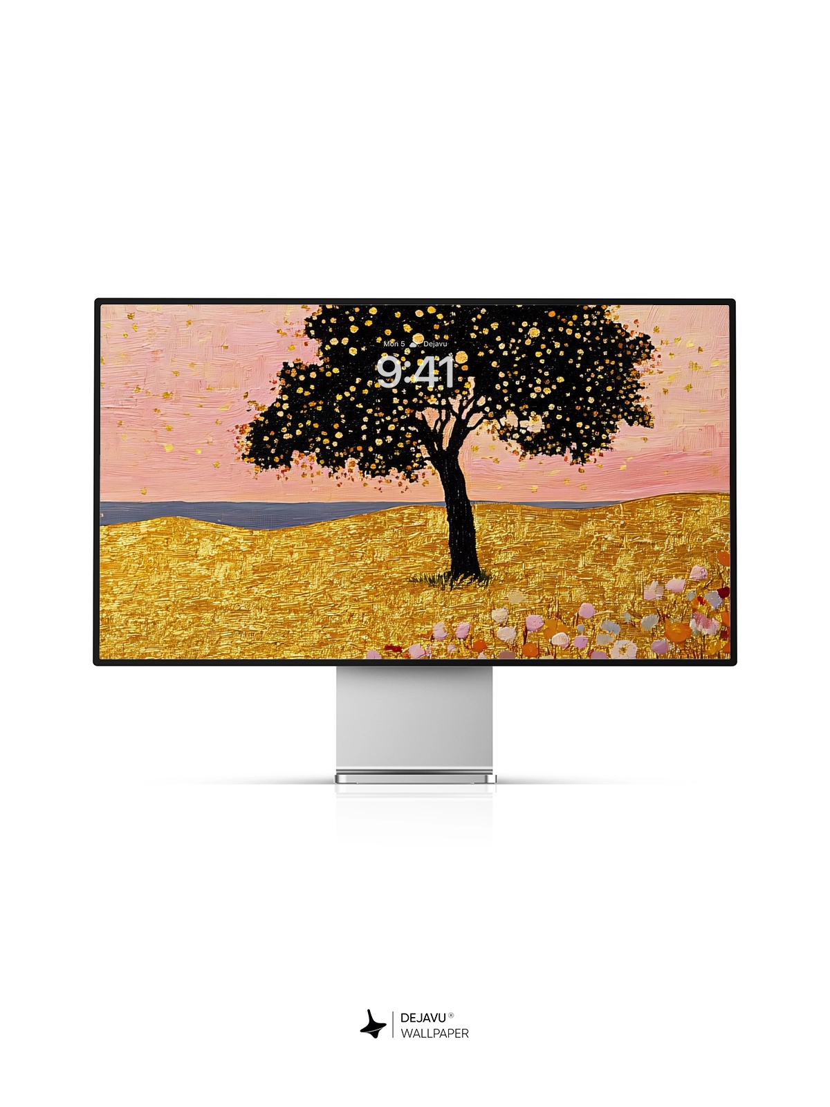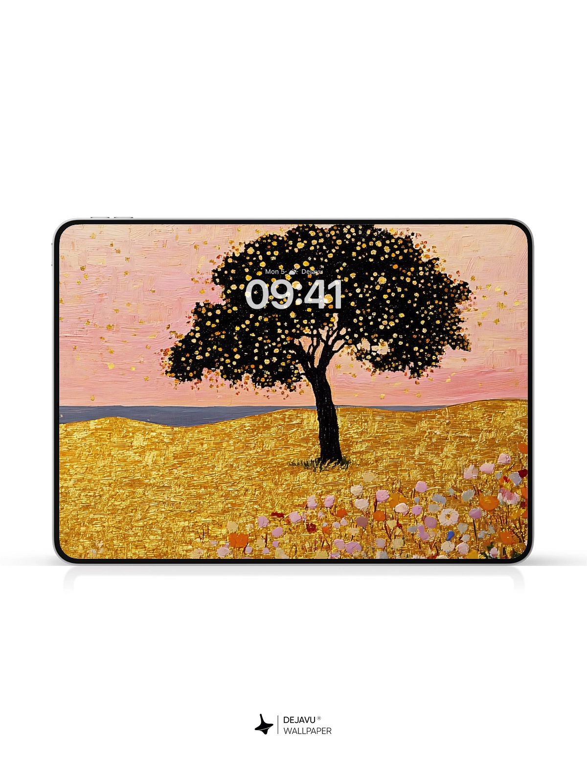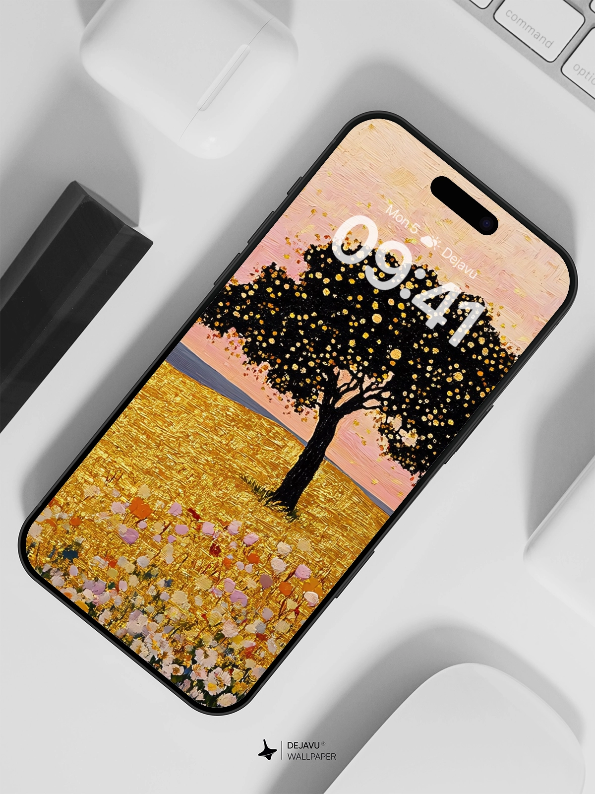 This 8K wallpaper features a beautiful and minimalistic painting of a solitary tree standing tall in a golden field under a soft pink sky. The abstract design evokes a sense of calm and tranquility, making it an ideal aesthetic choice for your iPhone or Android device. The vibrant colors and intricate details create a captivating visual experience that complements any tech gadget.