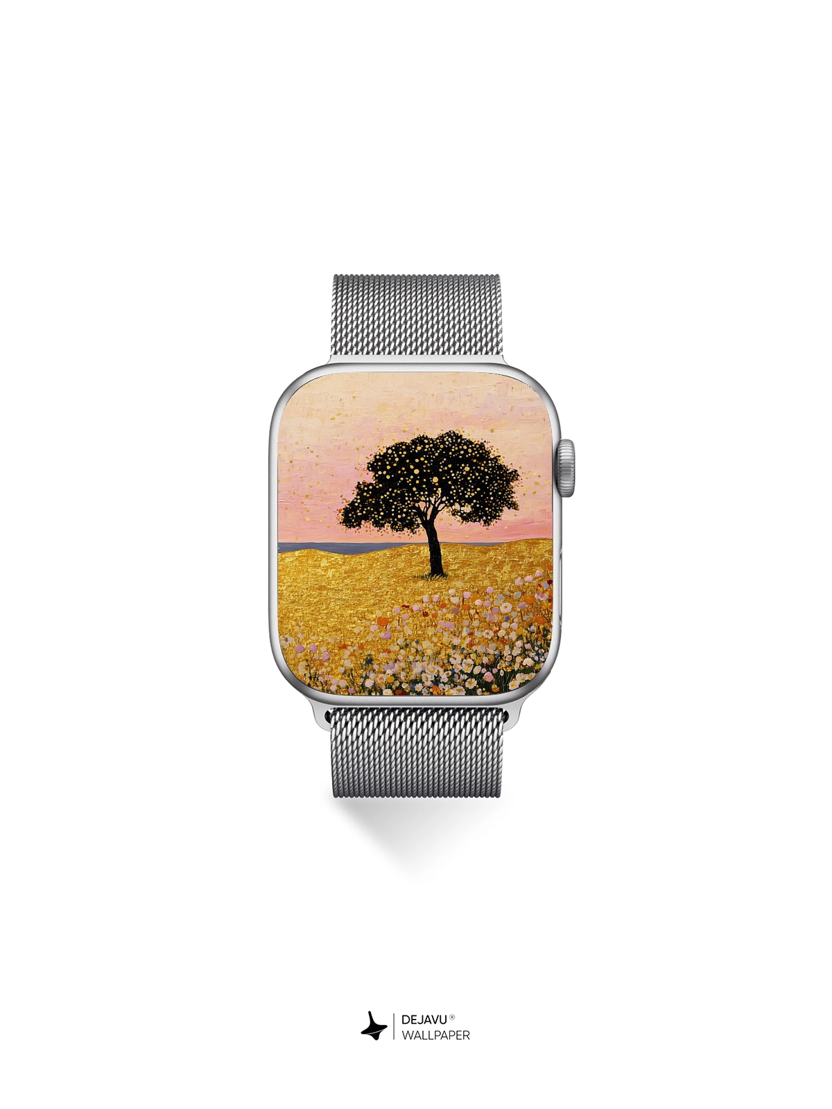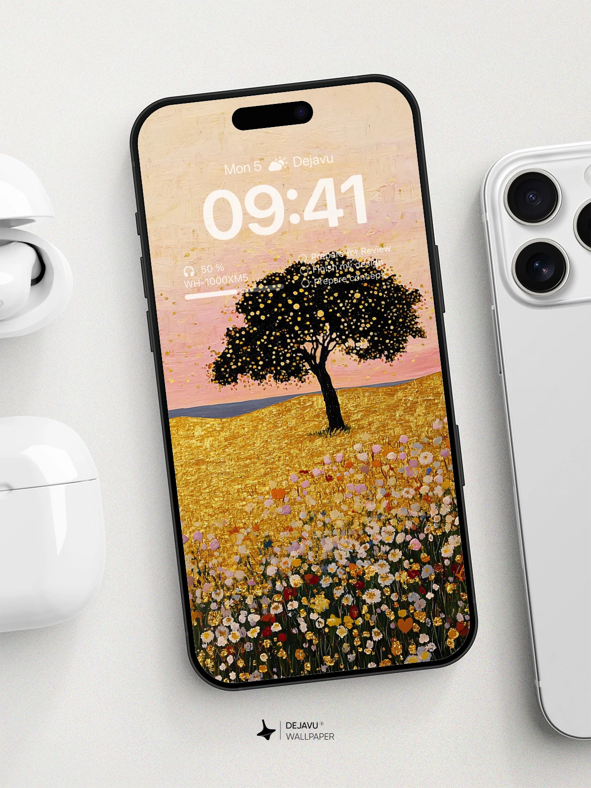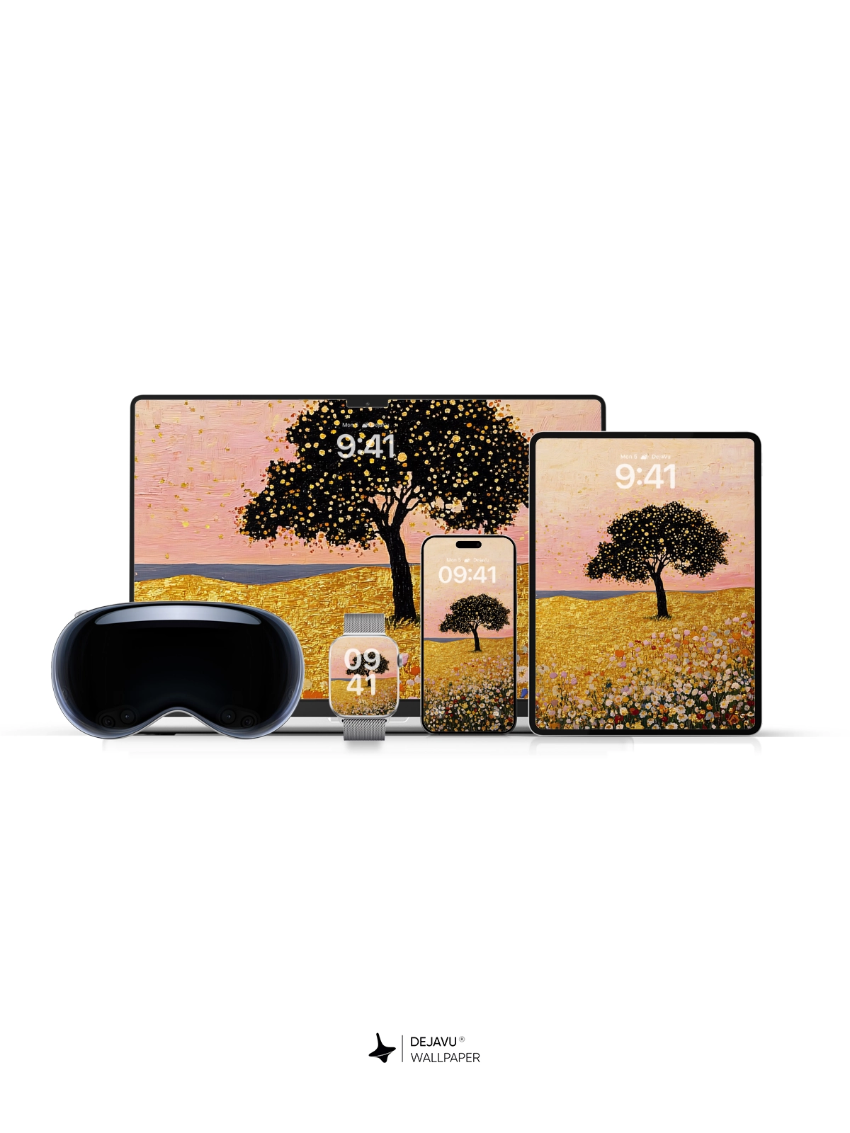 This 8K wallpaper features a beautiful and minimalistic painting of a solitary tree standing tall in a golden field under a soft pink sky. The abstract design evokes a sense of calm and tranquility, making it an ideal aesthetic choice for your iPhone or Android device. The vibrant colors and intricate details create a captivating visual experience that complements any tech gadget.