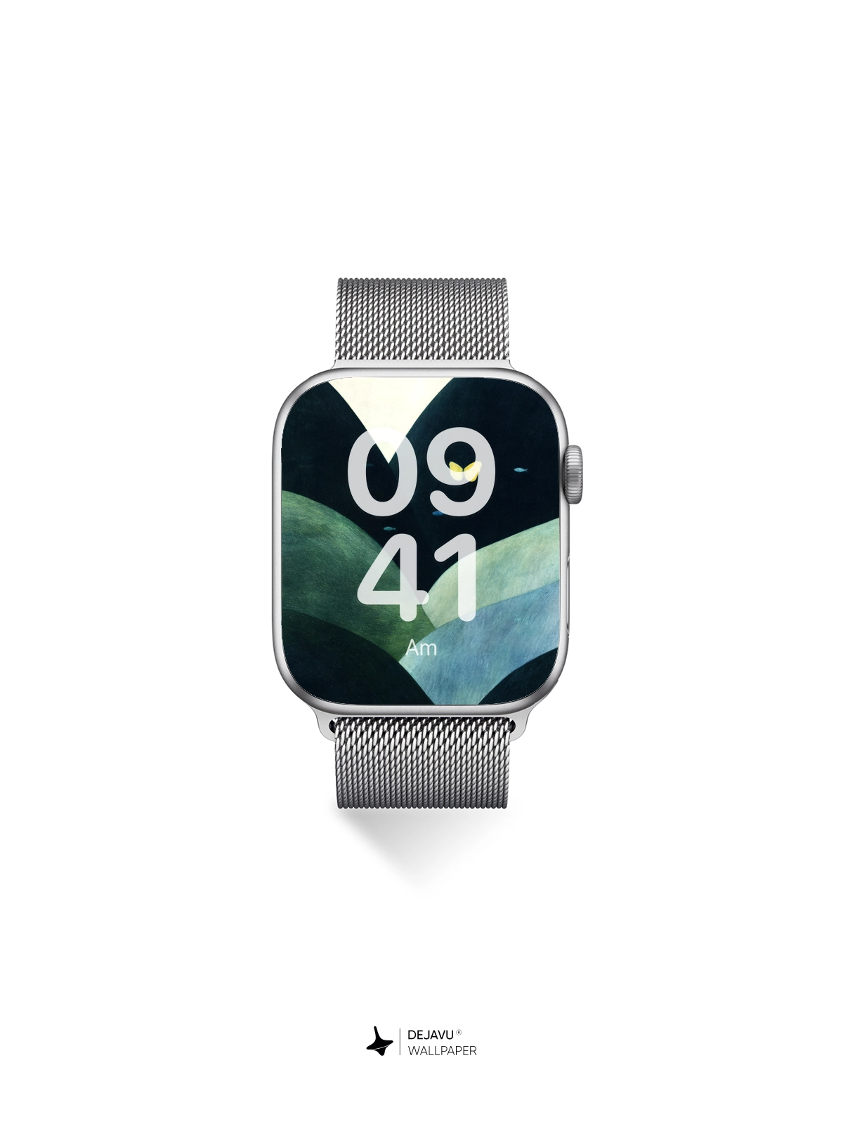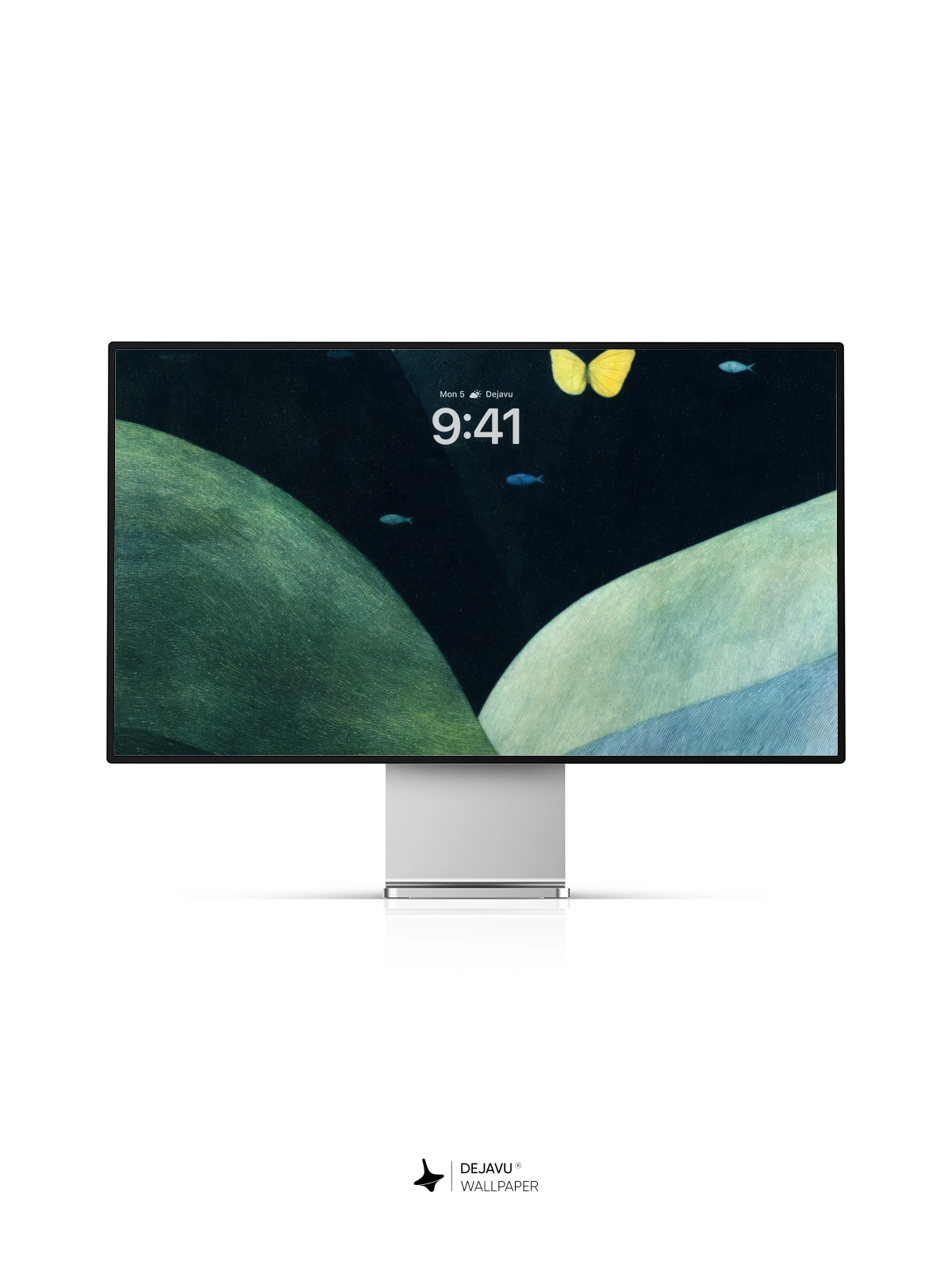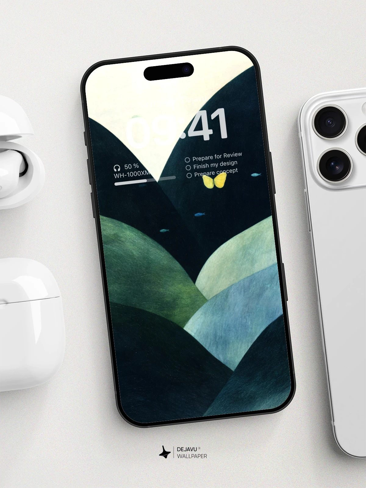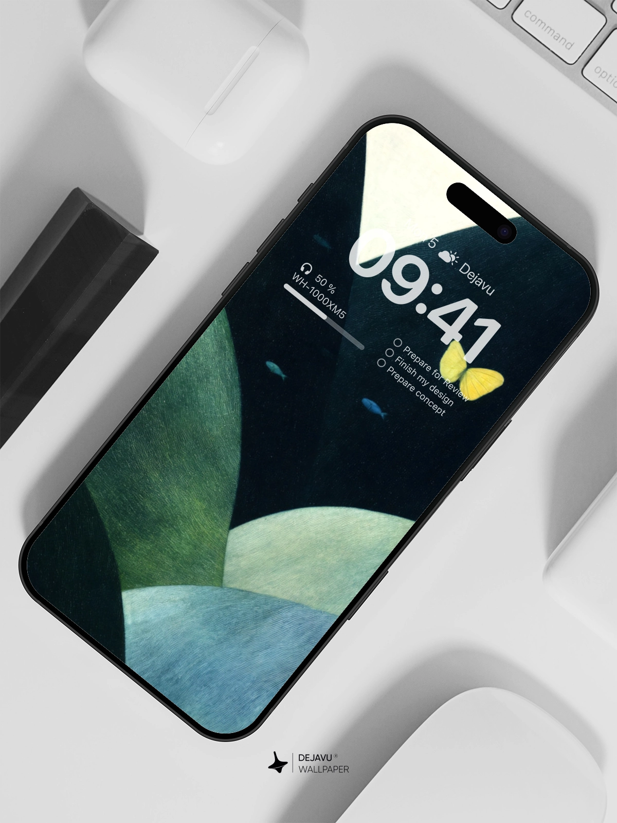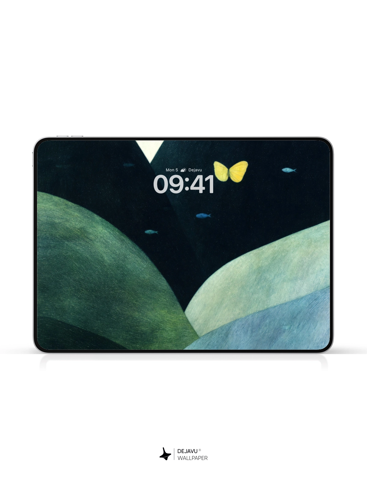 This 8K minimal aesthetic abstract painting wallpaper features a tranquil landscape with a vibrant yellow butterfly and fish swimming through dark, rolling hills. The soft gradient and subtle colors create a calming effect, ideal for enhancing the look of your iPhone or Android device.
