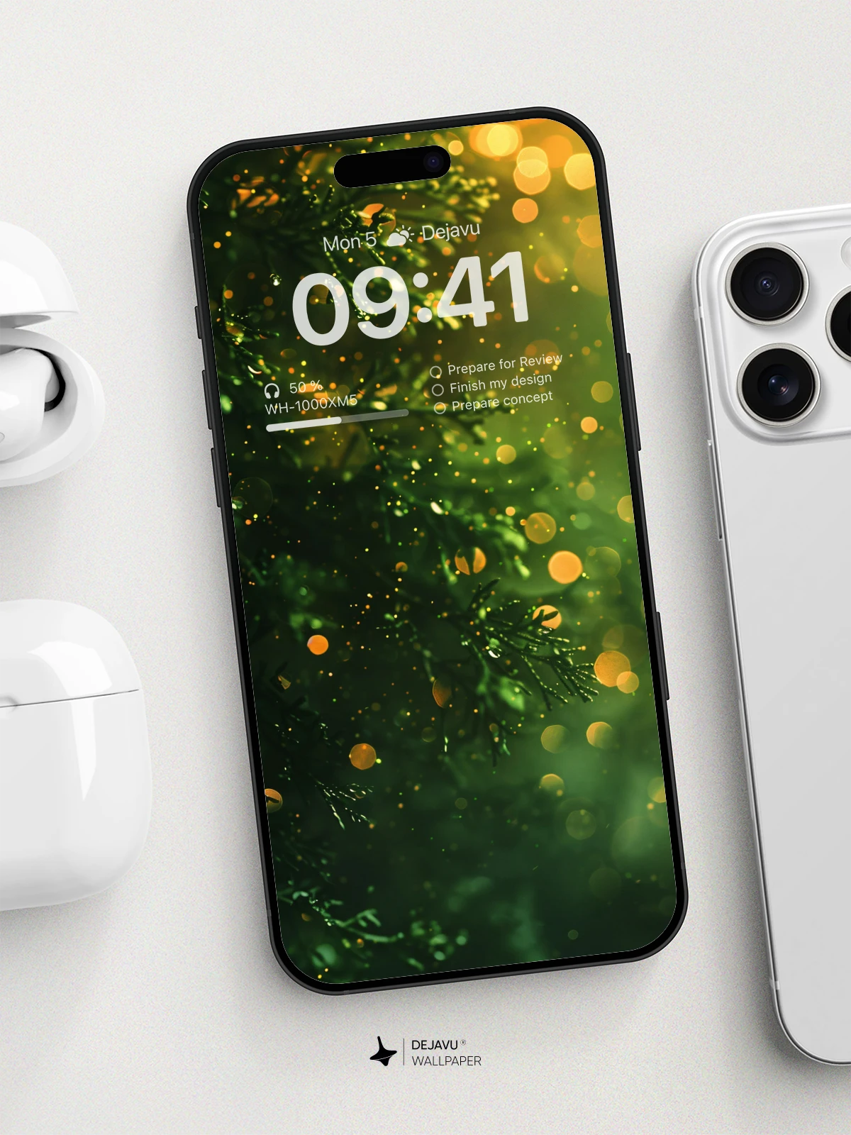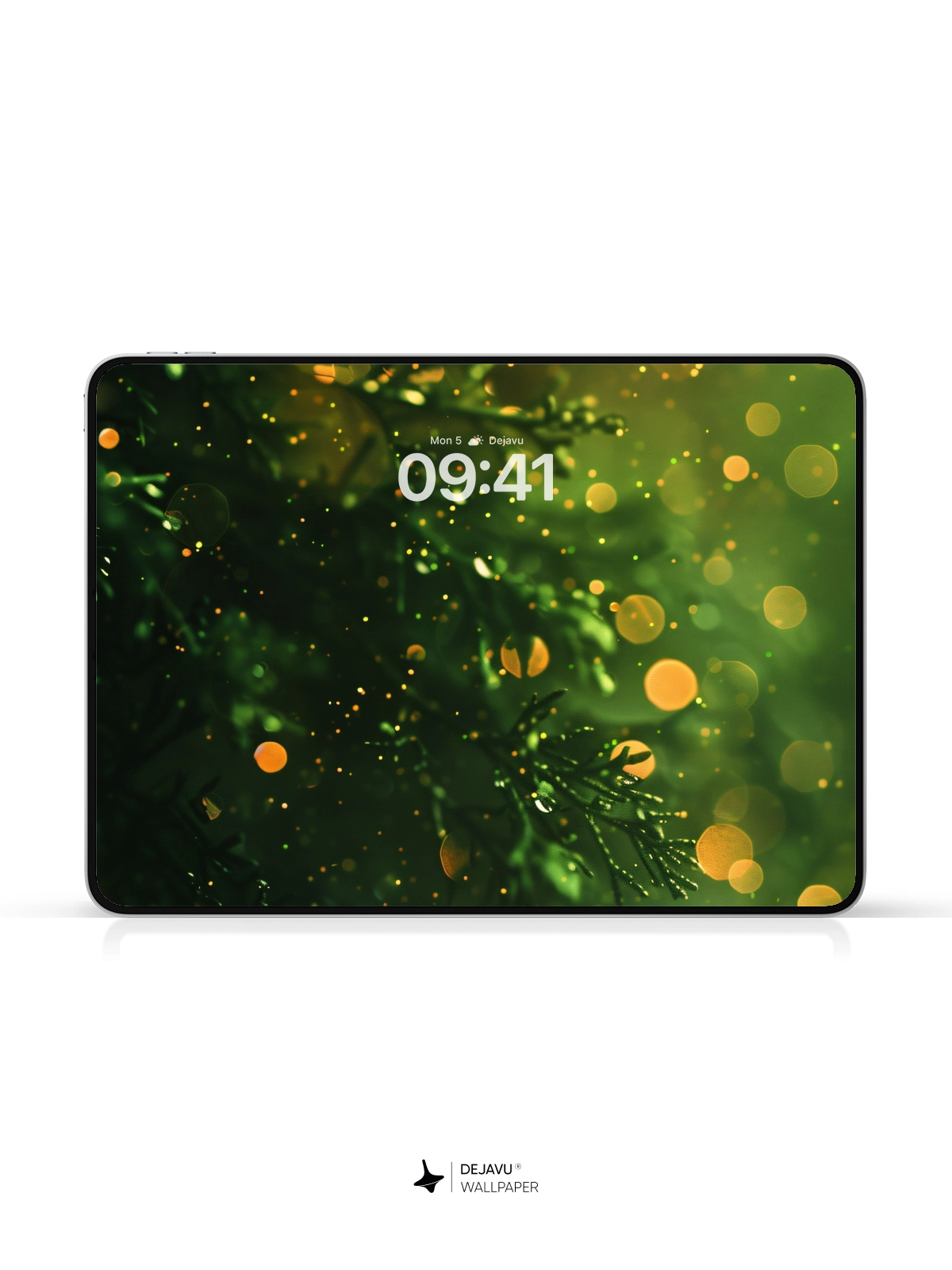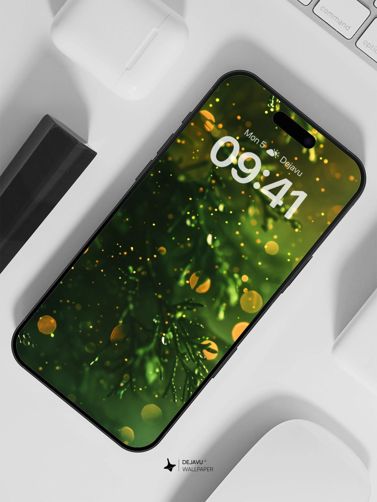 Immerse yourself in the enchanting beauty of nature with this 8K minimal aesthetic wallpaper. The image captures the essence of a lush green forest adorned with sparkling golden bokeh lights, creating a serene and magical atmosphere. Perfect for enhancing the screens of your iPhone, Android, or tablets, this wallpaper brings a touch of natural elegance and tranquility to your device.