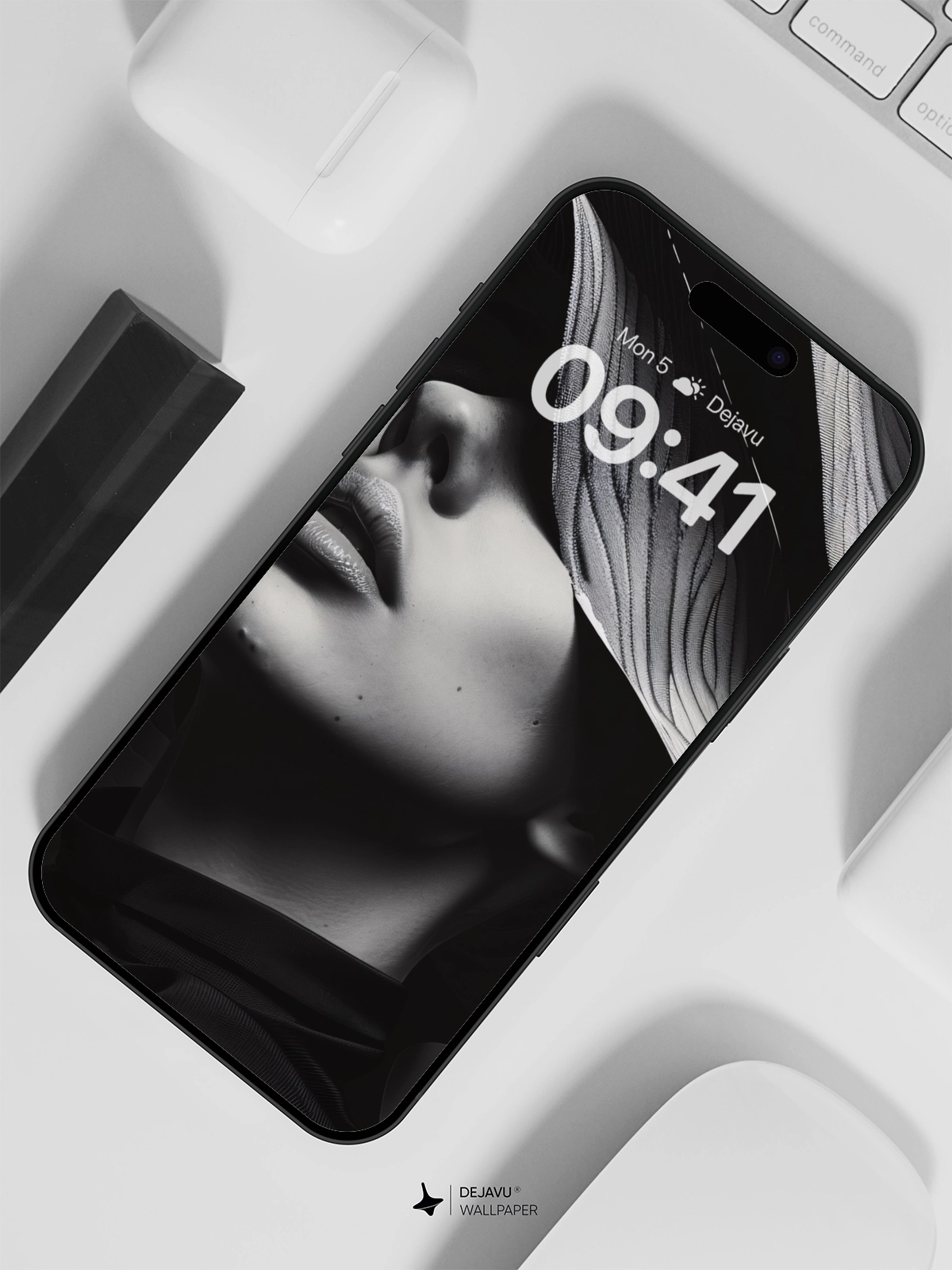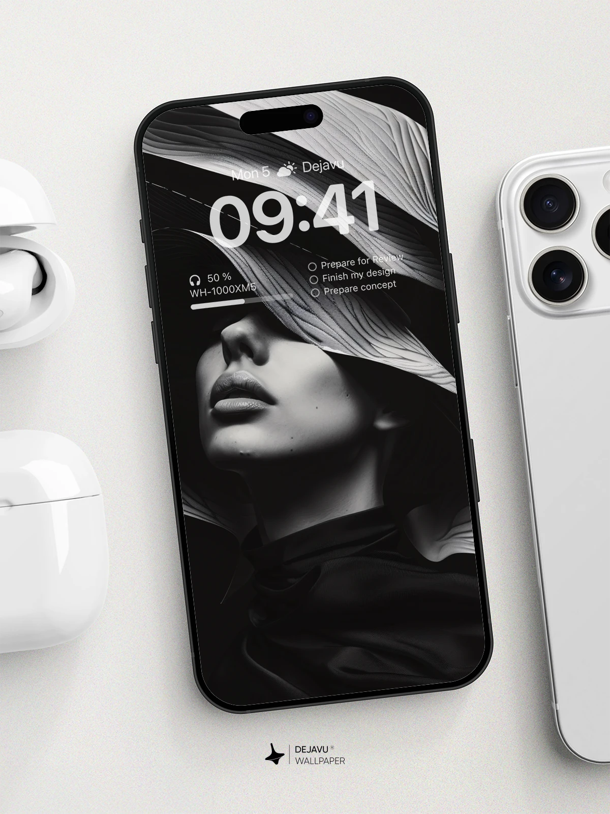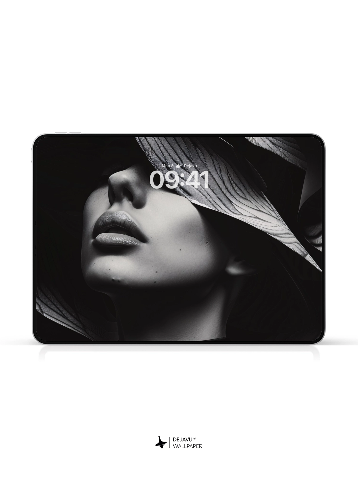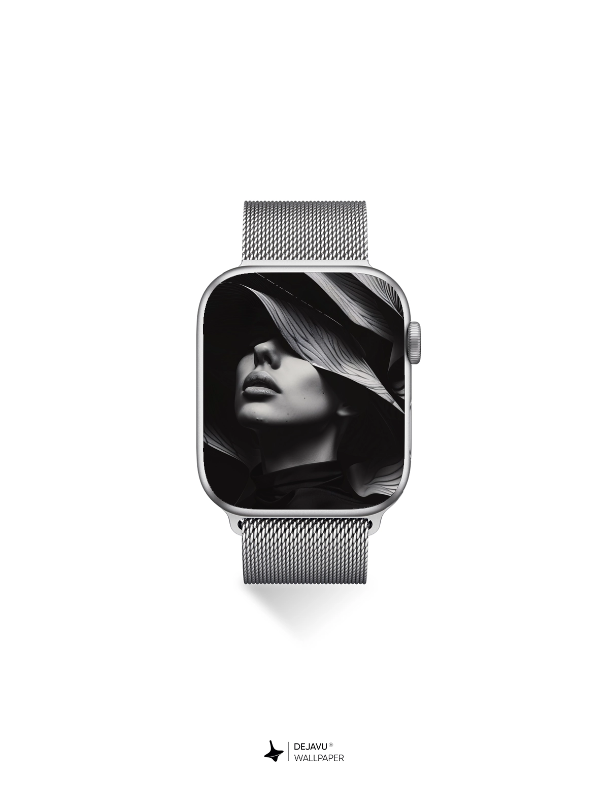 This 8K minimal aesthetic abstract wallpaper showcases an elegant black and white design featuring a woman adorned with a striking, wave-like headpiece. The monochromatic palette and intricate patterns create a sophisticated and modern look, ideal for enhancing the screens of iPhone, Android, and tablet devices.