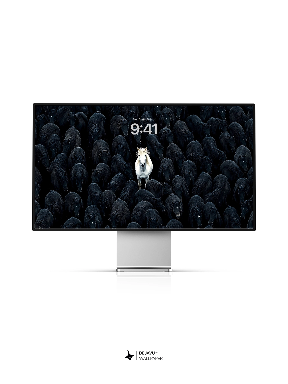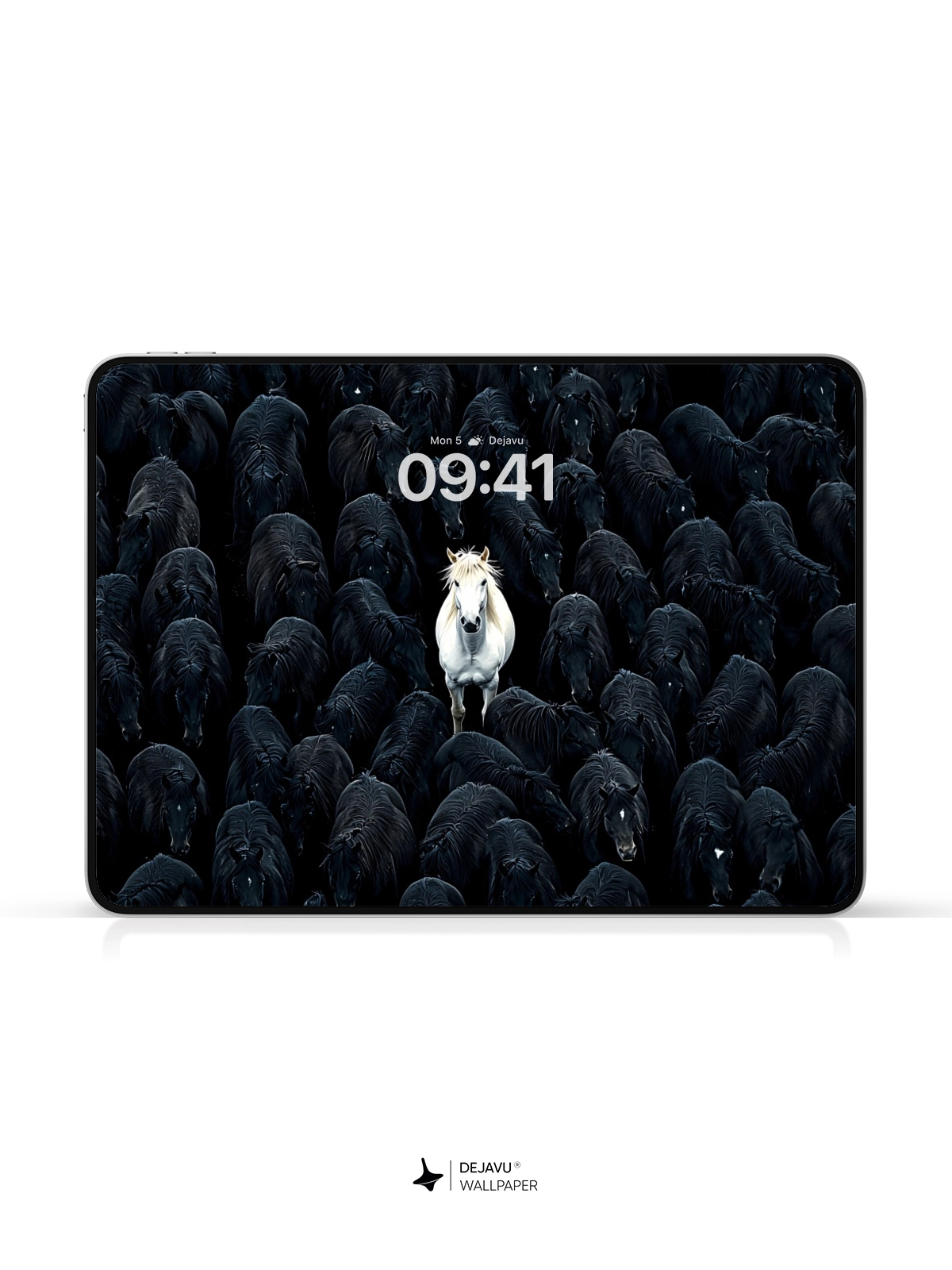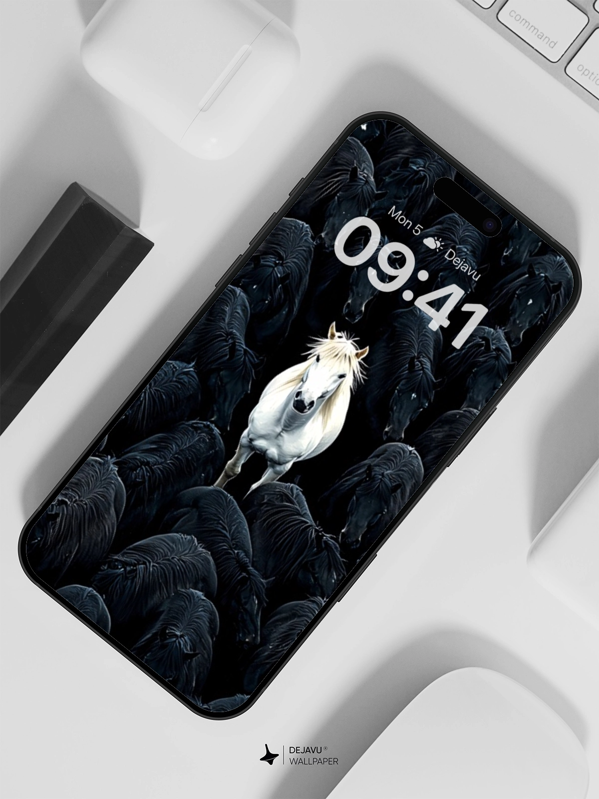 This 8K minimal aesthetic abstract wallpaper captures the unique beauty of a white horse standing out amidst a sea of black horses. The stark contrast creates a powerful visual impact, ideal for tech enthusiasts looking for a wallpaper that stands out on their iPhone, Android, or tablets. The design is inspired by themes of individuality and harmony, evoking a sense of calm and wonder.