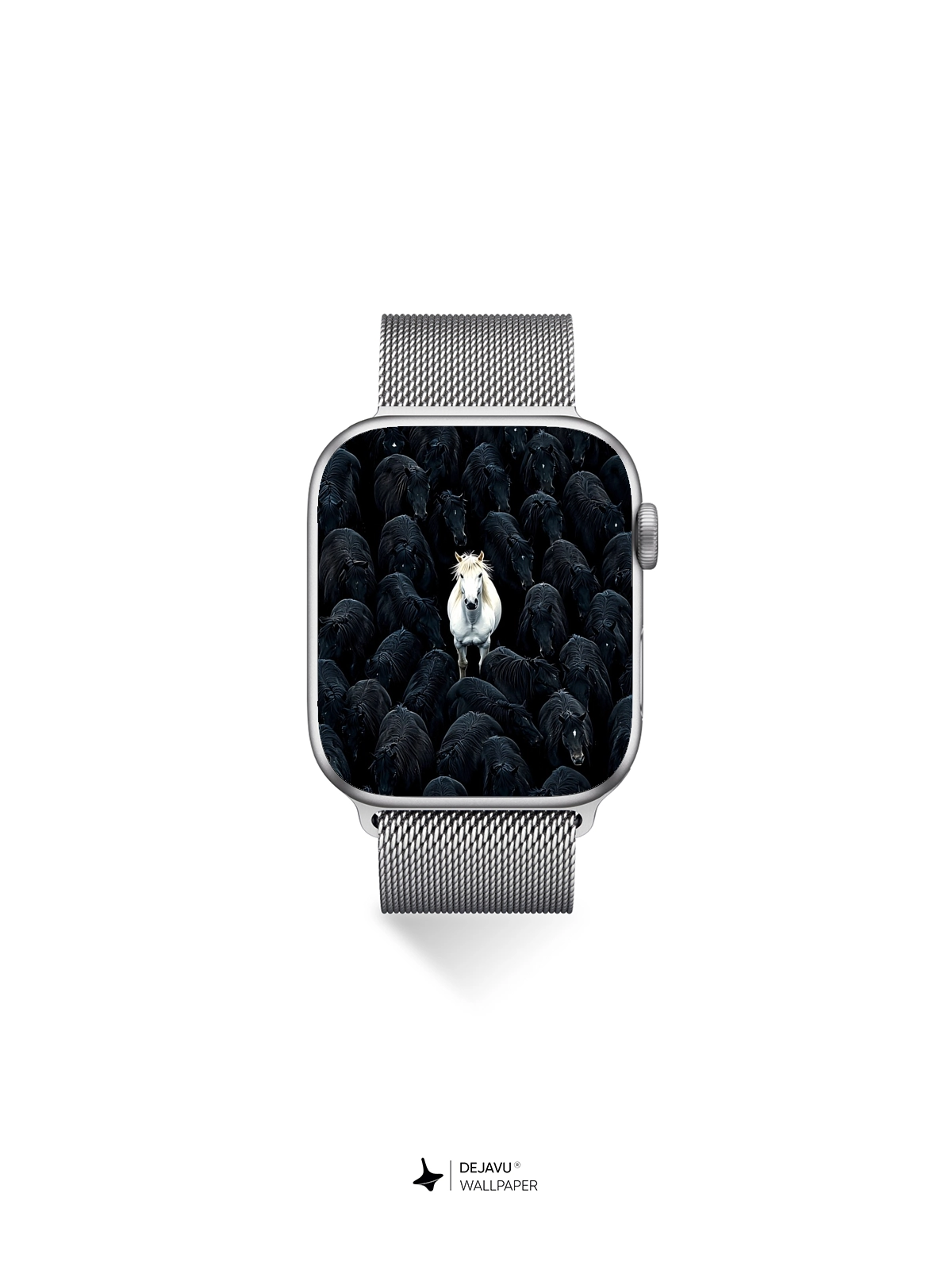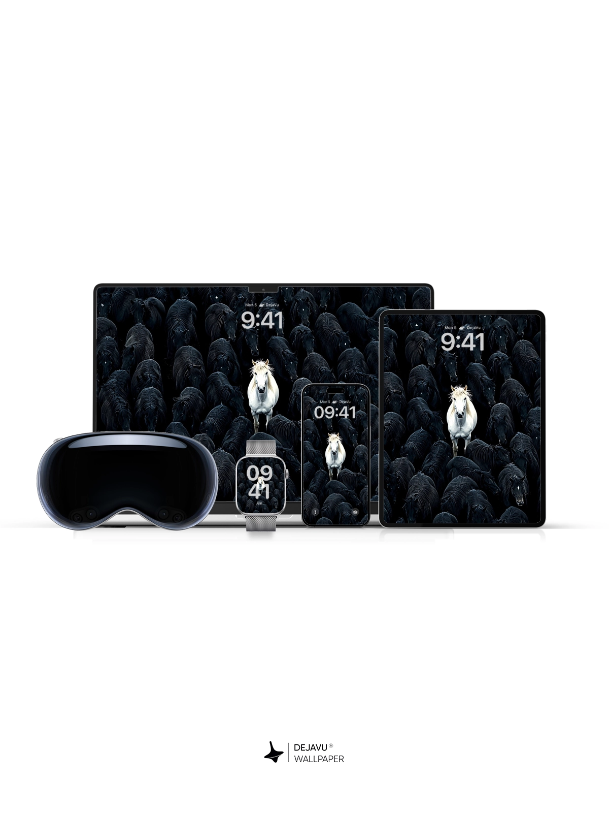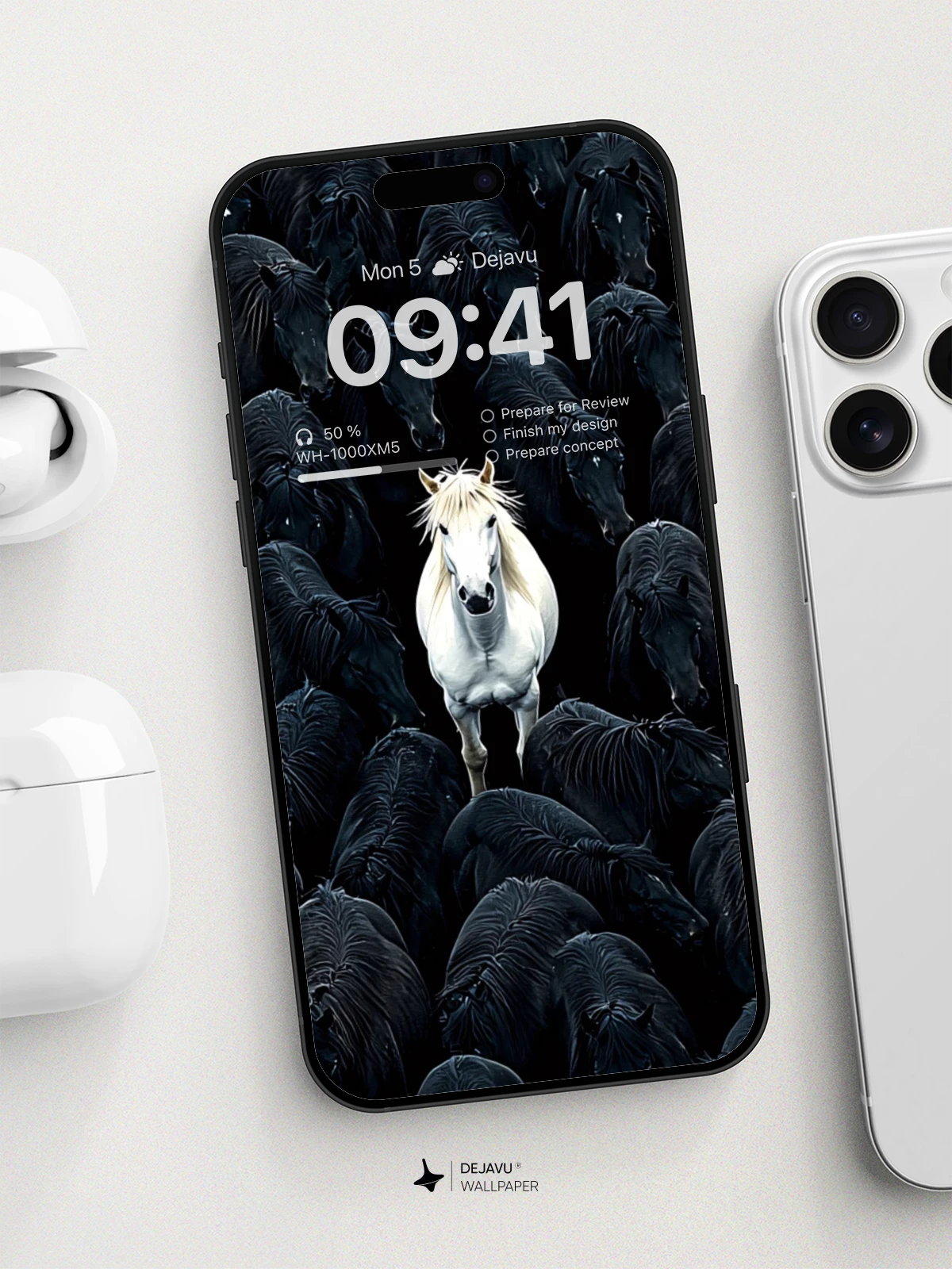 This 8K minimal aesthetic abstract wallpaper captures the unique beauty of a white horse standing out amidst a sea of black horses. The stark contrast creates a powerful visual impact, ideal for tech enthusiasts looking for a wallpaper that stands out on their iPhone, Android, or tablets. The design is inspired by themes of individuality and harmony, evoking a sense of calm and wonder.