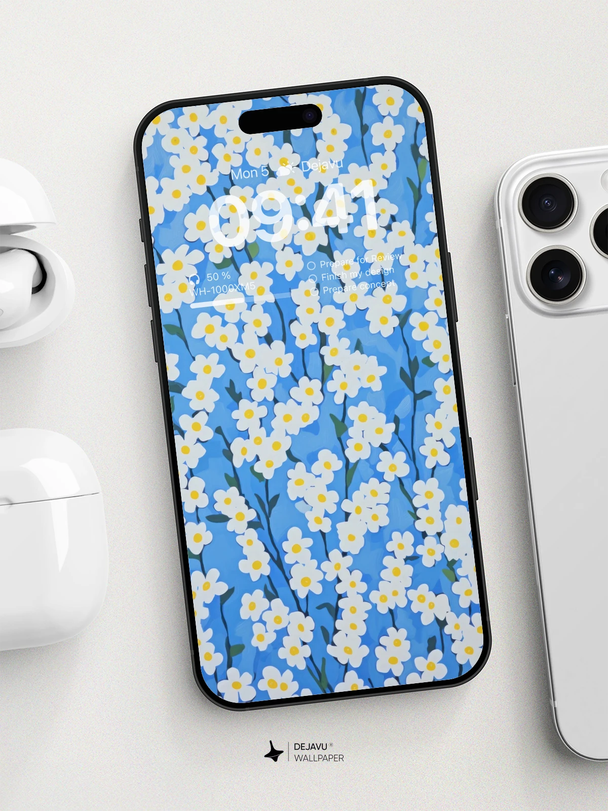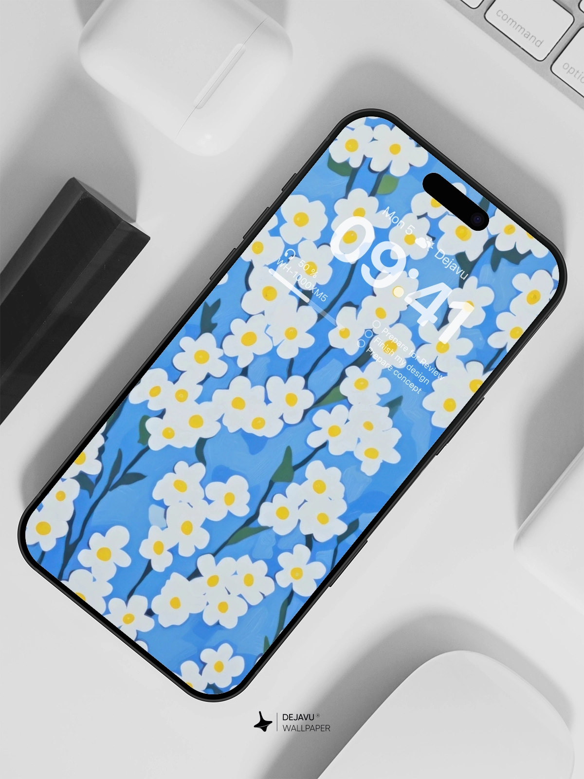 This 8K minimal aesthetic floral wallpaper showcases a beautiful array of white flowers with yellow centers set against a calming blue background. The design is perfect for adding a touch of nature and tranquility to your iPhone, Android, or tablet screens. The high-resolution image ensures crisp and clear visuals, making it an ideal choice for those who appreciate both simplicity and beauty in their digital wallpapers.