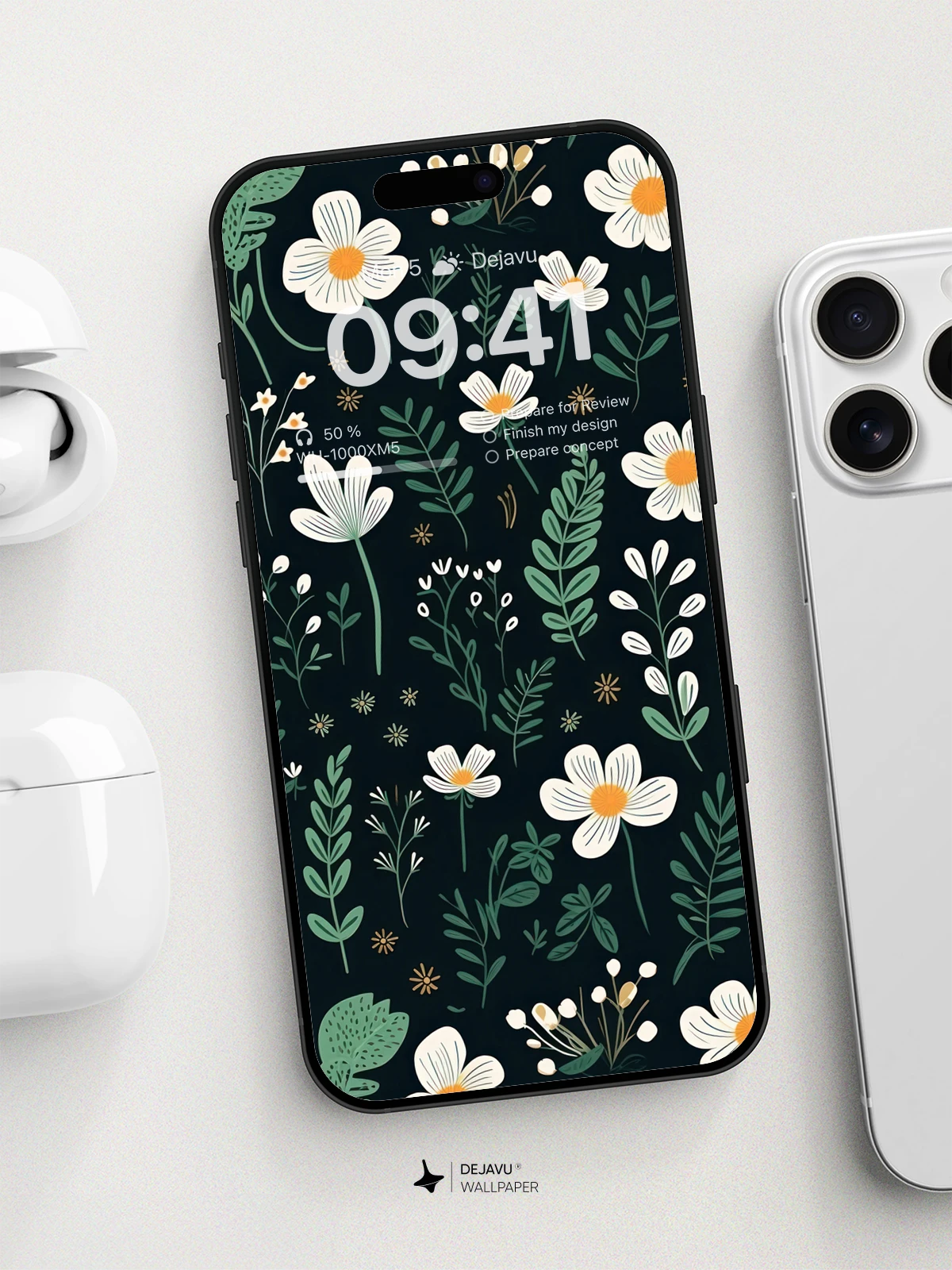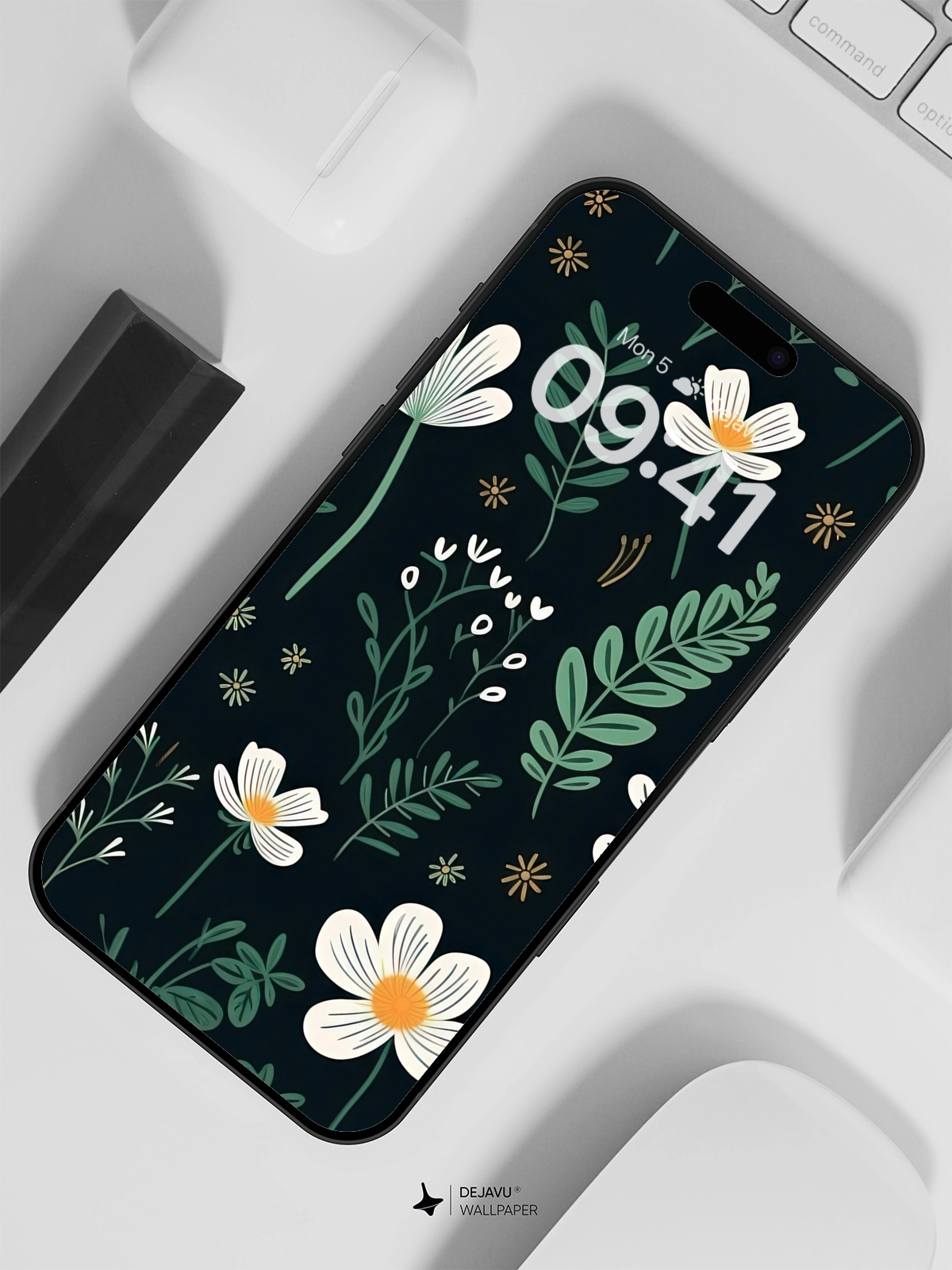 This 8K minimal aesthetic wallpaper features a beautiful arrangement of white flowers and green leaves against a dark backdrop. The design is inspired by nature, evoking a sense of calm and tranquility. Perfect for enhancing the look of your iPhone or Android device with its high-resolution and soothing colors.