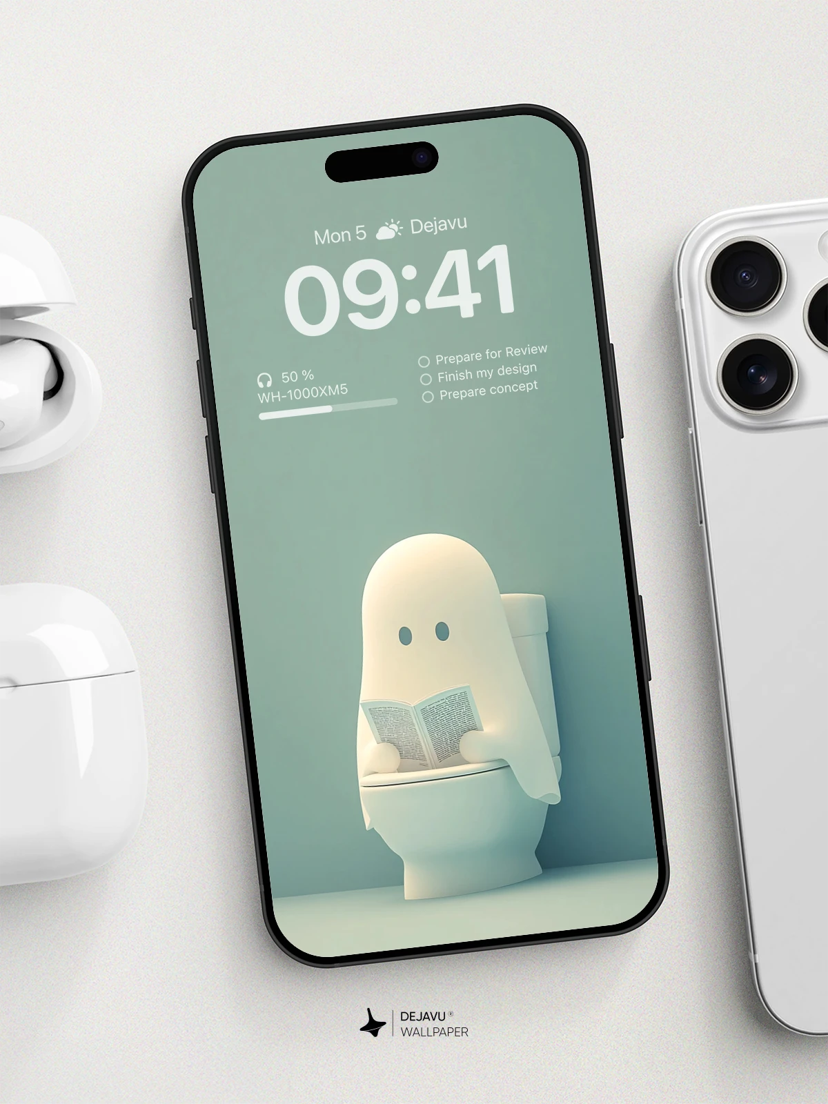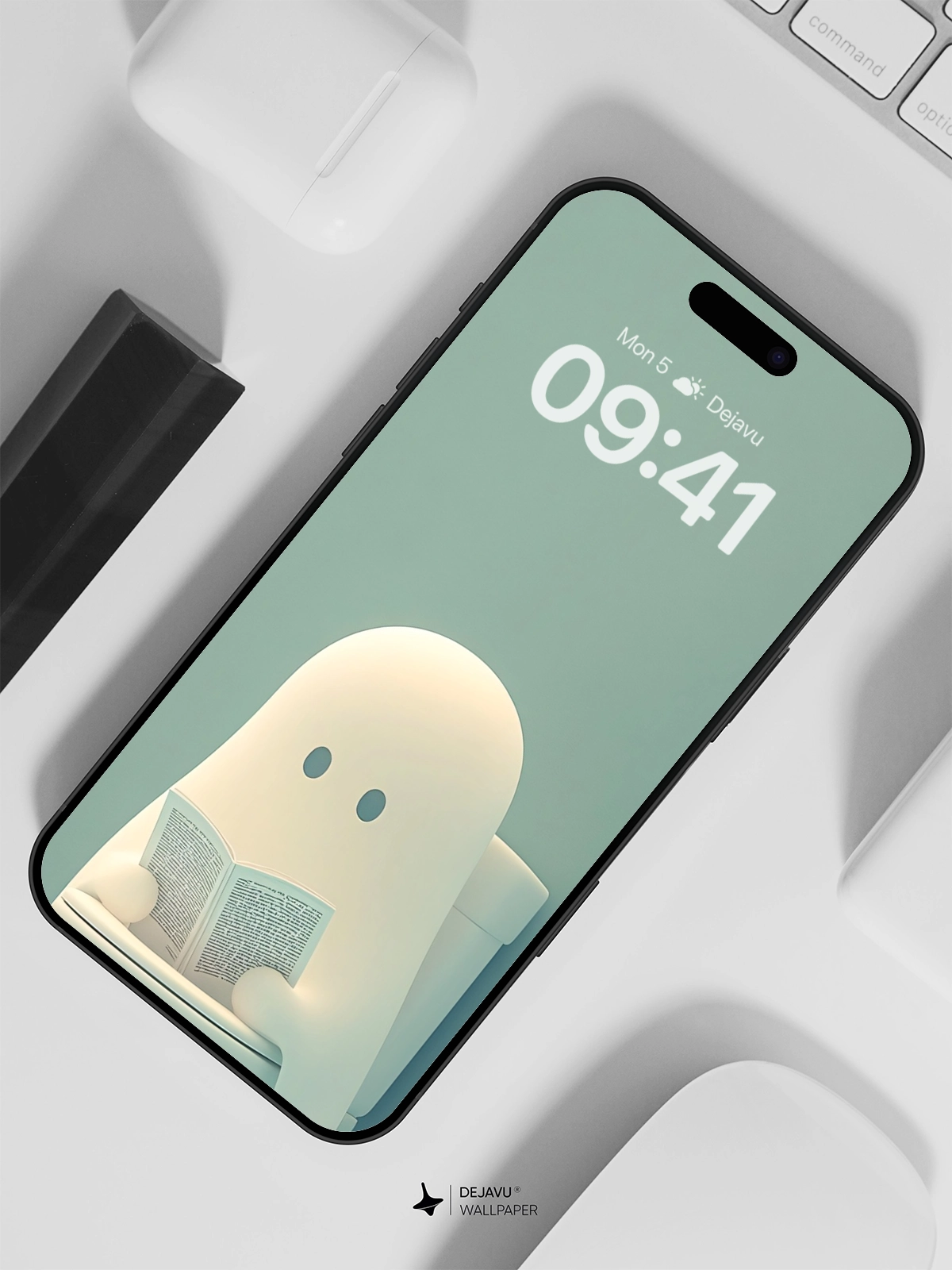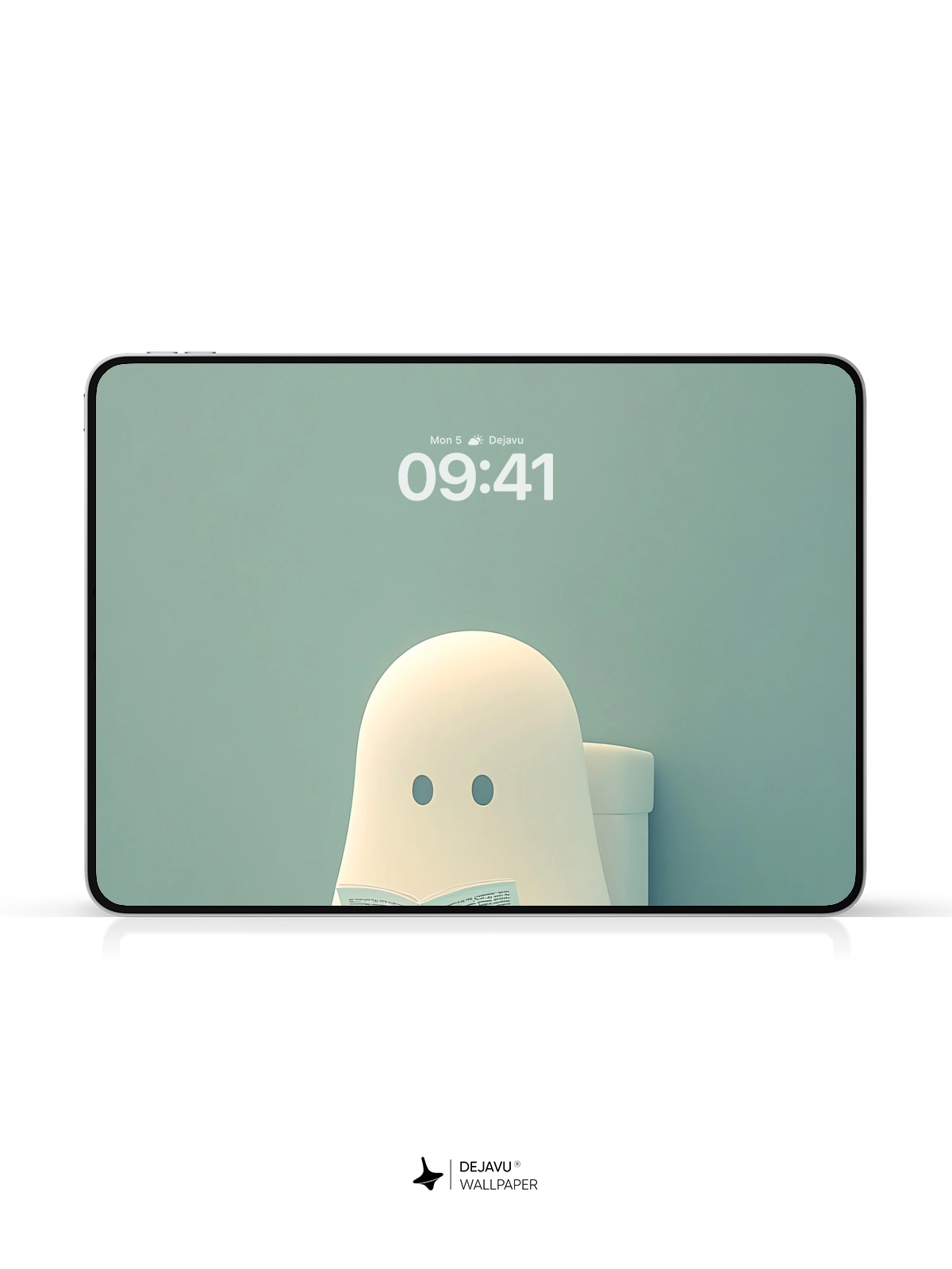 This 8K minimal aesthetic wallpaper features a charming and humorous illustration of a ghost reading a book while sitting on a toilet. The soft gradient background enhances the playful theme, making it ideal for both iPhone and Android users looking to add a touch of whimsy to their screens.