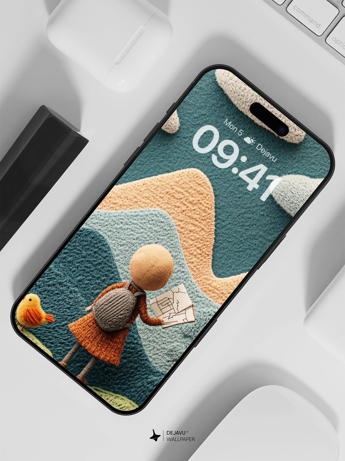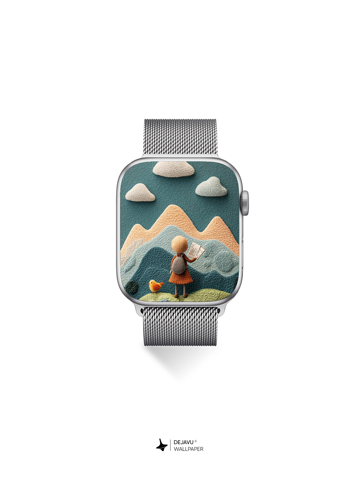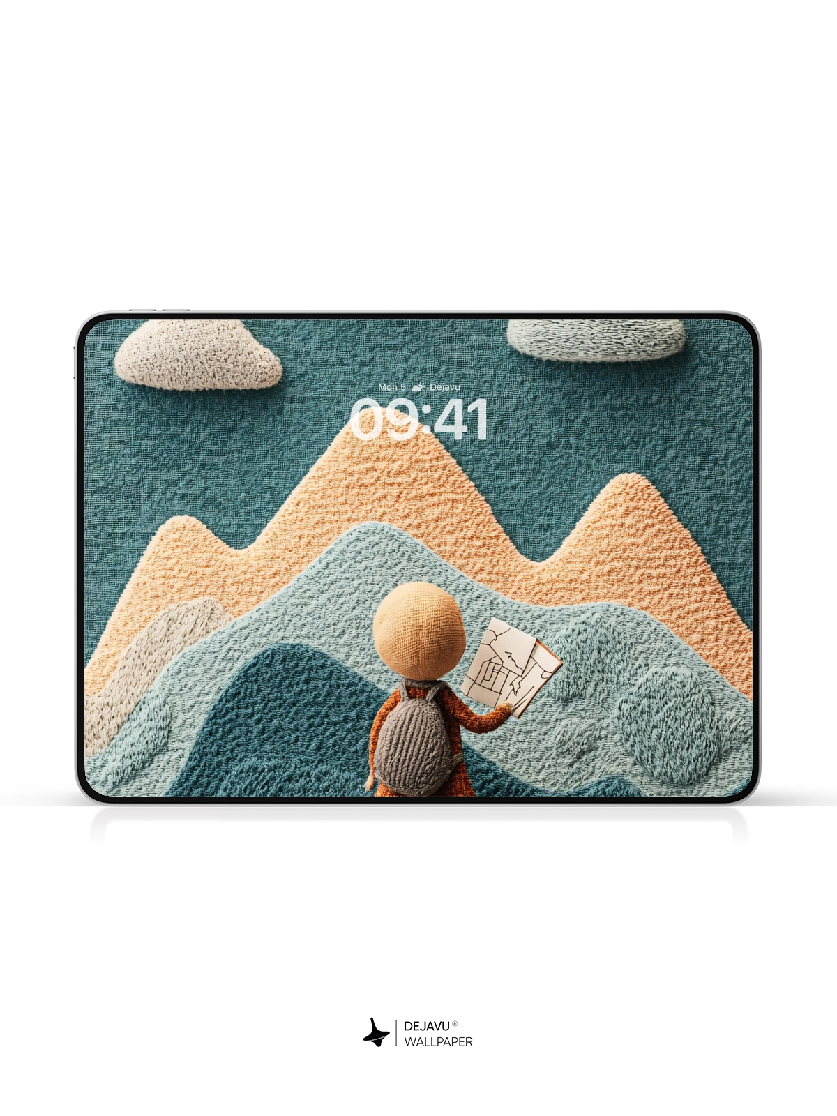 Discover a delightful 8K minimal aesthetic illustration featuring a knitted landscape with a cute character holding a map, set against a backdrop of colorful mountains and clouds. This whimsical design is perfect for adding a touch of charm to your iPhone or Android device.