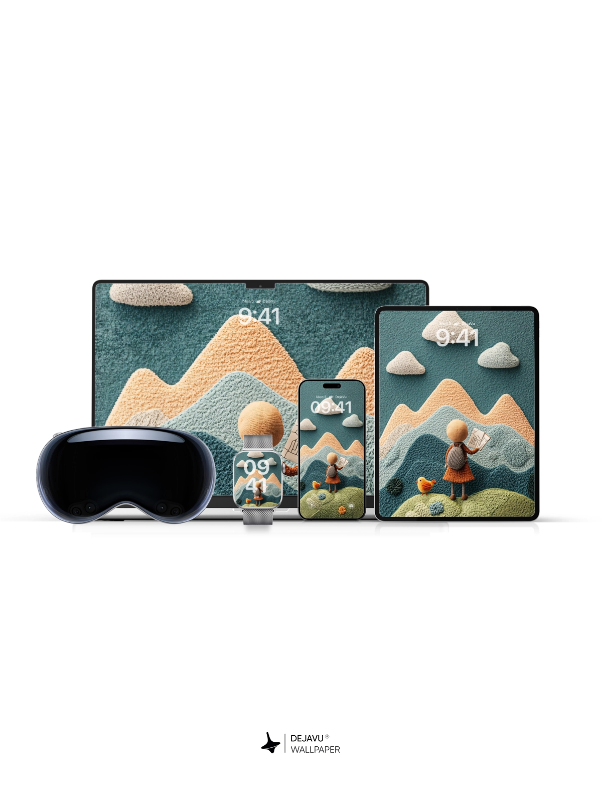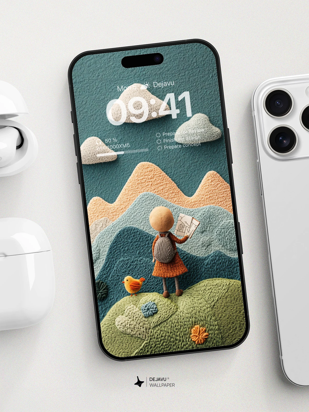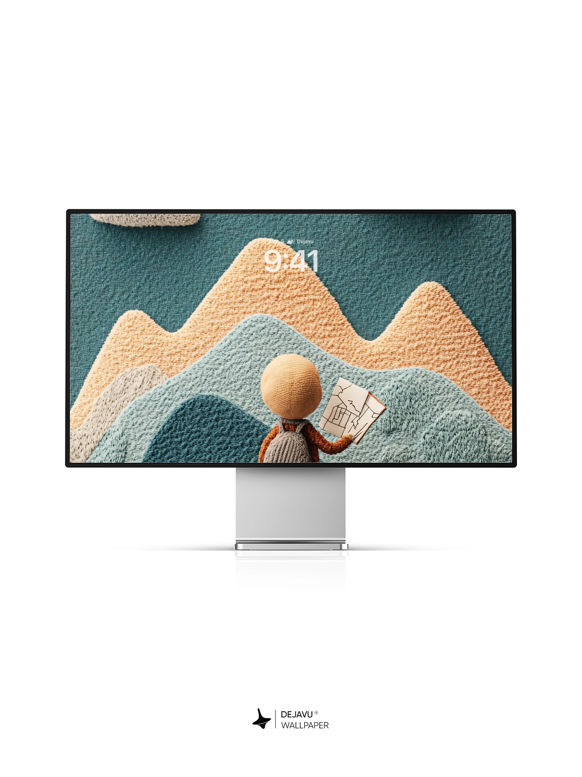 Discover a delightful 8K minimal aesthetic illustration featuring a knitted landscape with a cute character holding a map, set against a backdrop of colorful mountains and clouds. This whimsical design is perfect for adding a touch of charm to your iPhone or Android device.