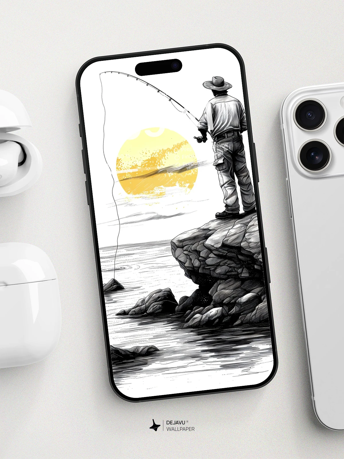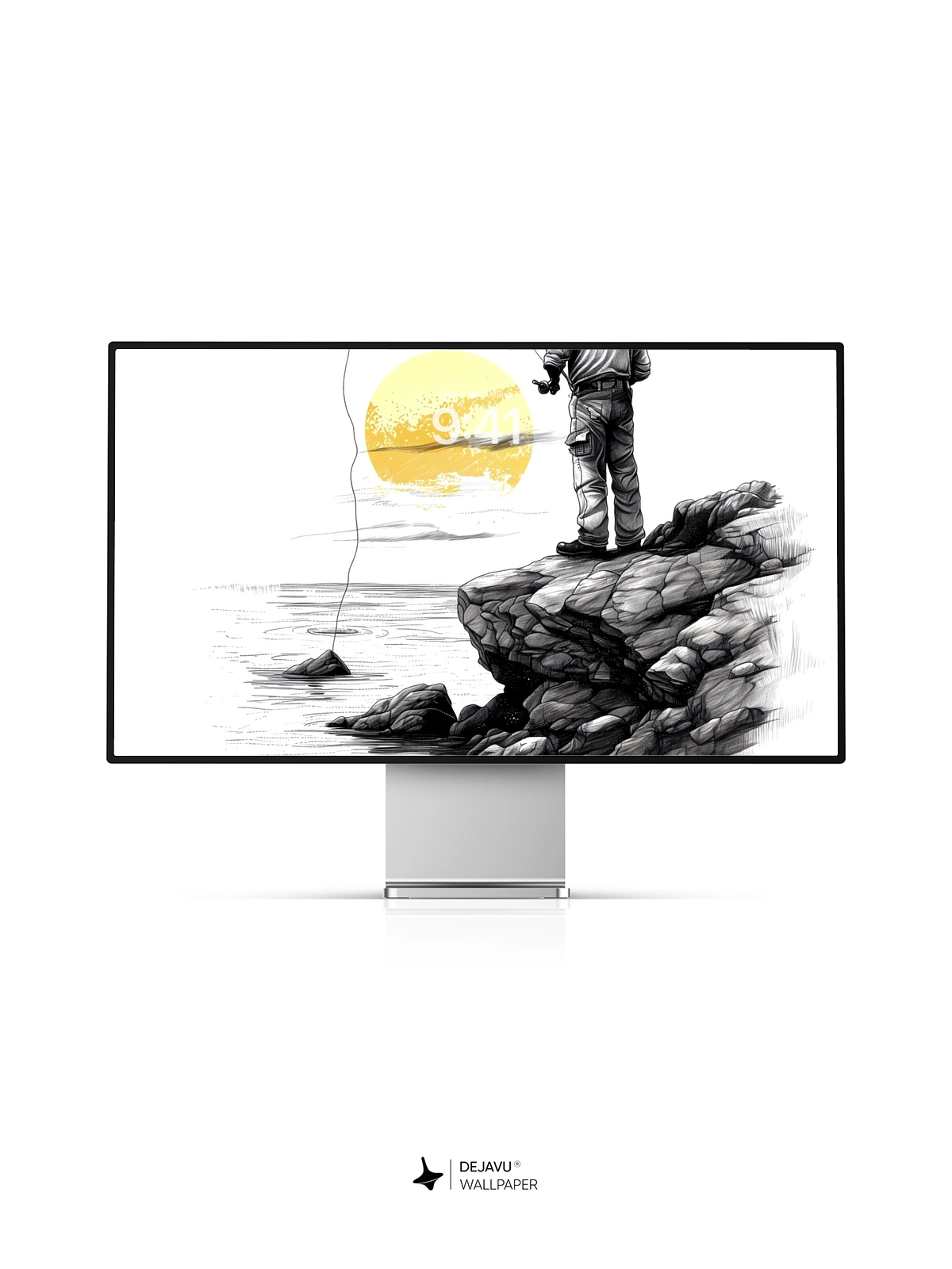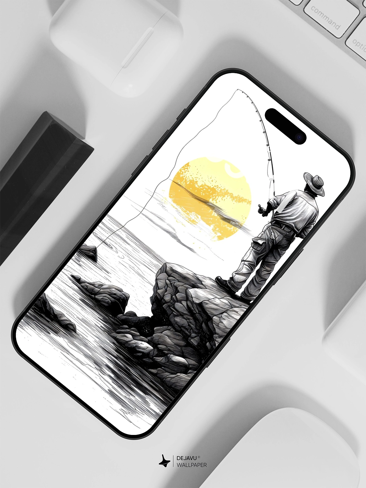 This 8K minimalistic illustration captures the tranquil moment of a fisherman casting his line into the water as the sun sets. The monochrome palette with a splash of yellow adds a touch of warmth and serenity. Ideal for those who appreciate minimalist art, this wallpaper is compatible with iPhone, Android, and tablets, offering a peaceful and calming backdrop.