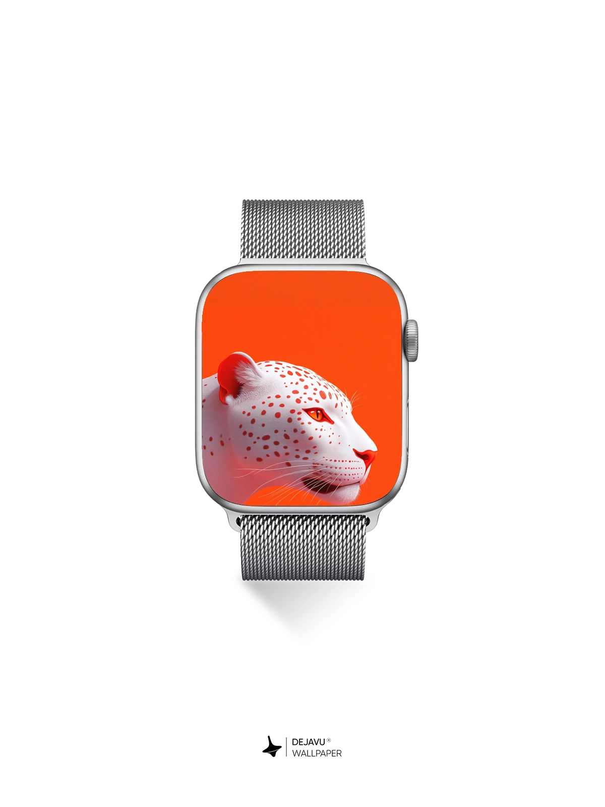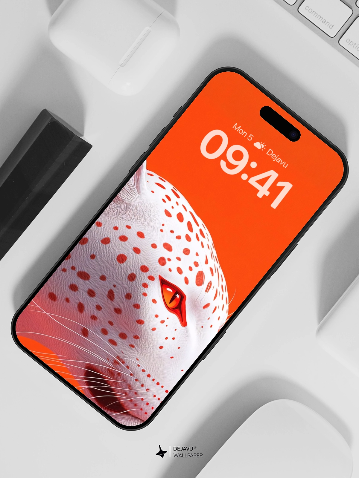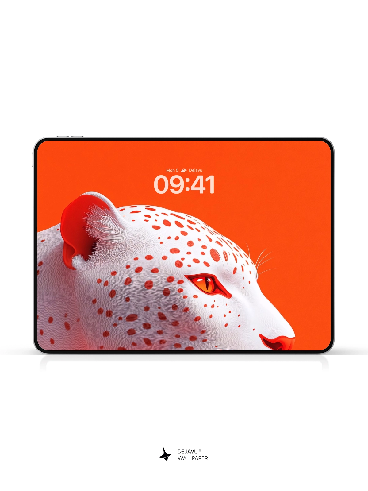 This 8K minimal aesthetic wallpaper showcases a white leopard with vibrant red accents set against a bold orange background. The design is both modern and captivating, evoking a sense of elegance and power. Perfect for enhancing the look of your iPhone or Android device, this wallpaper adds a touch of sophistication and style to your screen.