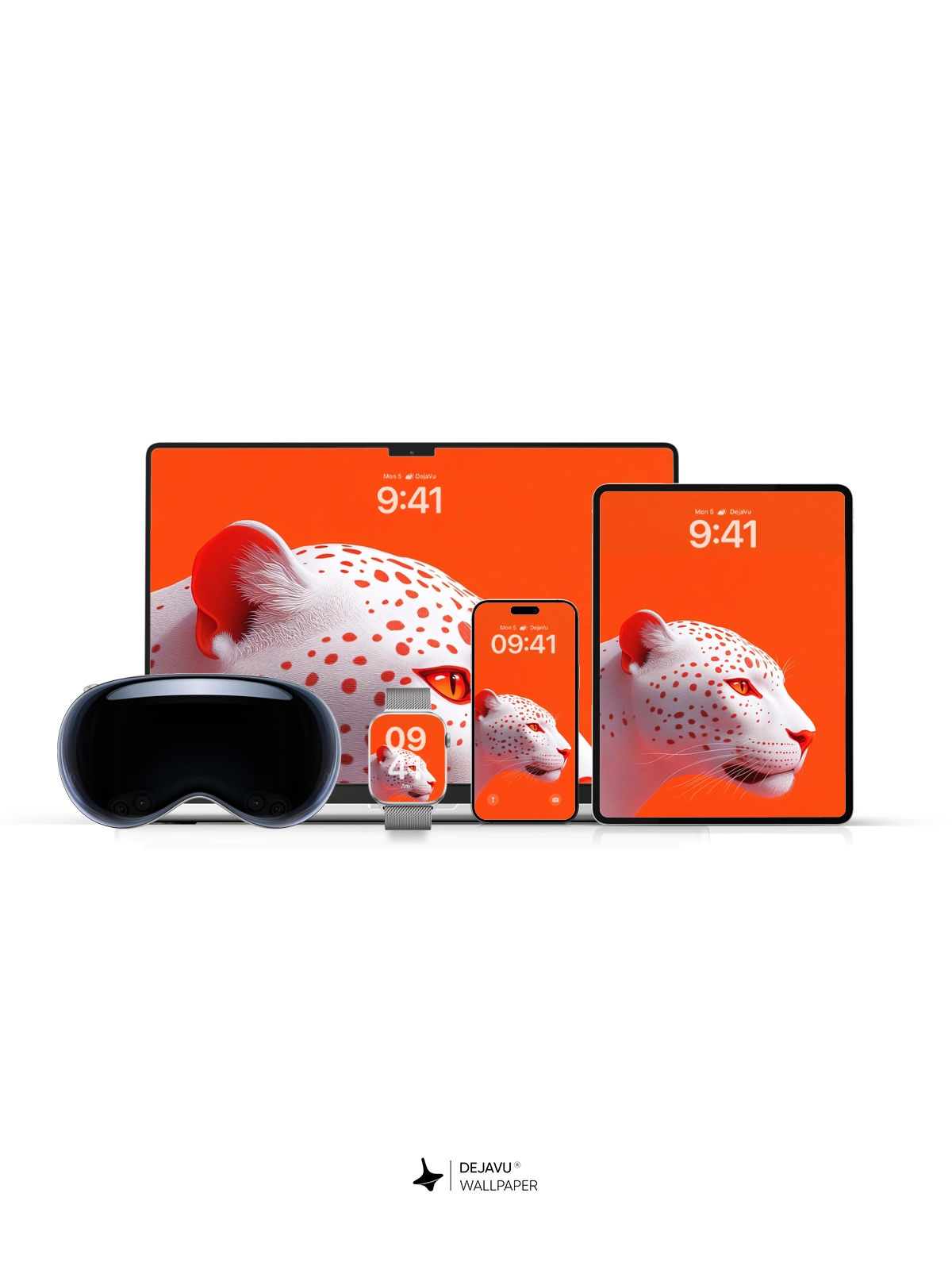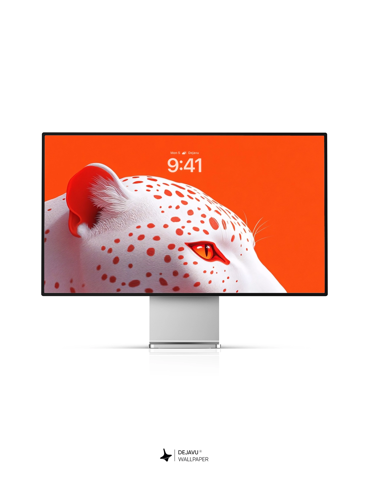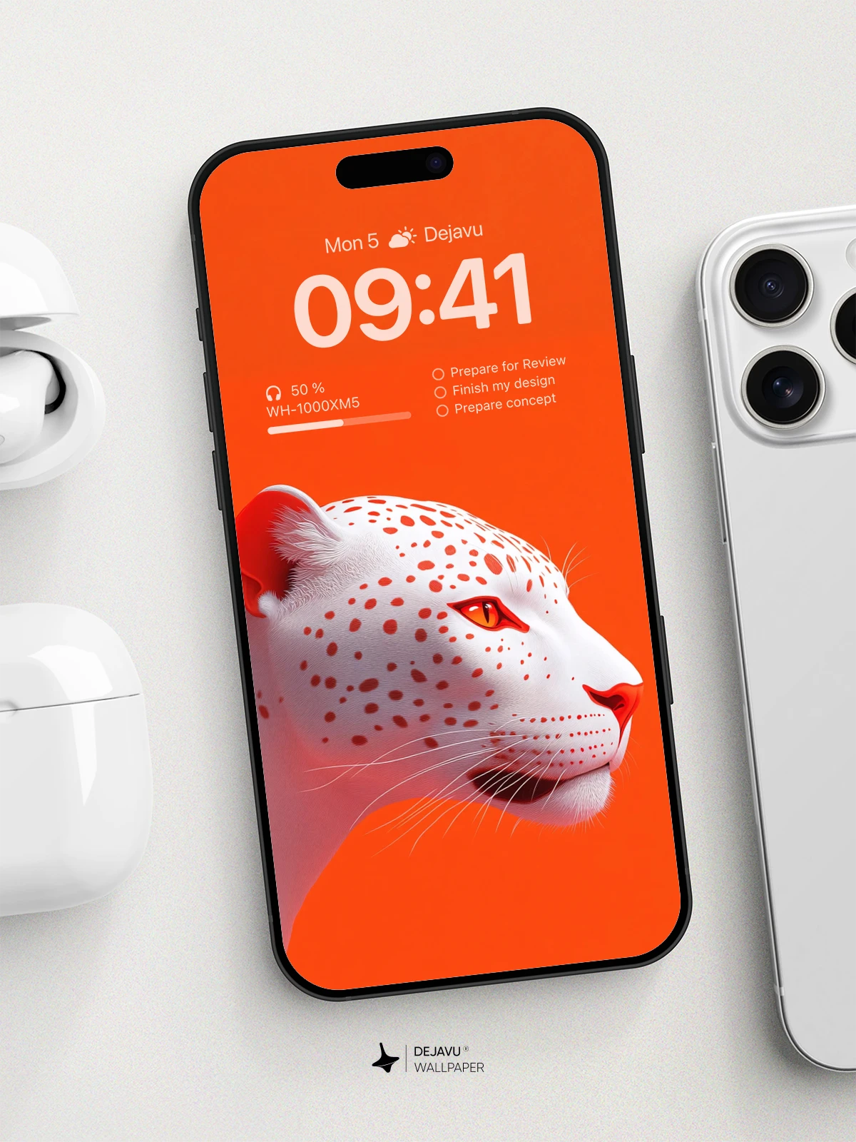 This 8K minimal aesthetic wallpaper showcases a white leopard with vibrant red accents set against a bold orange background. The design is both modern and captivating, evoking a sense of elegance and power. Perfect for enhancing the look of your iPhone or Android device, this wallpaper adds a touch of sophistication and style to your screen.