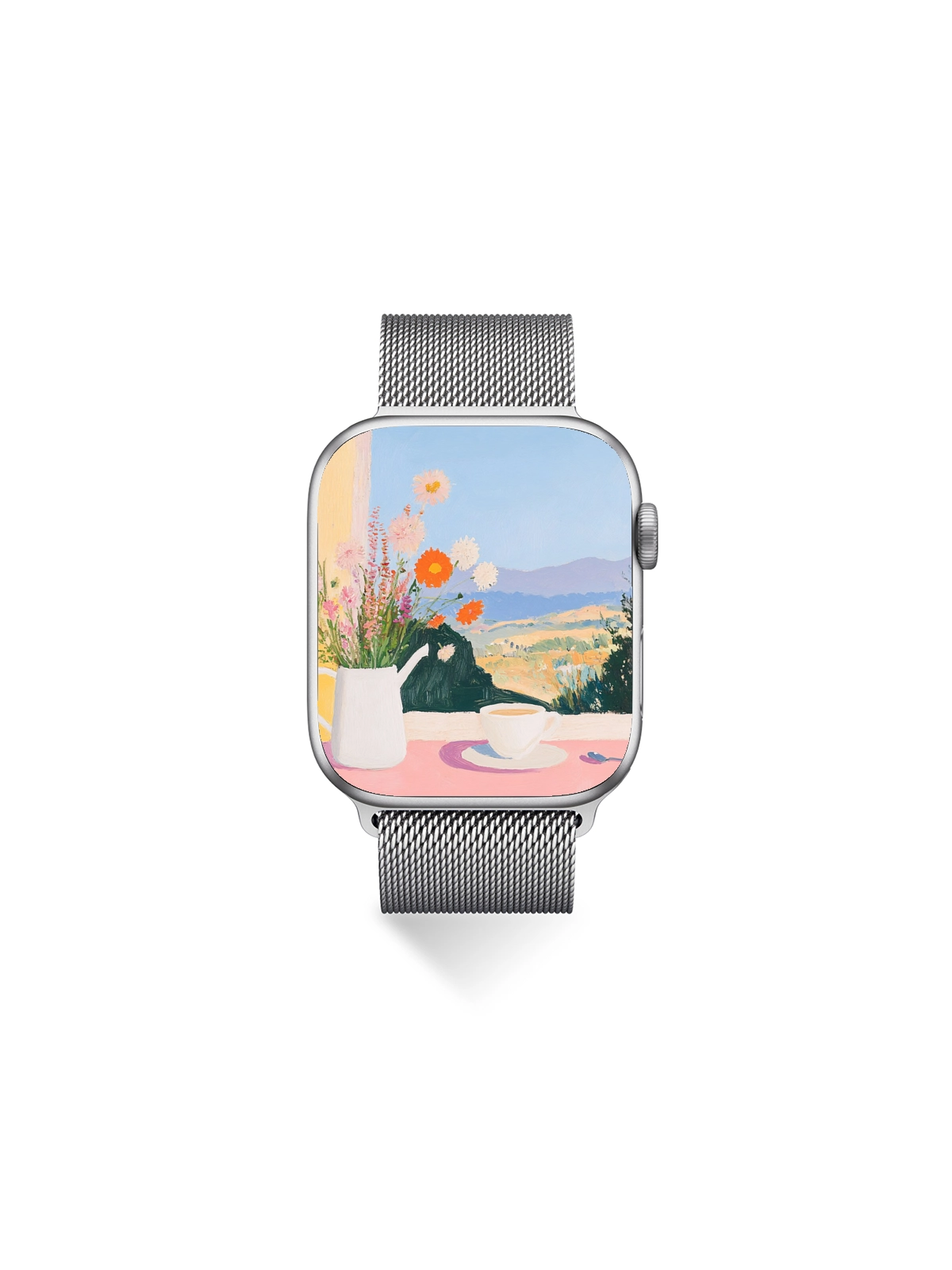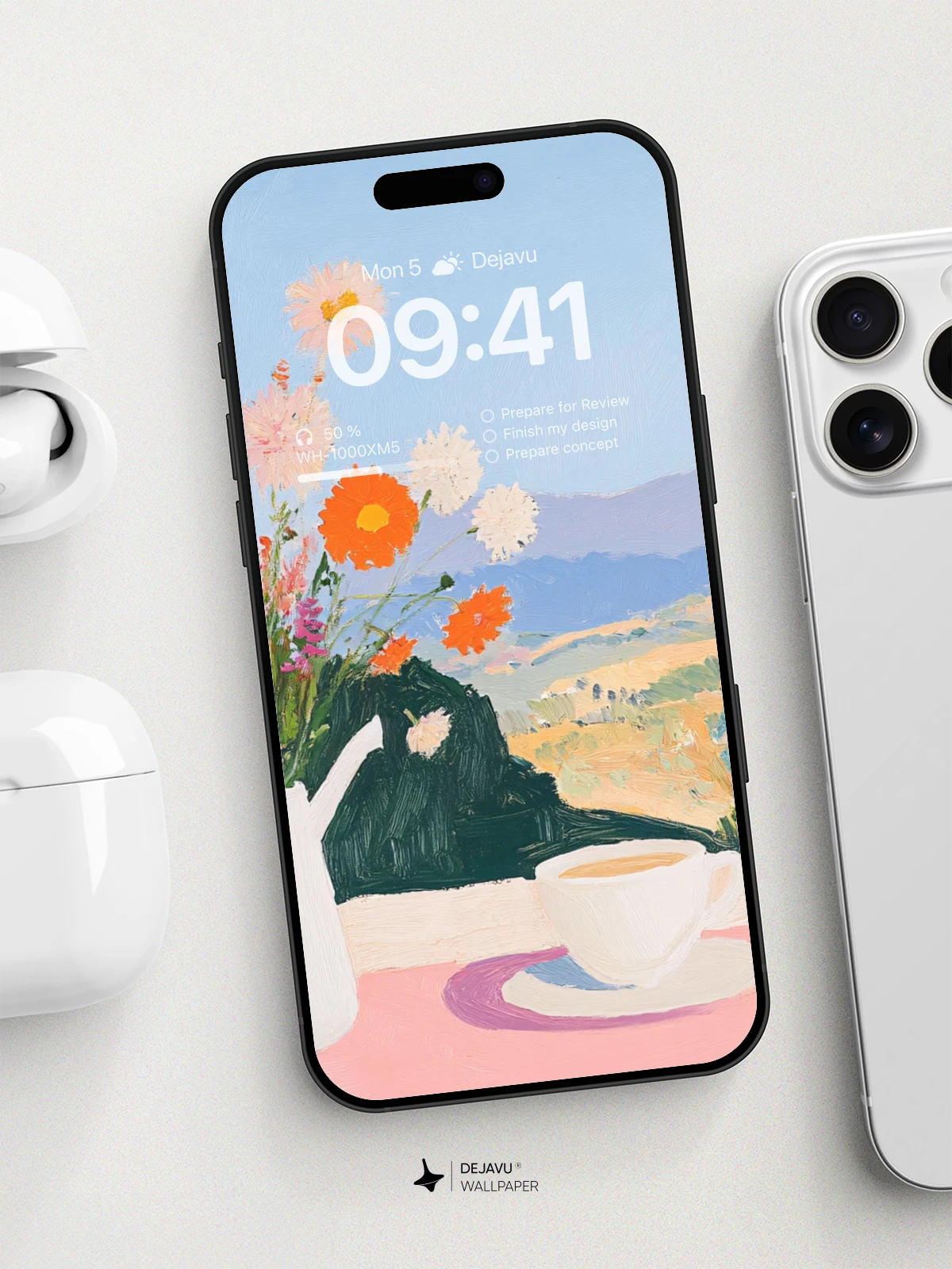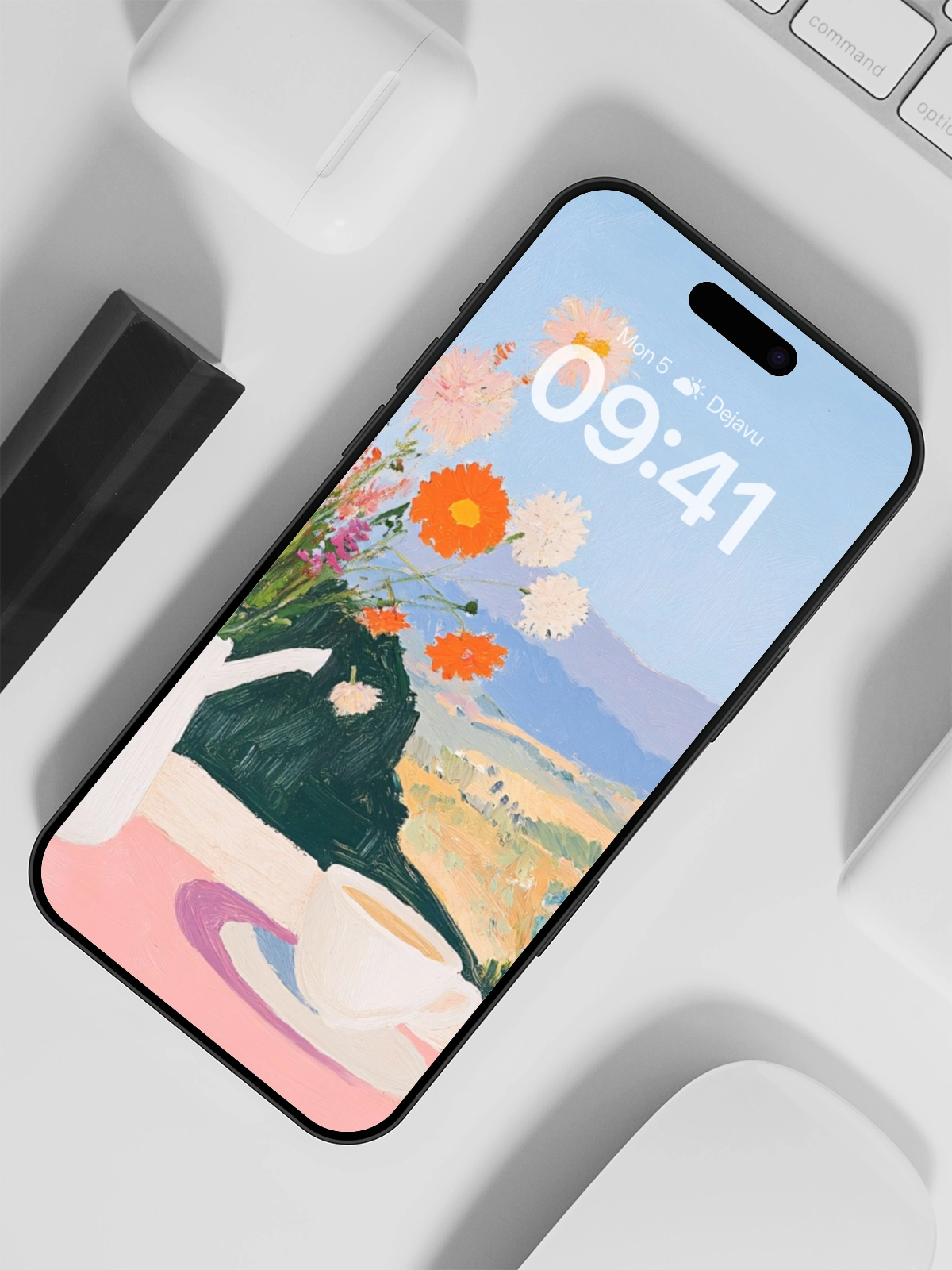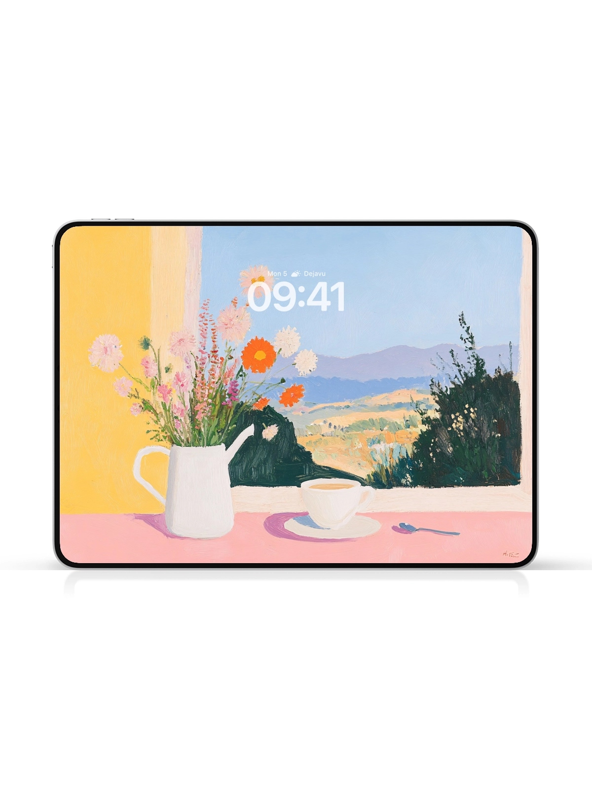 This 8K minimal aesthetic painting captures the tranquility of a morning scene with a cup of coffee and a vase of flowers by a window overlooking a scenic landscape. The soft gradient colors and detailed illustration make it perfect for setting as a wallpaper on your iPhone, Android, or tablet.