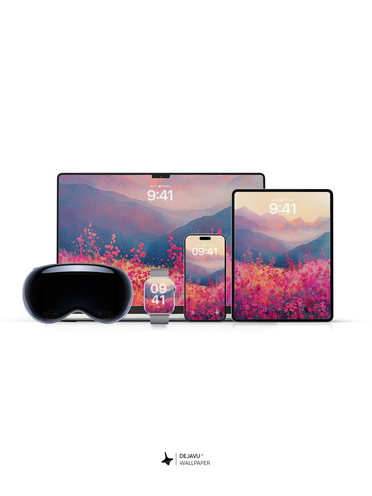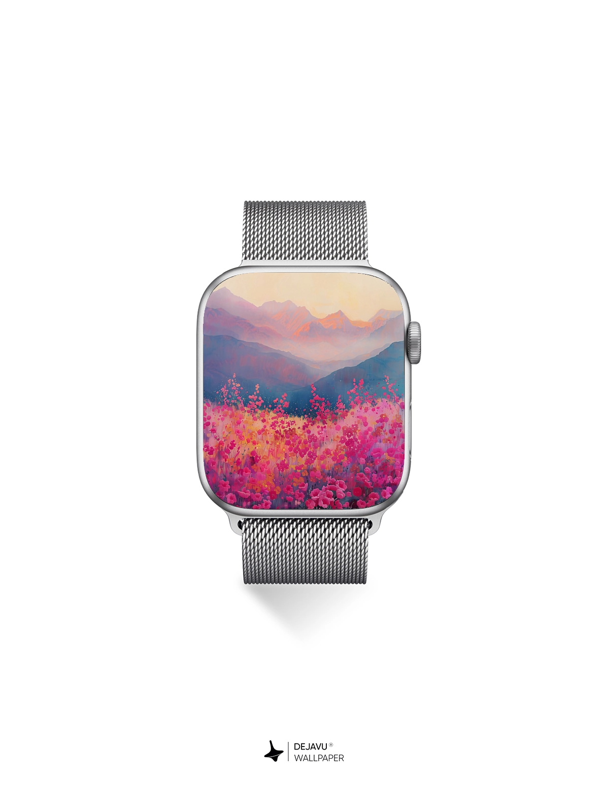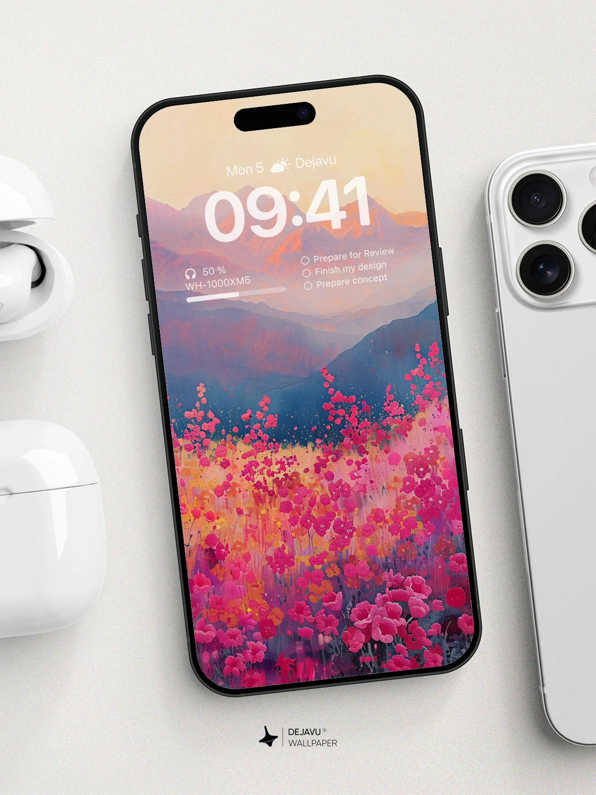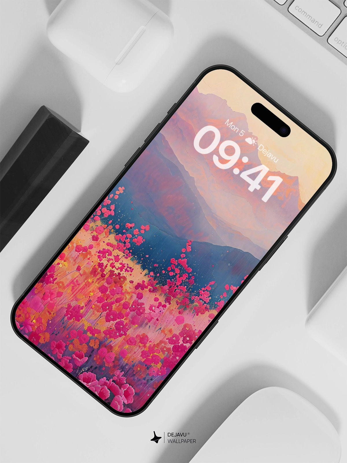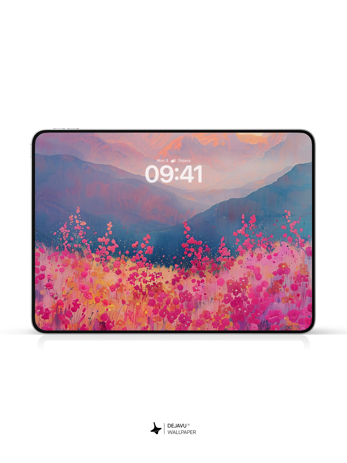 Explore this breathtaking 8K minimal aesthetic painting wallpaper, perfect for your iPhone, Android, and tablets. The image captures a serene mountain landscape with a vibrant field of pink flowers, evoking a sense of tranquility and beauty. This high-resolution wallpaper is ideal for enhancing the aesthetics of your device with its vivid colors and detailed design.