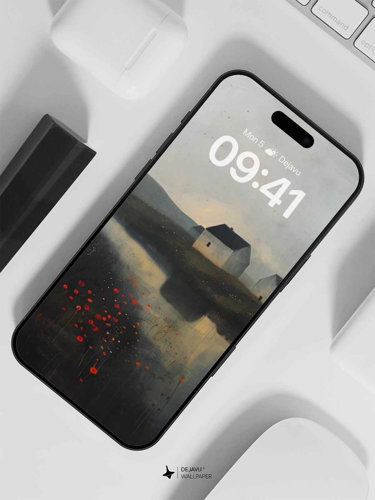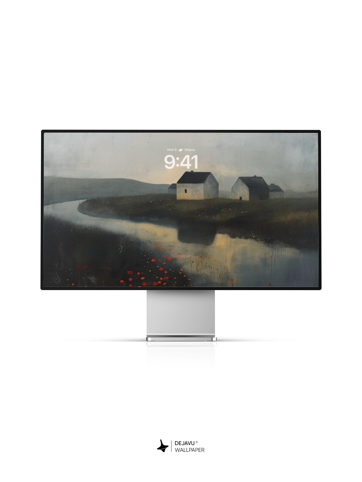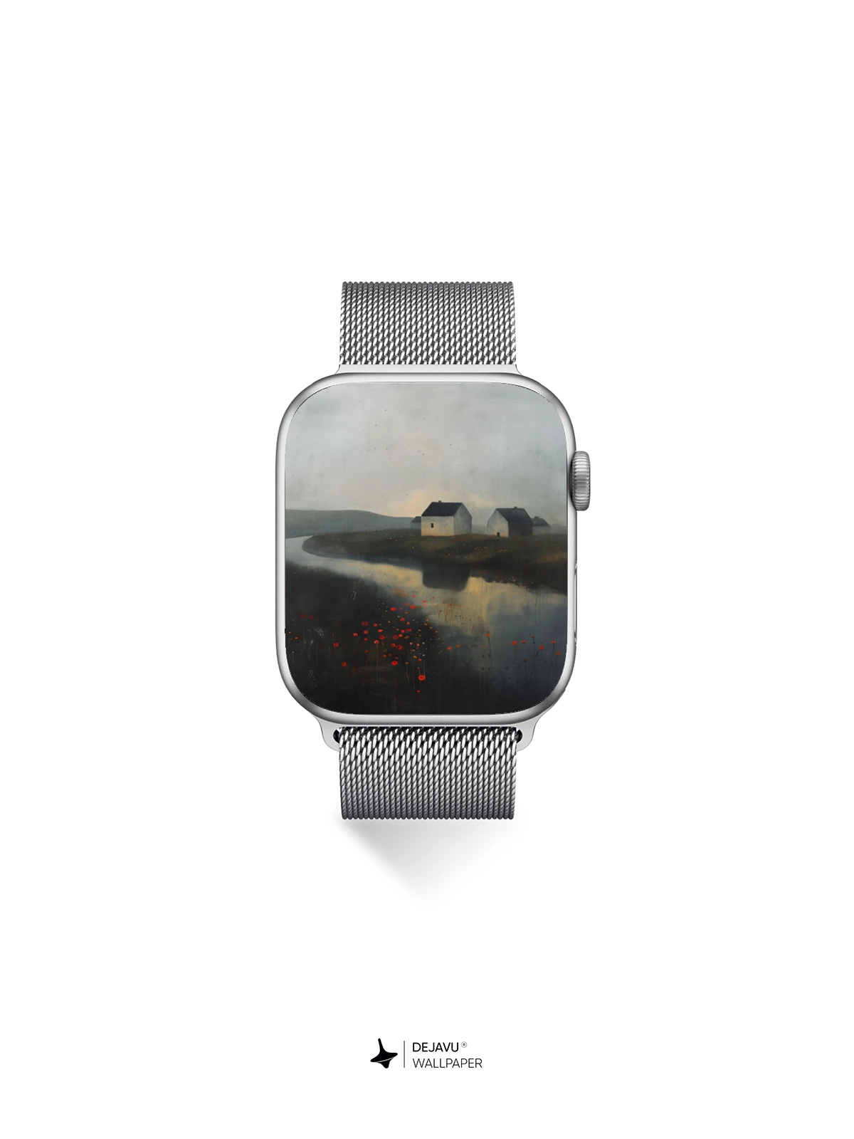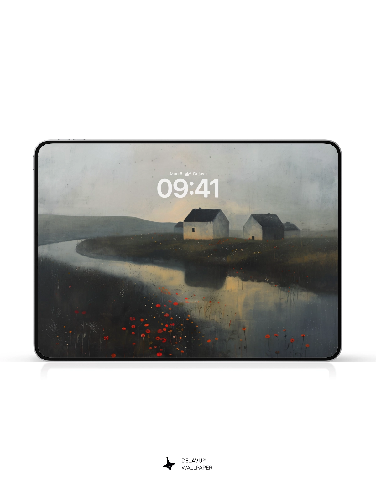 This 8K wallpaper features a tranquil landscape painting with a minimalist aesthetic. The scene depicts a calm river winding through a field of red flowers, with quaint houses in the background. The soft, muted colors and detailed brushstrokes evoke a sense of peace and tranquility. Ideal for enhancing the aesthetic of your iPhone, Android, or tablet.