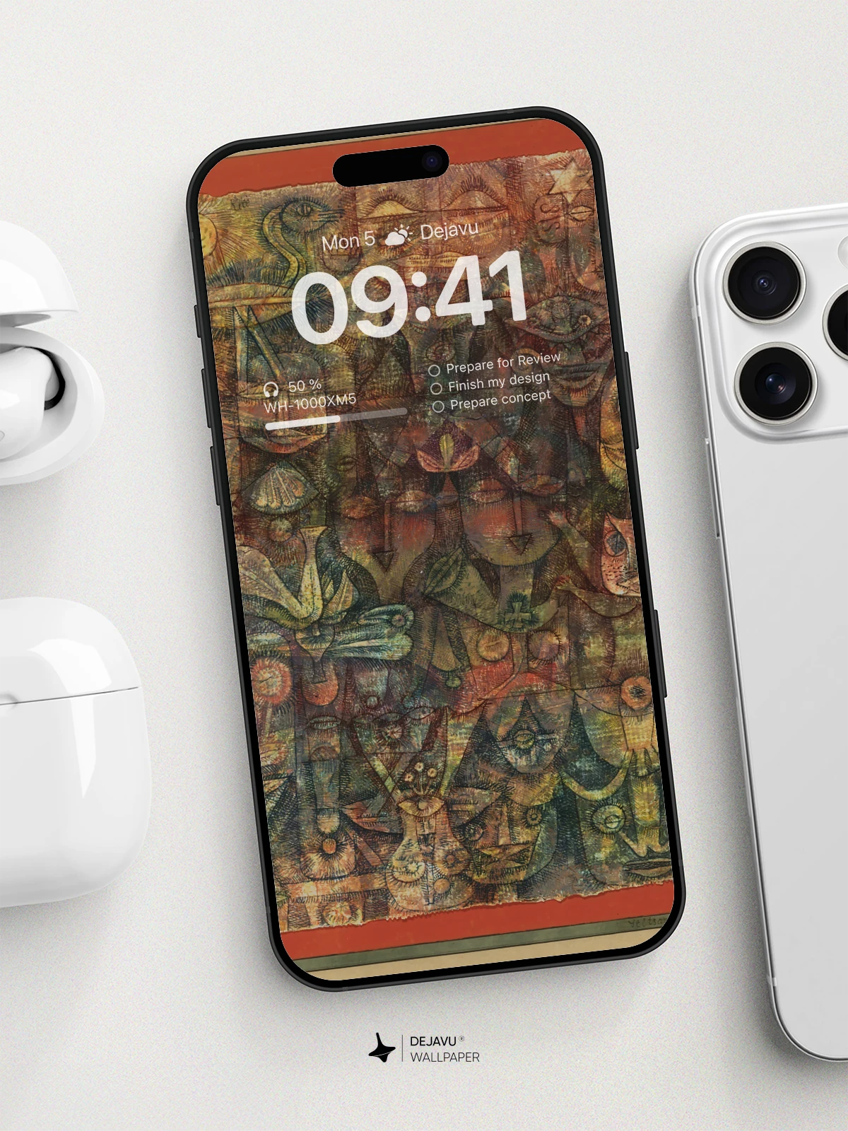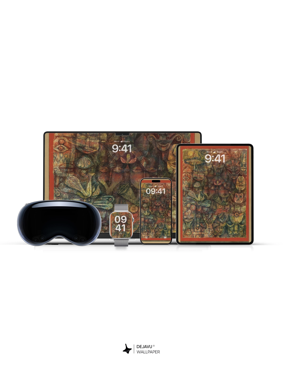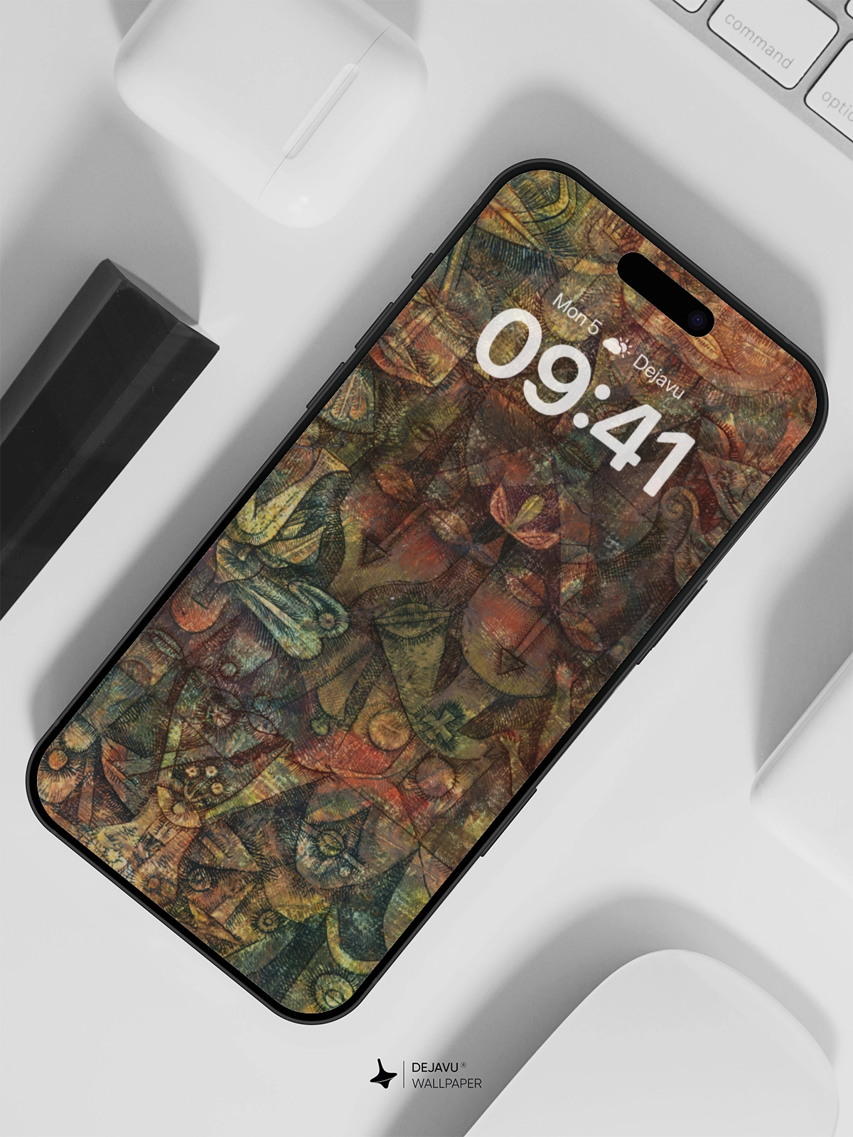 This 8K wallpaper features a surreal and intricate painting filled with vibrant colors and abstract forms. Perfect for enhancing the aesthetic of your iPhone or Android device, it brings a unique blend of art and technology. The detailed design evokes a sense of mystery and wonder, making it an engaging backdrop for your screens.