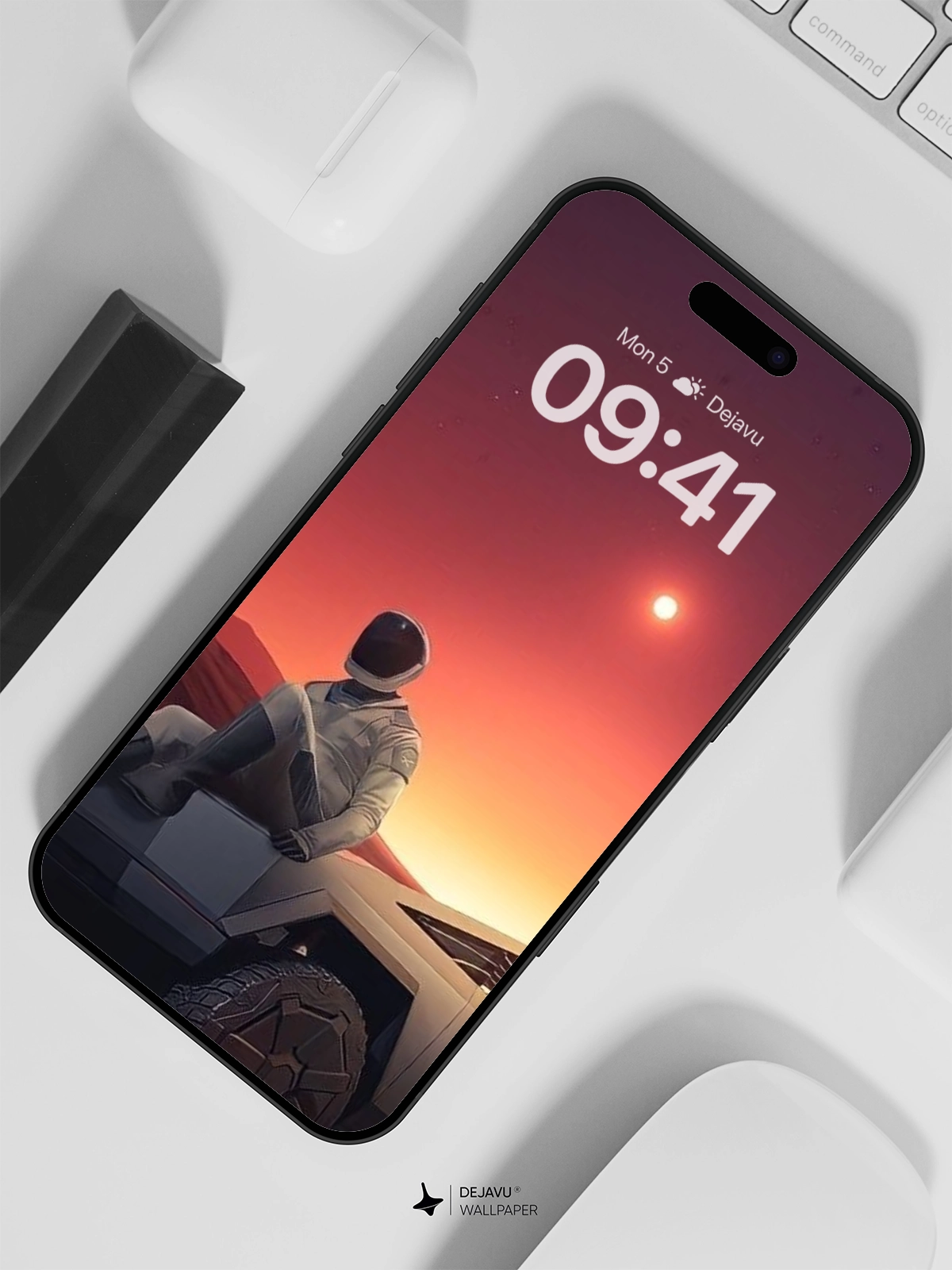 Dive into the future with this 8K minimal aesthetic wallpaper. The image captures a futuristic astronaut sitting on a sleek vehicle, set against a breathtaking sky filled with stars and a glowing sun. This wallpaper is perfect for enhancing the look of your iPhone or Android device, offering a blend of science fiction and adventure that will inspire you every time you unlock your screen.