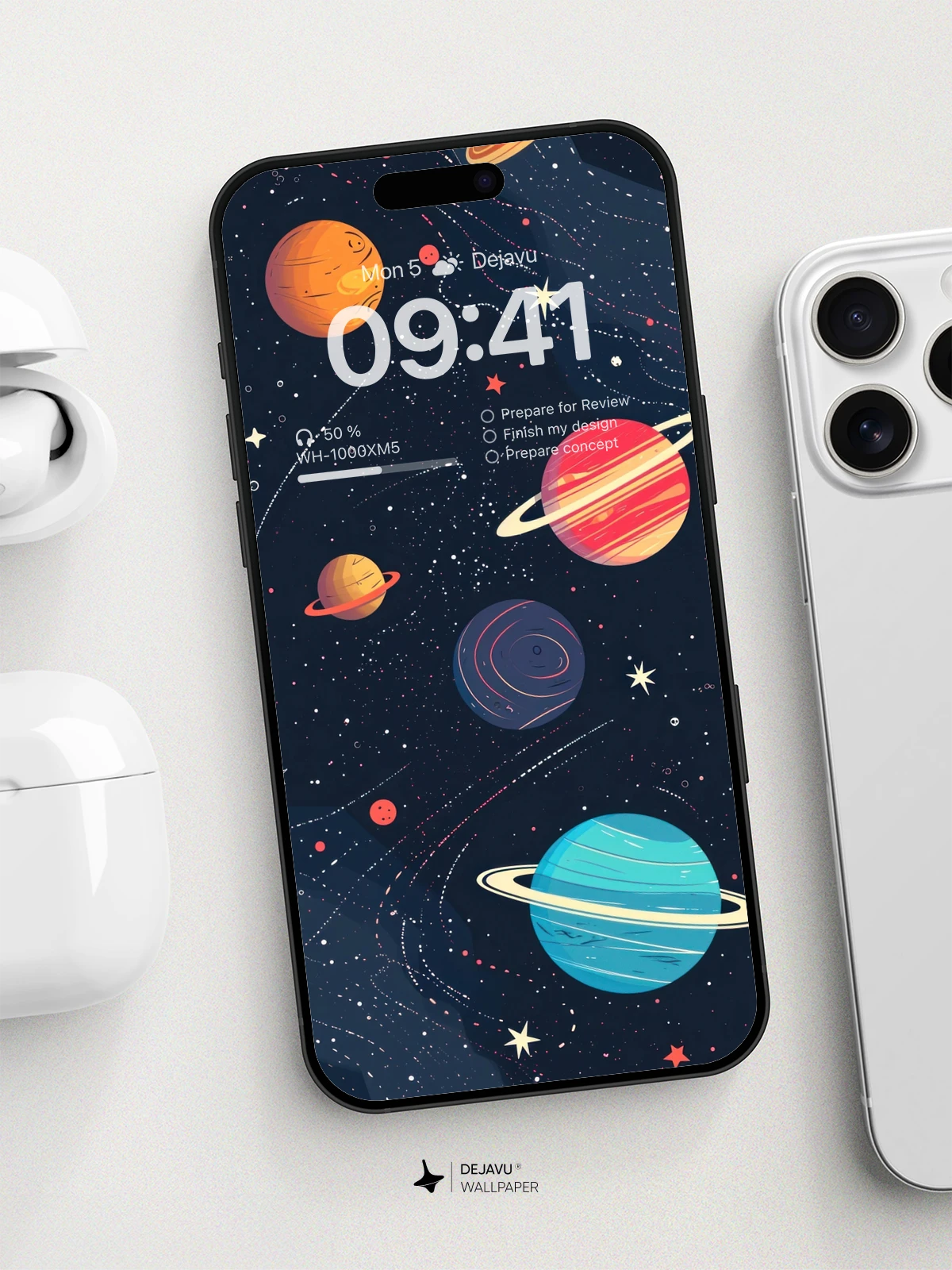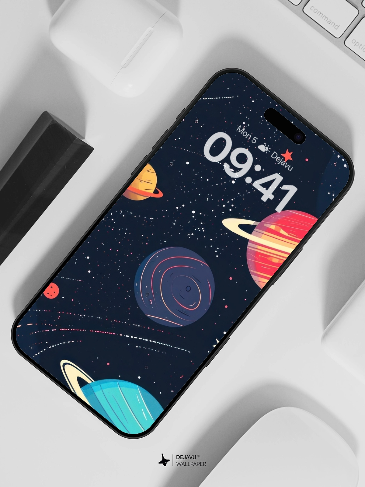 Dive into the mesmerizing world of outer space with this 8K minimal aesthetic space illustration wallpaper. Featuring colorful planets, stars, and cosmic elements, this design captures the essence of the universe in a playful and engaging manner. Ideal for both iPhone and Android devices, this wallpaper brings a touch of cosmic beauty to your screen.
