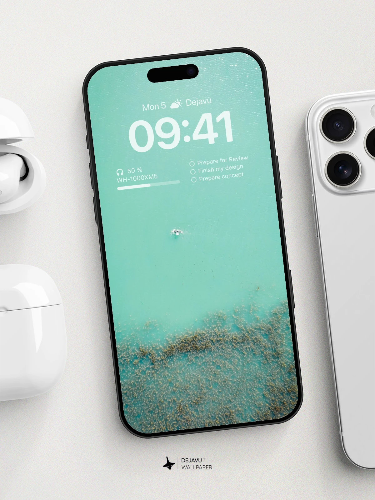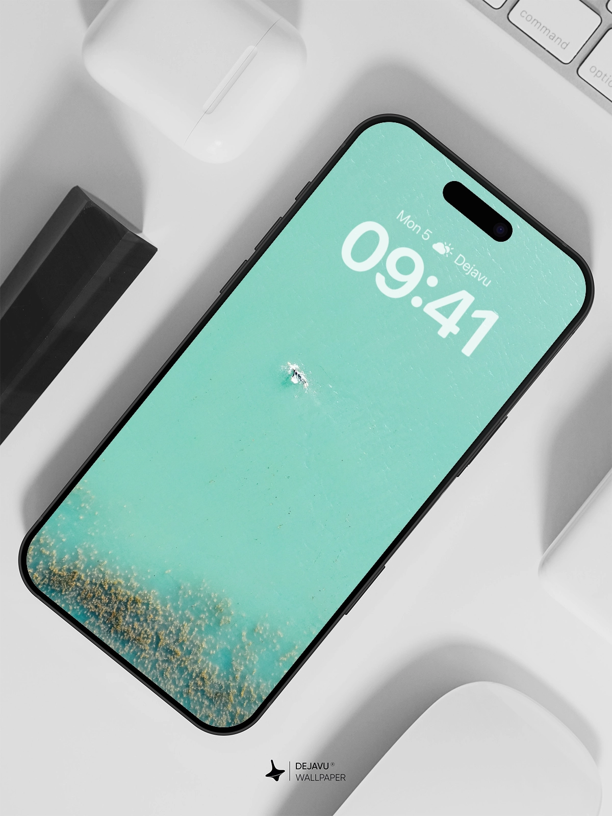 Dive into the serene world of this 8K minimal aesthetic wallpaper featuring a tranquil turquoise ocean. The image captures the essence of calmness and beauty, making it perfect for your iPhone, Android, or tablet. The unique blend of colors and the solitary figure in the water evoke a sense of peace and reflection.