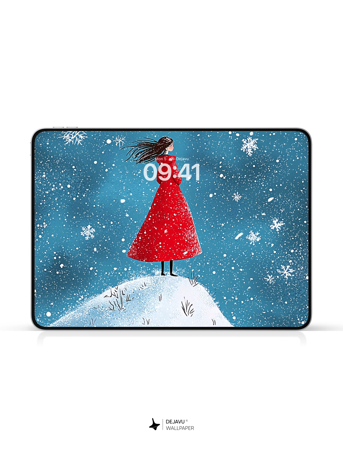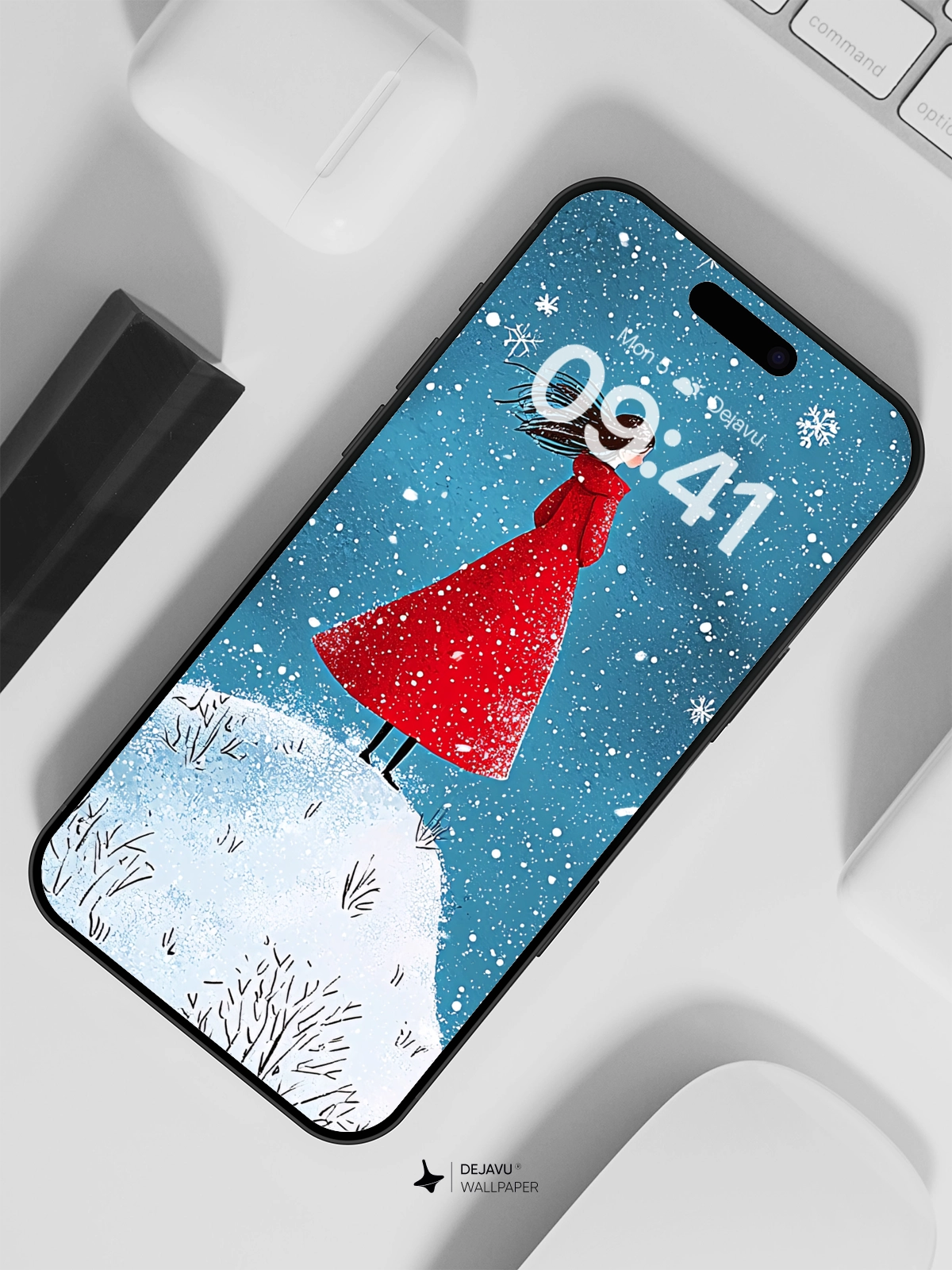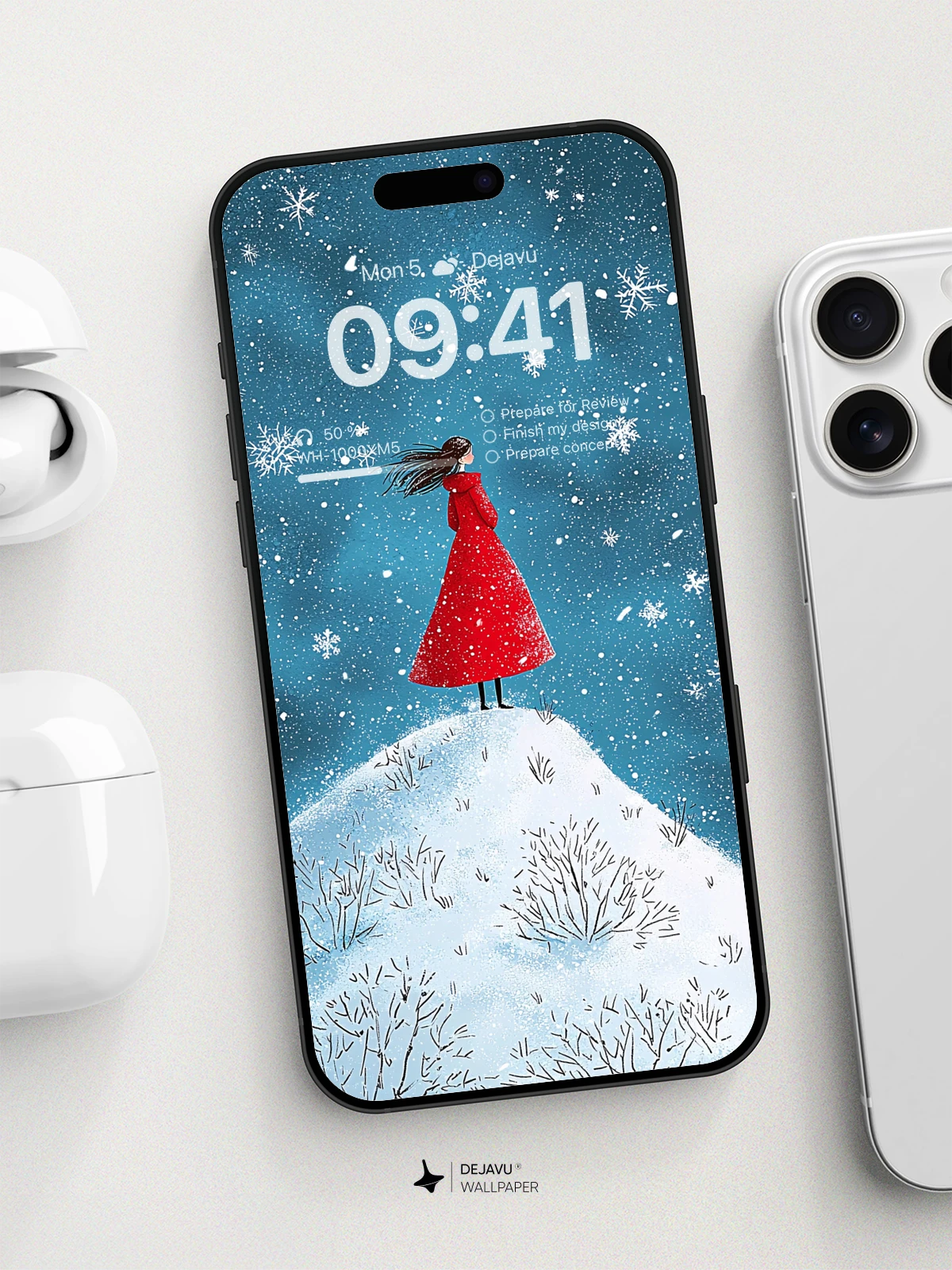 Experience the serene beauty of winter with this 8K minimalistic wallpaper. The image captures a solitary figure in a vibrant red coat standing on a snow-covered hill, surrounded by falling snowflakes. This illustration evokes a sense of calm and solitude, making it an ideal aesthetic choice for your iPhone or Android device. The high-resolution design ensures clarity and detail, enhancing the overall visual appeal.