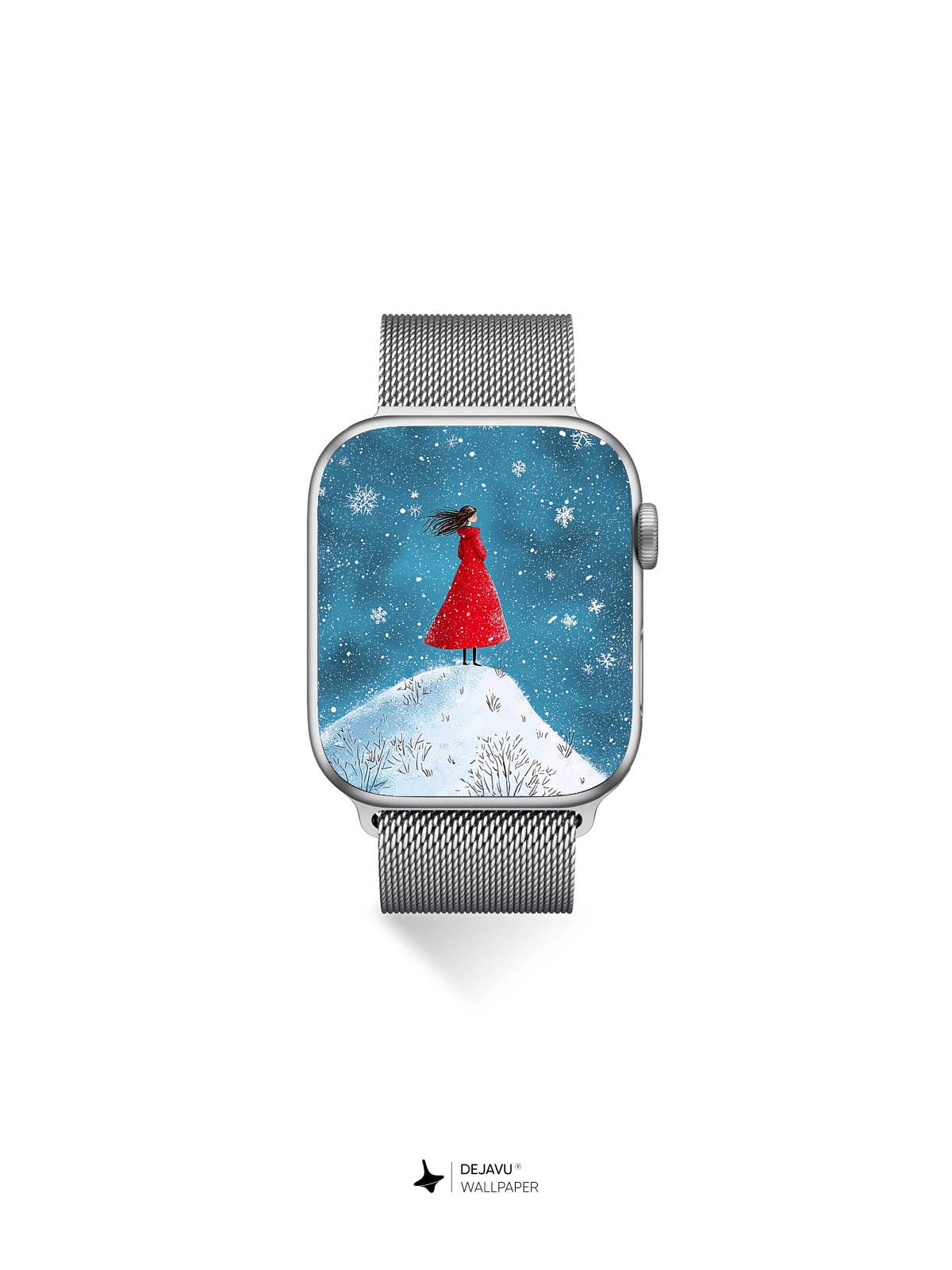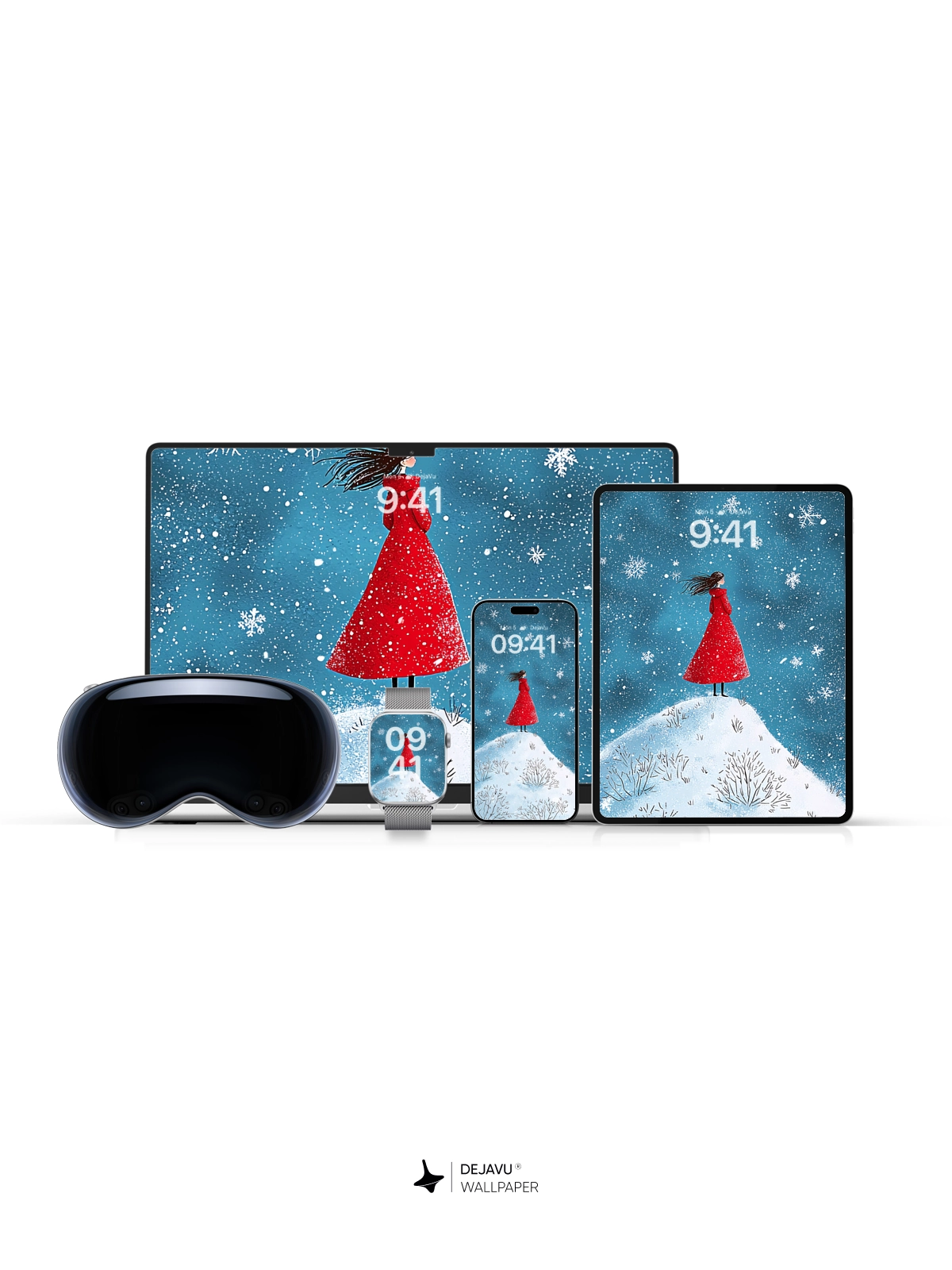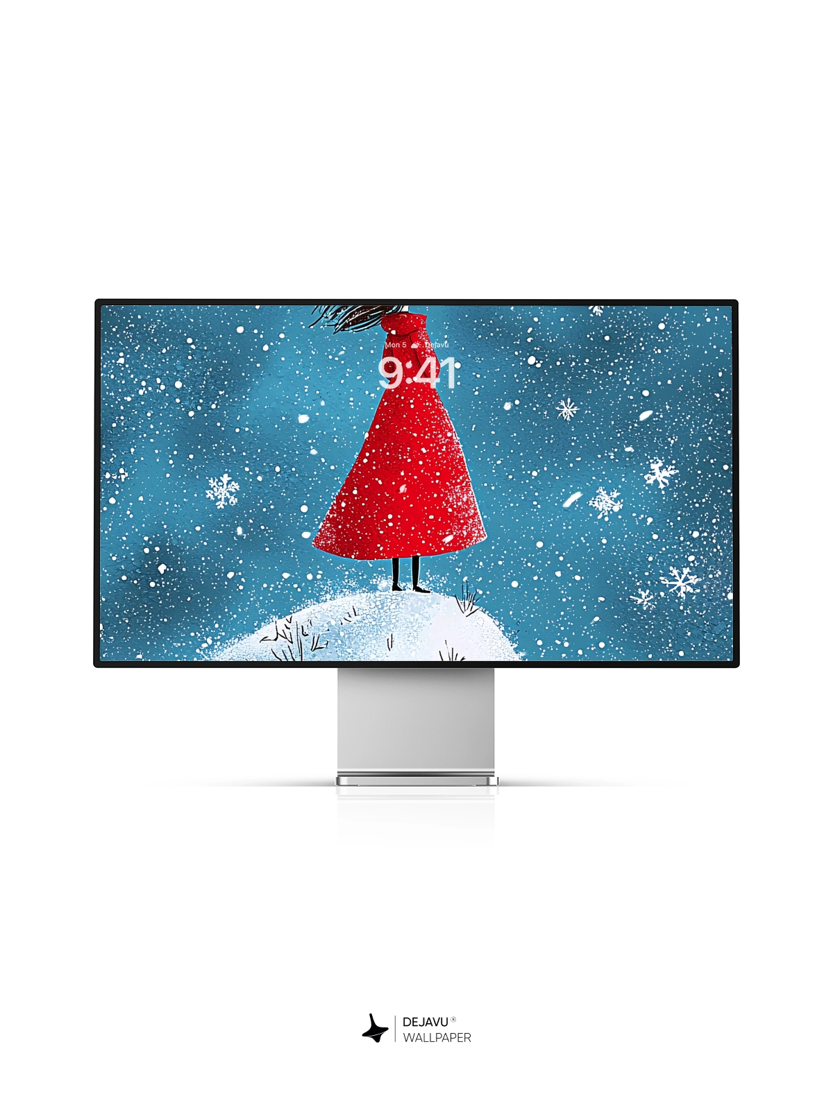 Experience the serene beauty of winter with this 8K minimalistic wallpaper. The image captures a solitary figure in a vibrant red coat standing on a snow-covered hill, surrounded by falling snowflakes. This illustration evokes a sense of calm and solitude, making it an ideal aesthetic choice for your iPhone or Android device. The high-resolution design ensures clarity and detail, enhancing the overall visual appeal.