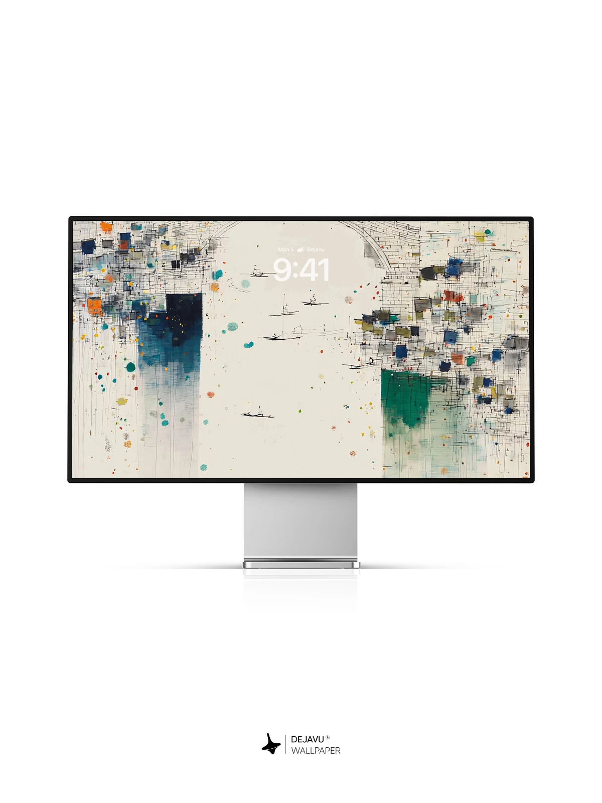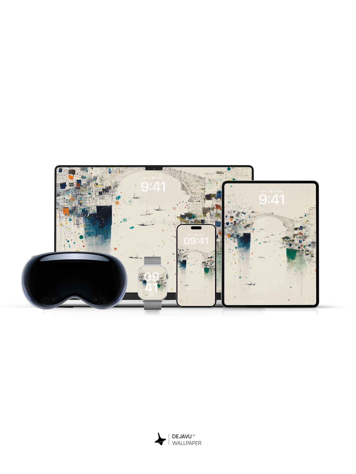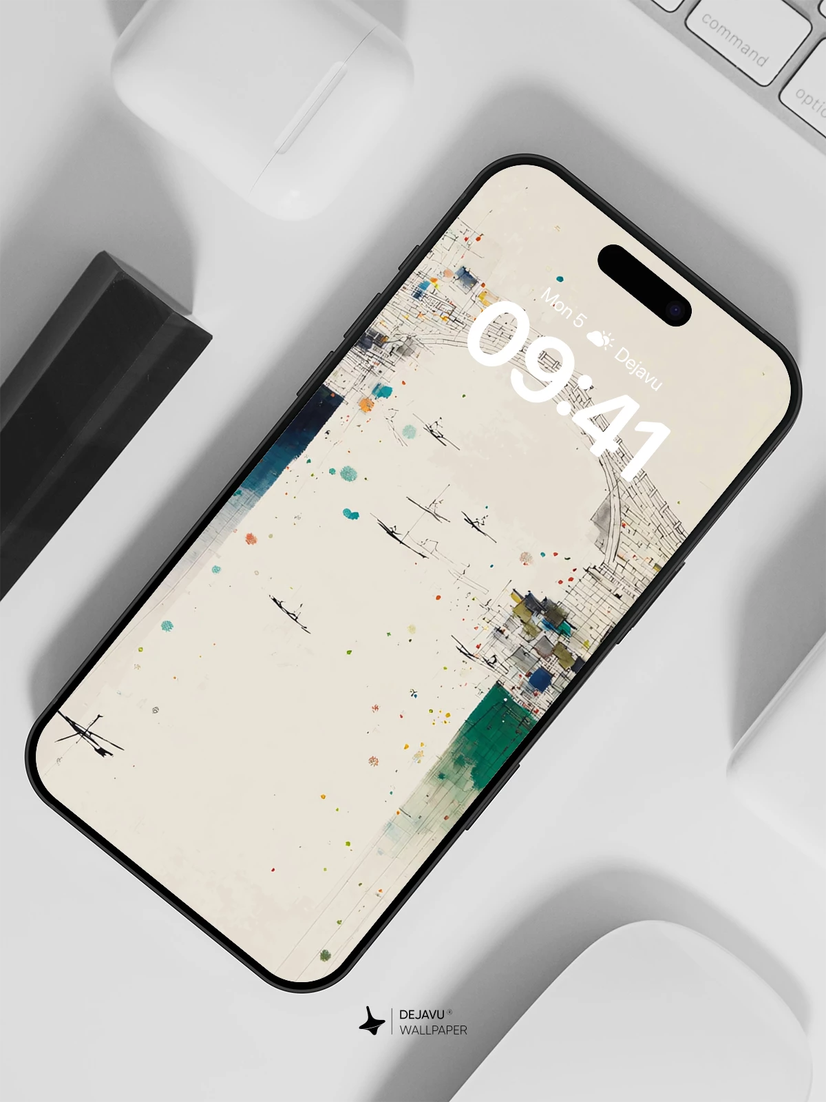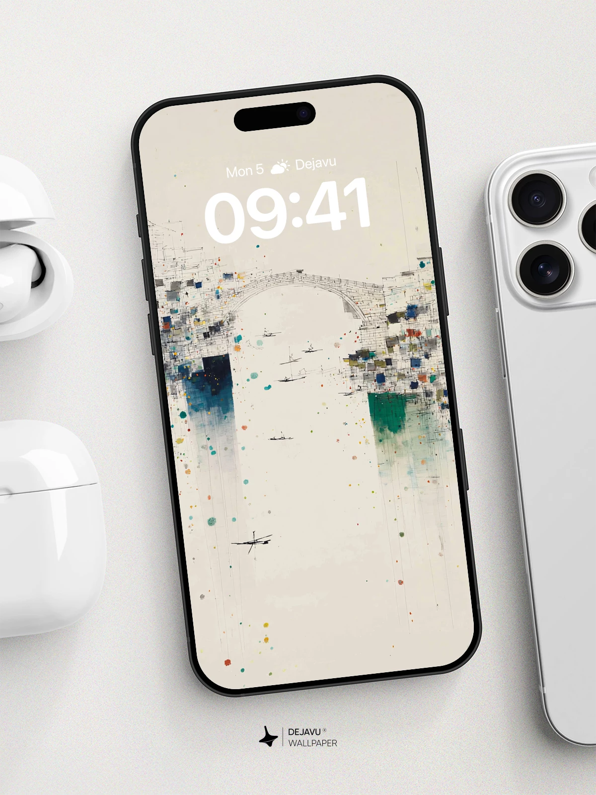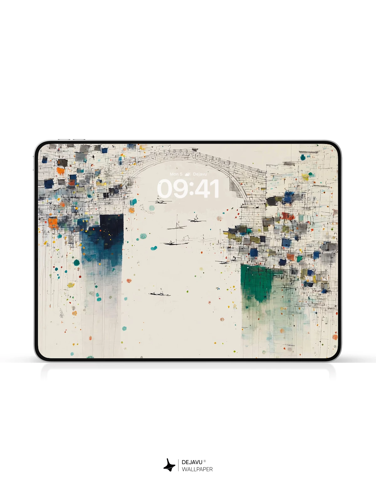 Inspired by the poetic stillness of traditional East Asian landscapes, this abstract artwork reimagines a stone arch bridge over a quiet river, rendered with delicate brushwork and colorful speckles. The composition blends minimalism with expressive detail, evoking a sense of calm and introspection. Ideal for 8K wallpaper on iPhone, Android, and tablets, it transforms your device into a canvas of timeless elegance.
